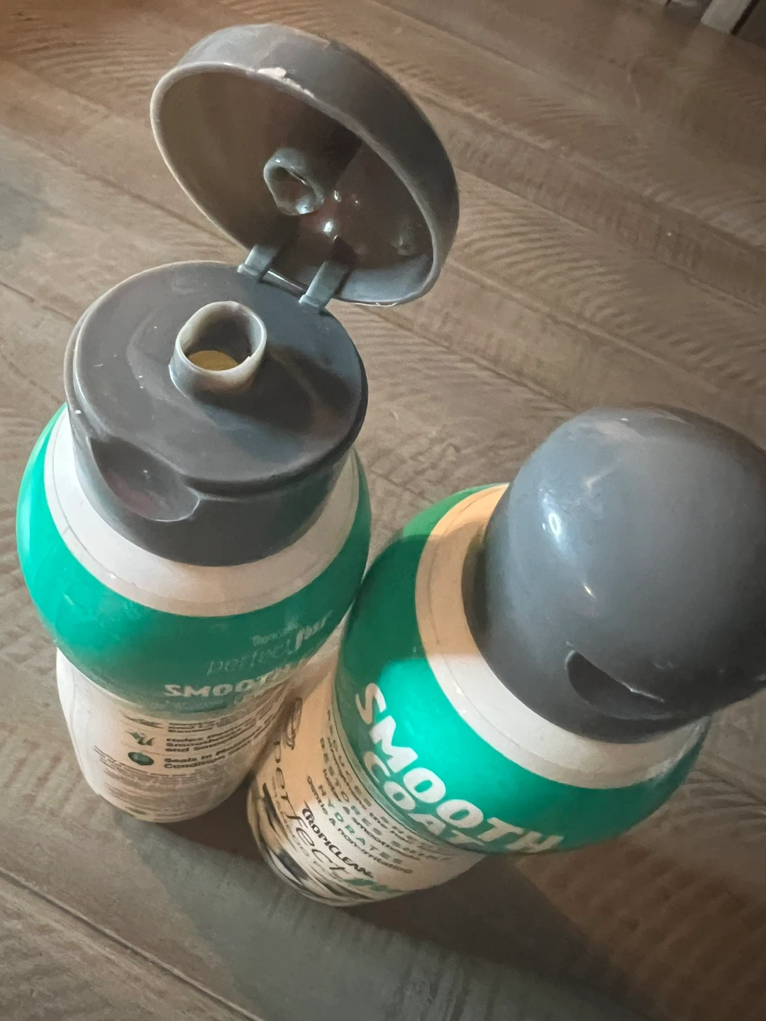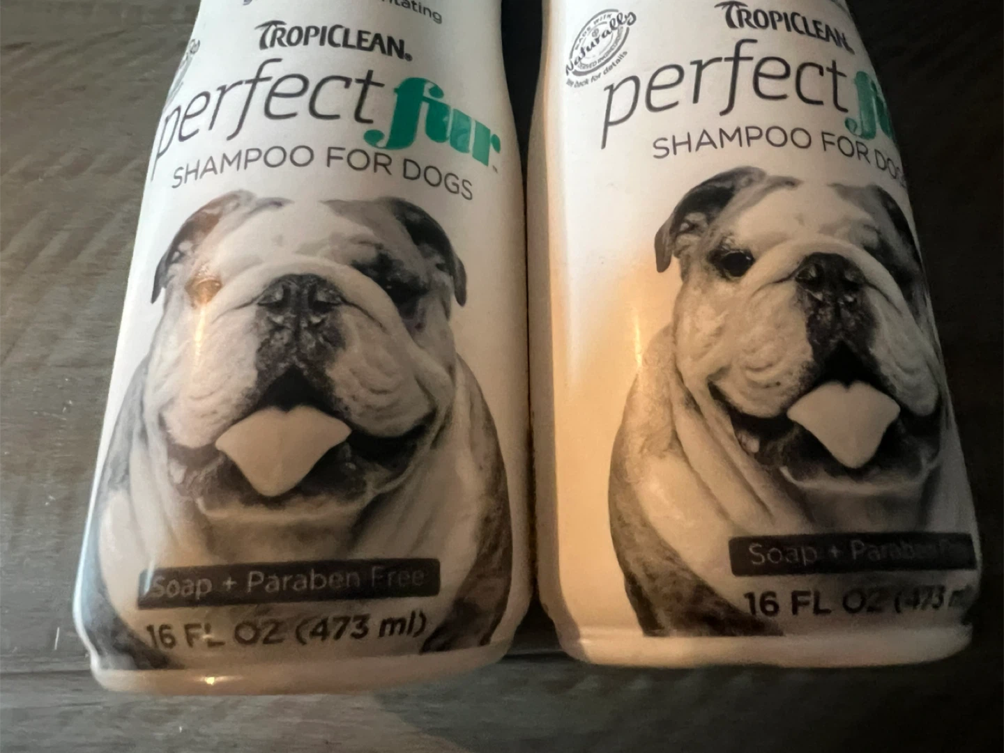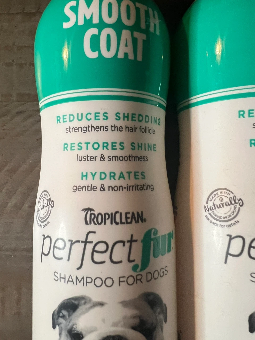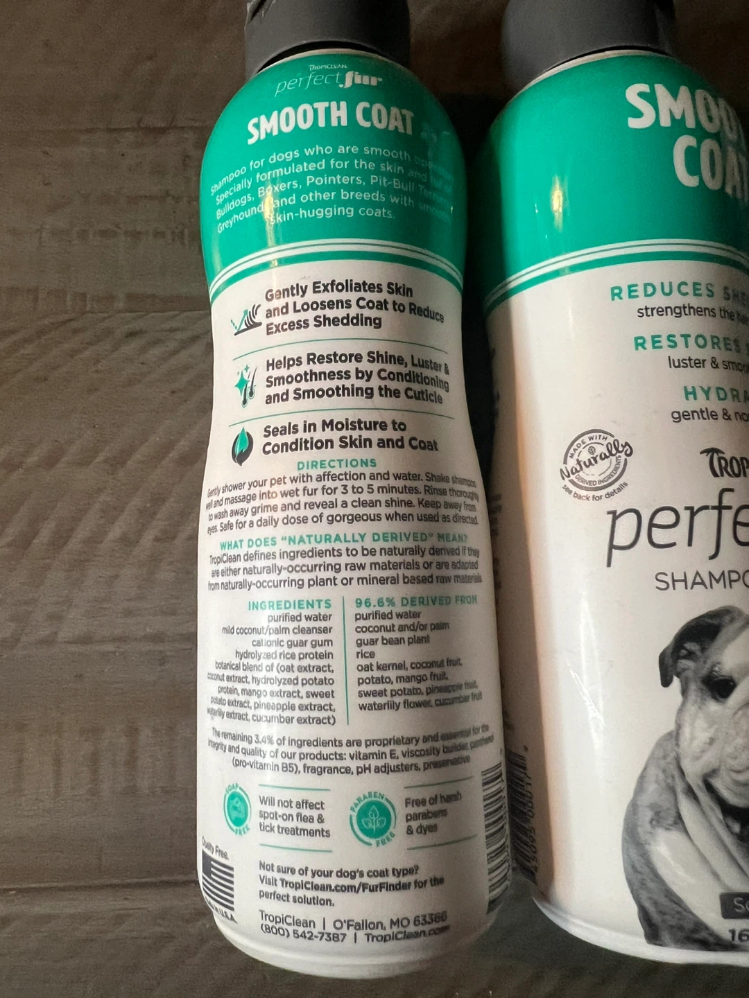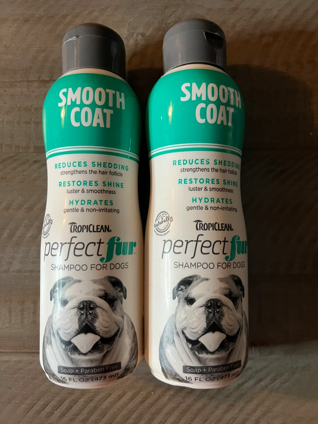 I'm selling two bottles of Tropiclean Perfect Fur Smooth Coat shampoo for dogs. Each bottle contains 32 fl oz (473 ml). This shampoo is specially formulated for smooth coats and helps to reduce shedding and restore shine. It also hydrates the skin and is gentle and non-irritating