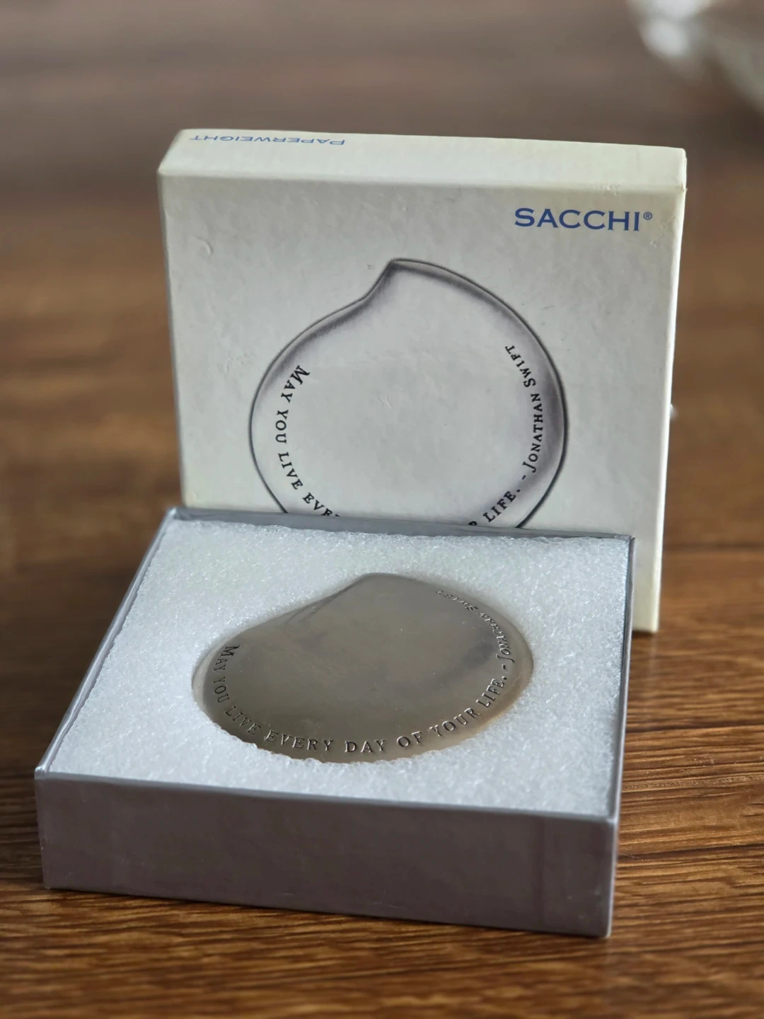 Selling a brand new Sacchi paperweight featuring a quote from Jonathan Swift: "May you live every day of your life". It comes in its original box and packaging, making it a lovely piece for your desk or a thoughtful gift