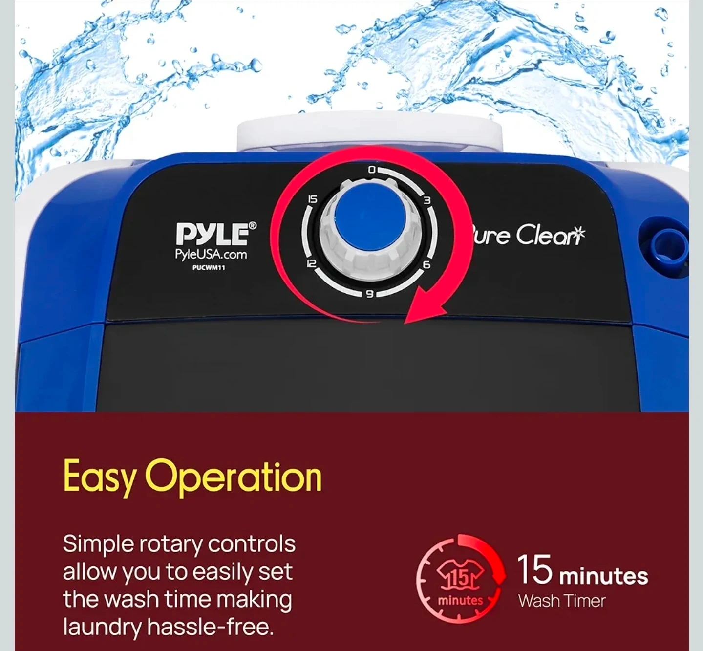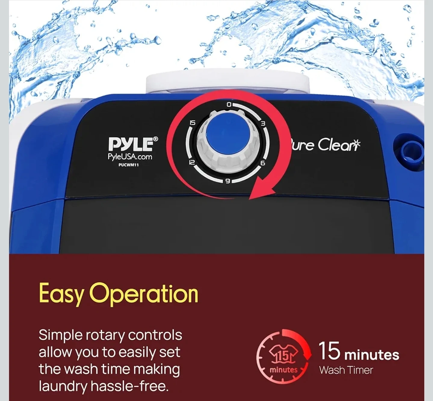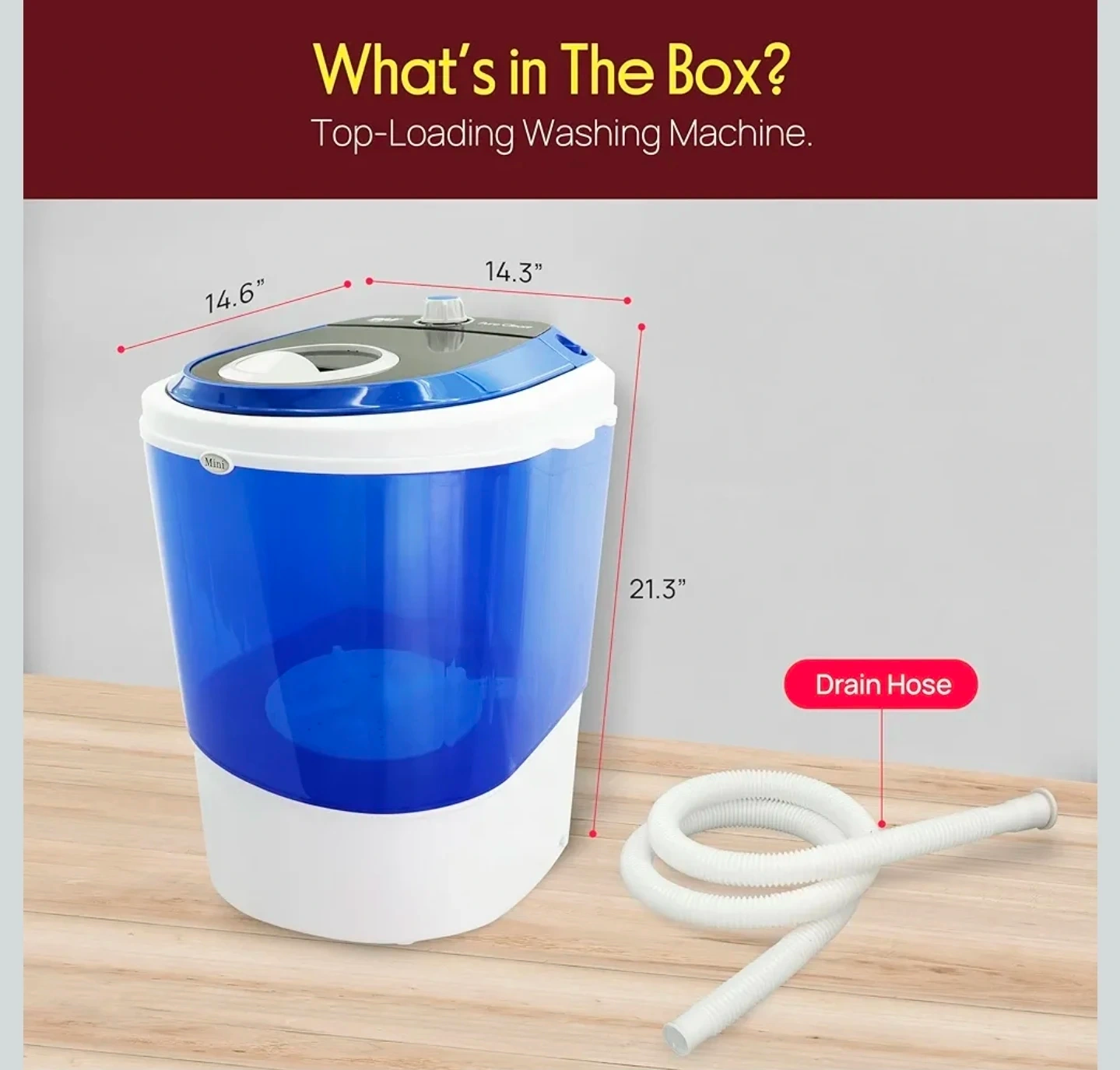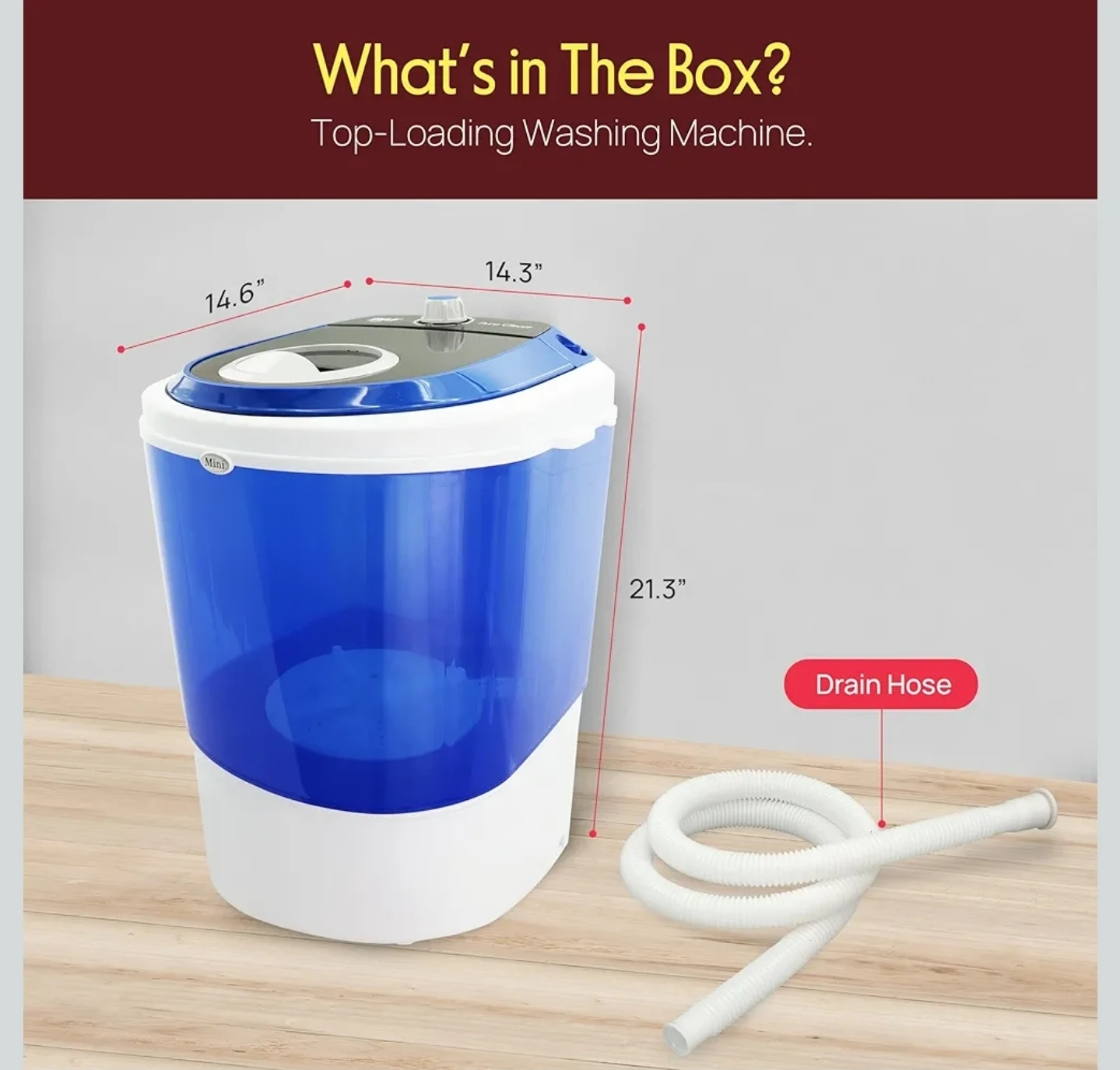 It also has simple rotary controls to easily set the wash time, making laundry hassle-free! The dimensions are 14.6" x 14.3" x 21.3". Includes a drain hose!