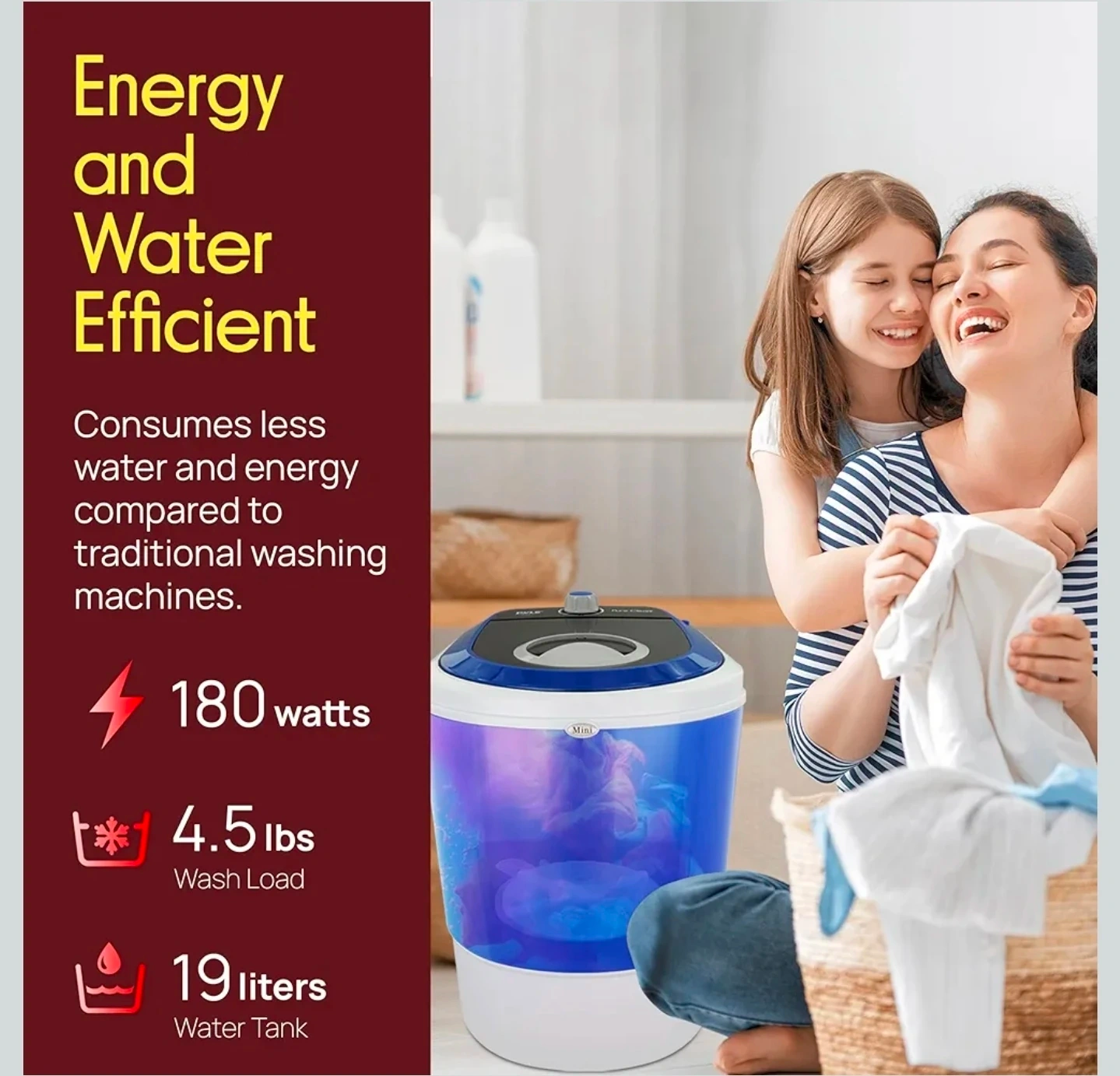 It's energy and water efficient, consuming less water and energy compared to traditional washing machines.