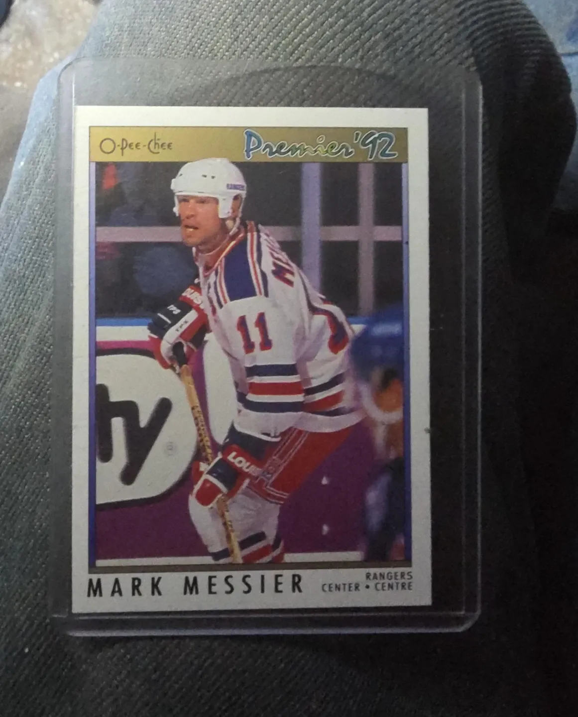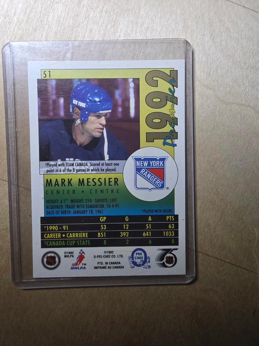 Selling a Mark Messier 1992 O-Pee-Chee Premier '92 hockey card. He played with Team Canada and scored at least one point in 6 of the 8 games in which he played. He's listed as a Center for the New York Rangers. Acquired trade with Edmonton, 10-4-91. Great for any hockey card collector!