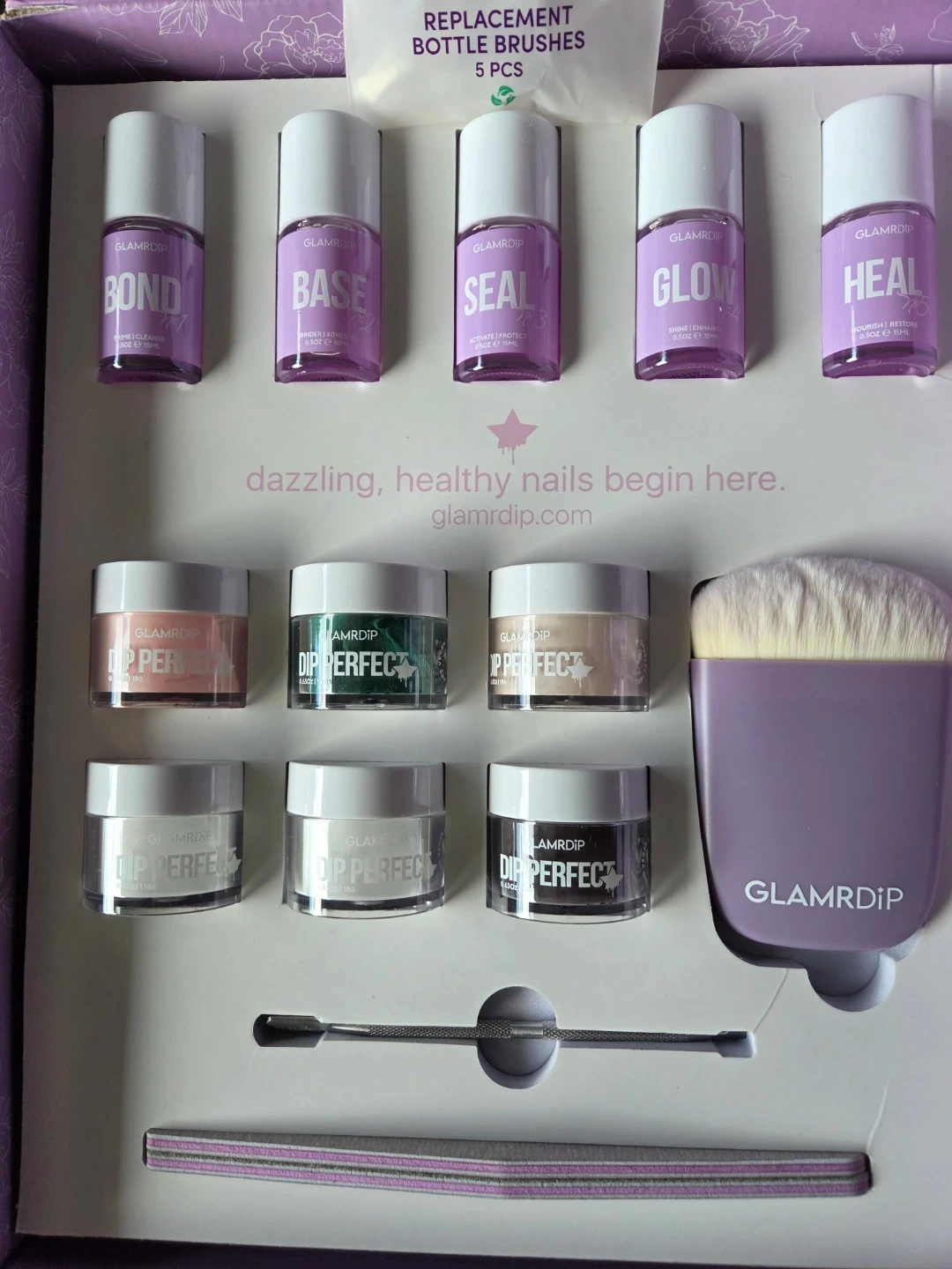 Selling a brand new Glamrdip Dip Perfect System Kit! It includes the essentials like Bond, Base, Seal, Glow, and Heal liquids, along with a variety of Dip Perfect powders in different colours. Nail file x 2, metal cuticle stick, remover bowl, and remover also included. The kit also comes with replacement bottle brushes and instructions. **The remover bottle leaked during shipping, so there is approximately 2/3 of a bottle remaining.
