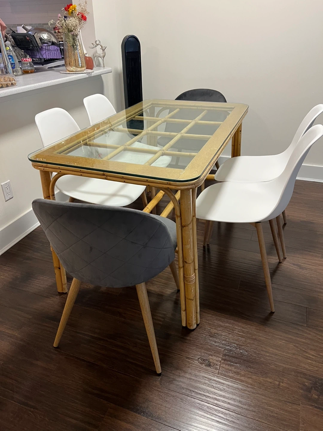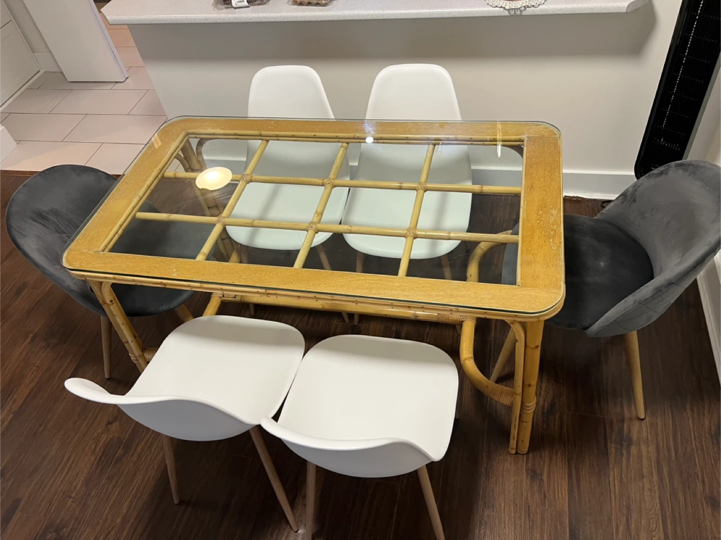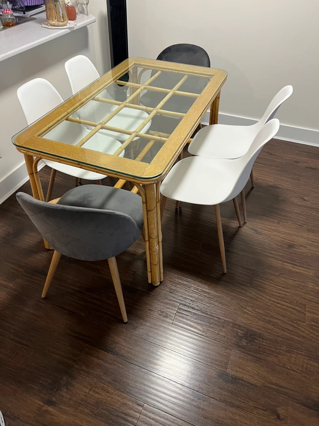 Selling a dining table with six chairs. The table features a glass top and a rattan frame, giving it a unique and stylish look. There are four white chairs and two grey chairs included. Perfect for a dining room or kitchen!