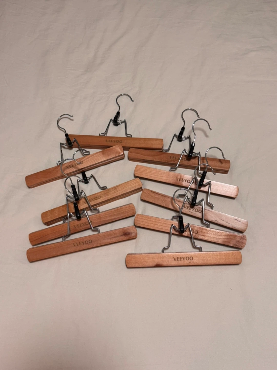 Selling a set of 10 Veeyoo wooden pant hangers! These hangers are great for keeping your pants wrinkle-free and organized. They're made of wood and have a sturdy metal clip.