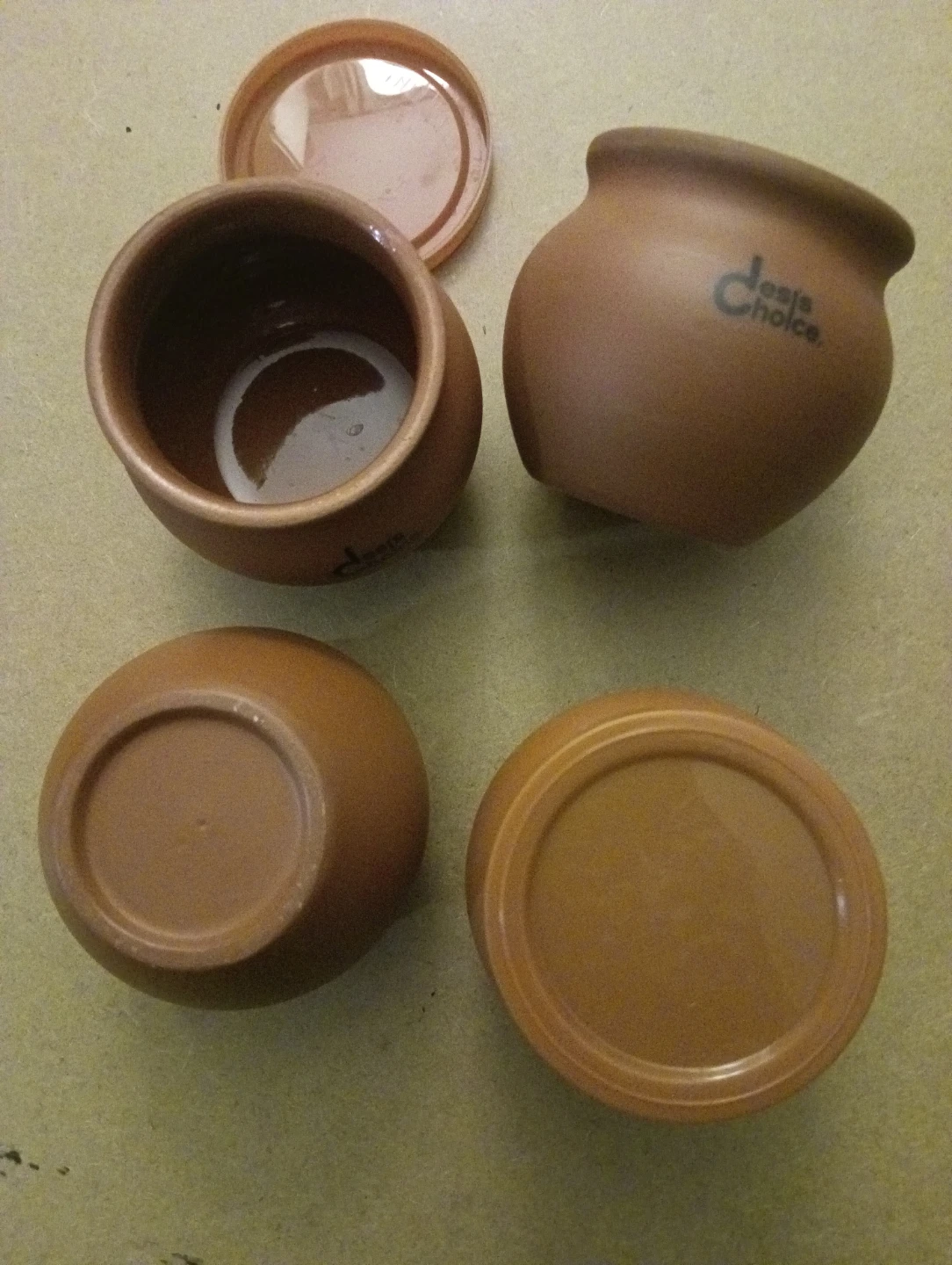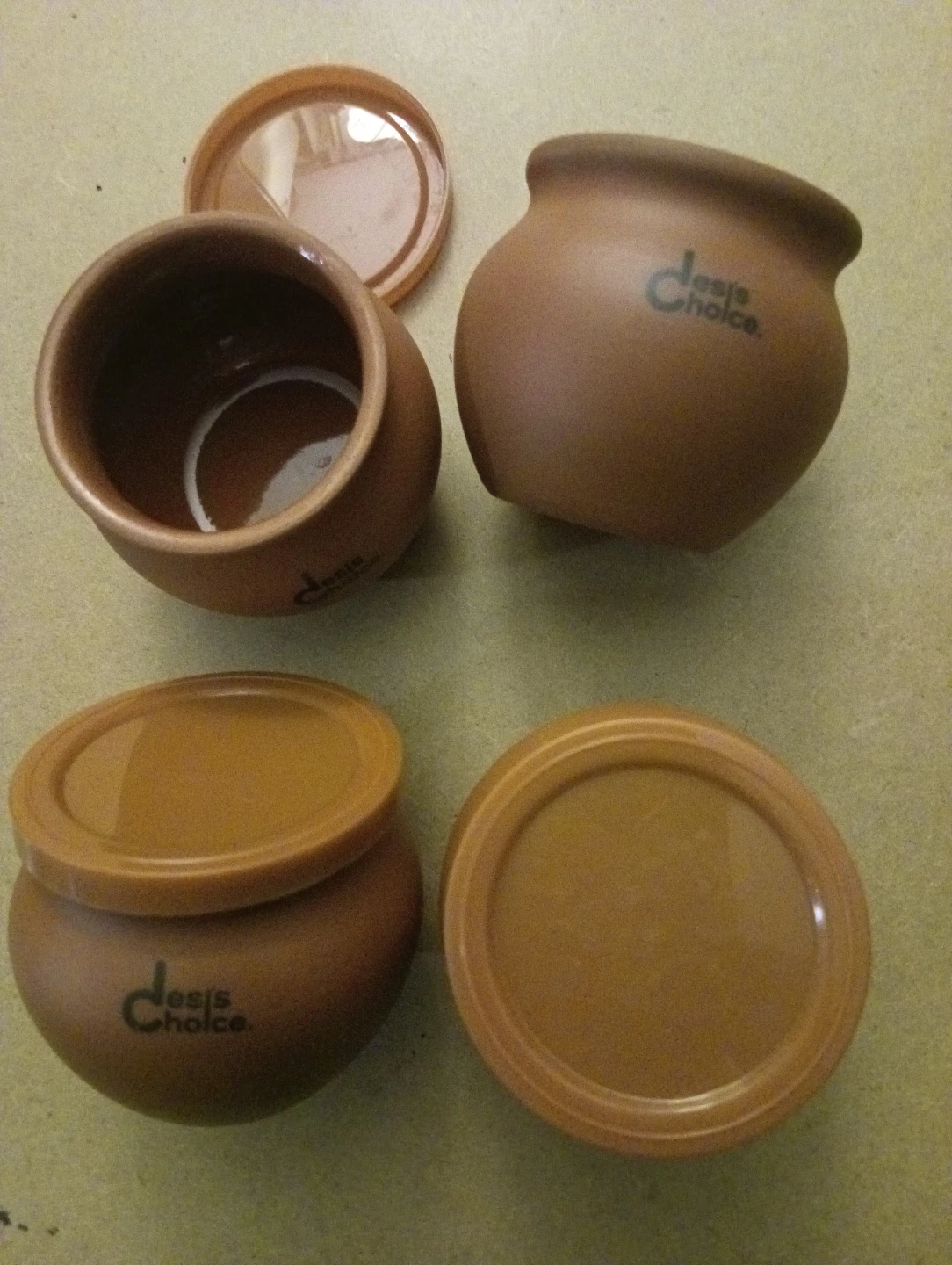 I'm selling a set of four Desi's Choice clay pots, each with its own lid. They're in great condition and ready for a new home! These pots are perfect for storing spices or small items around the house.