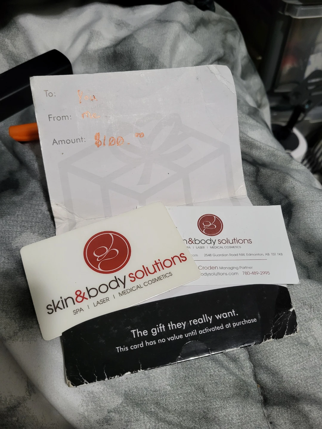 Selling a $100 gift card for Skin & Body Solutions. It's perfect for spa treatments, laser services, or medical cosmetics at their Edmonton location.