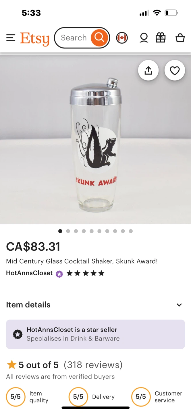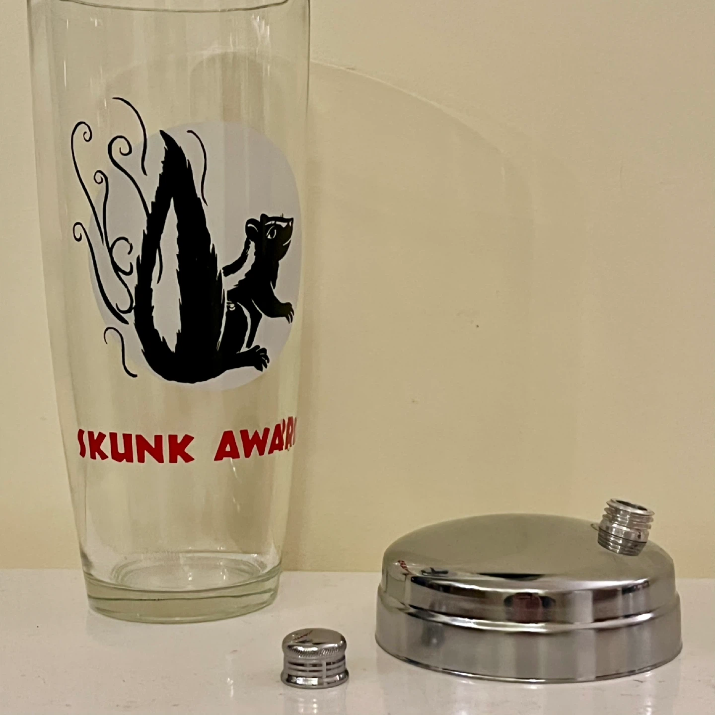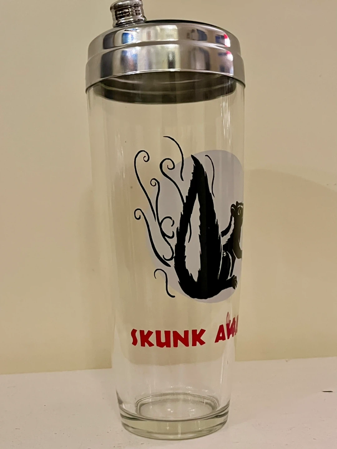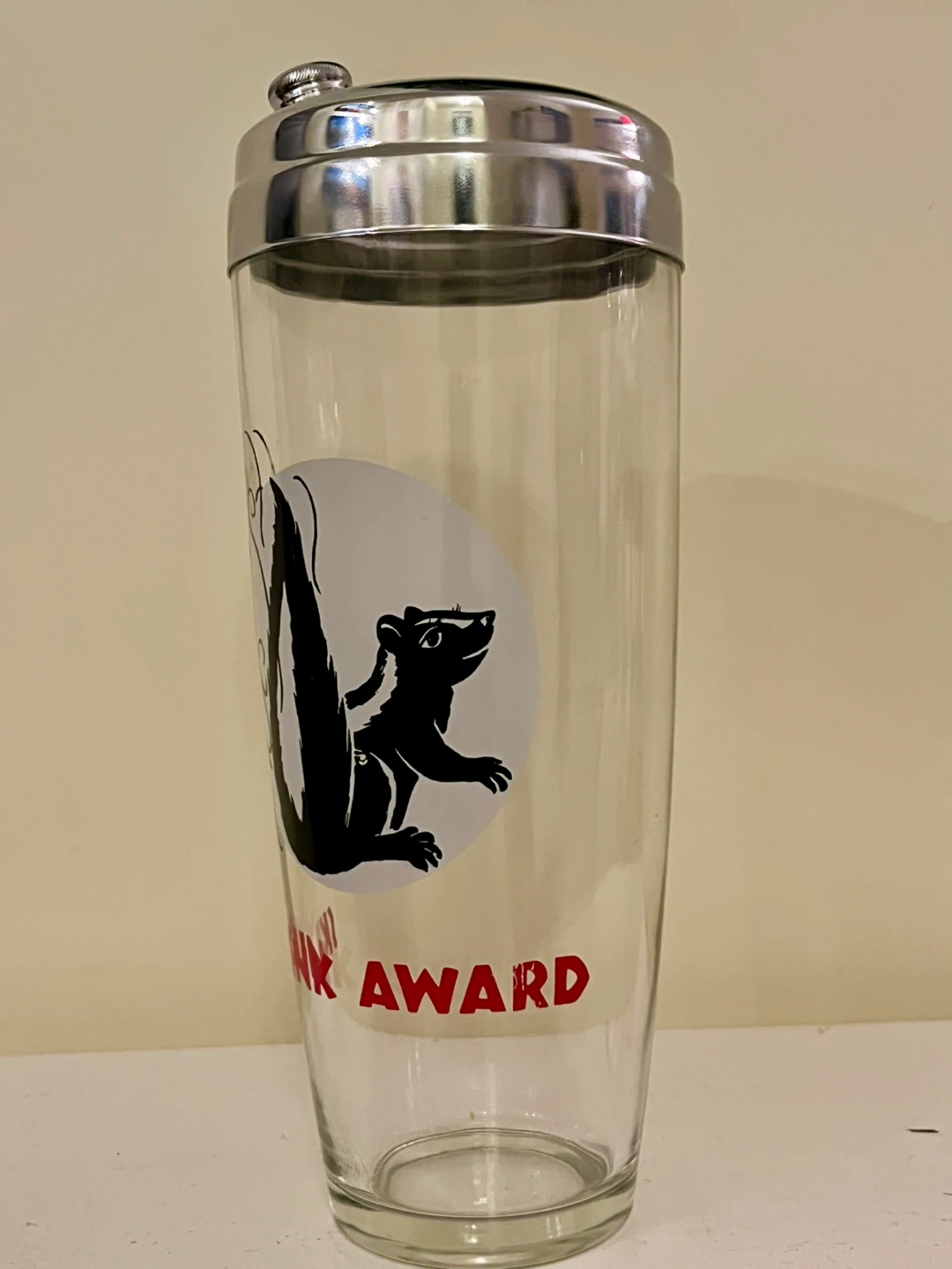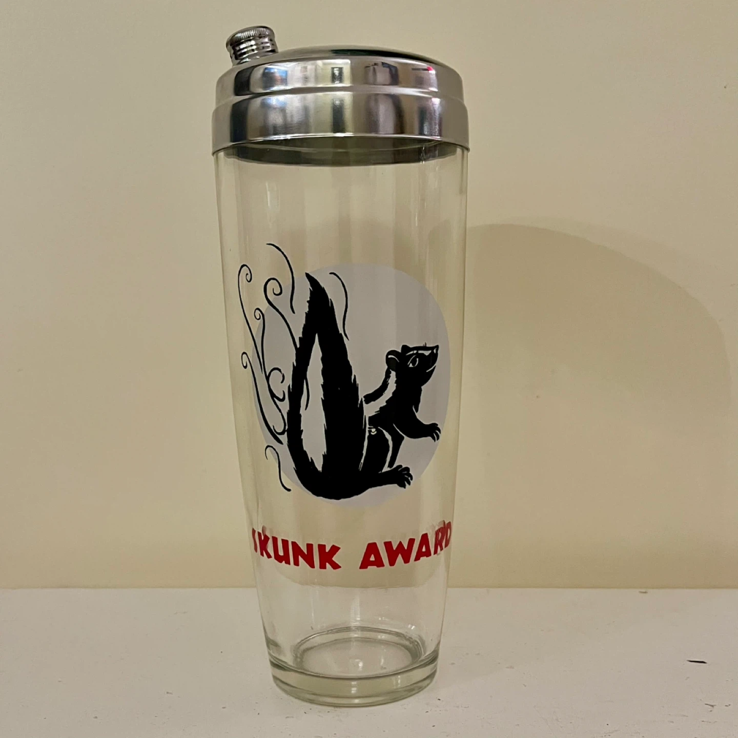 RARE Mid Century Glass and chrome Cocktail Shaker - Skunk Award. A "skunk award" typically refers to a humorous or tongue-in-cheek recognition given to someone for a failure or mistake, often in a lighthearted context. It can also denote an overwhelming defeat in a game or competition.