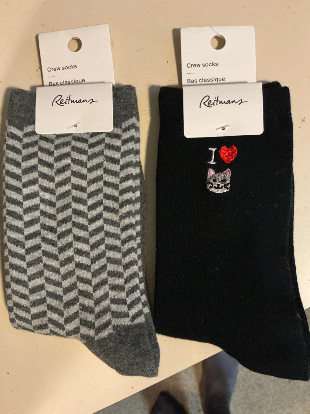 Selling a set of two crew socks from Reitmans. One pair is grey with a chevron pattern, and the other is black with an 'I love cats' design. They are brand new and never been worn.