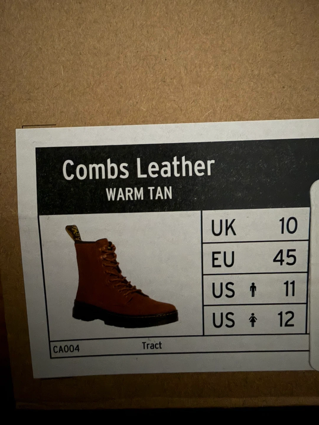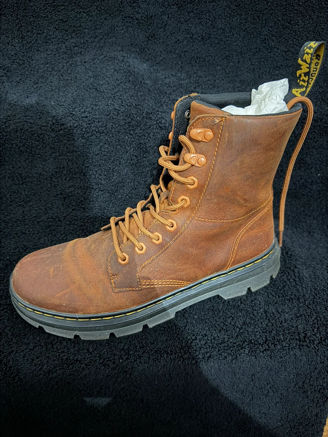 Selling a pair of Dr. Martens Combs Leather boots in warm tan. These are a US size 11. They come with the box!