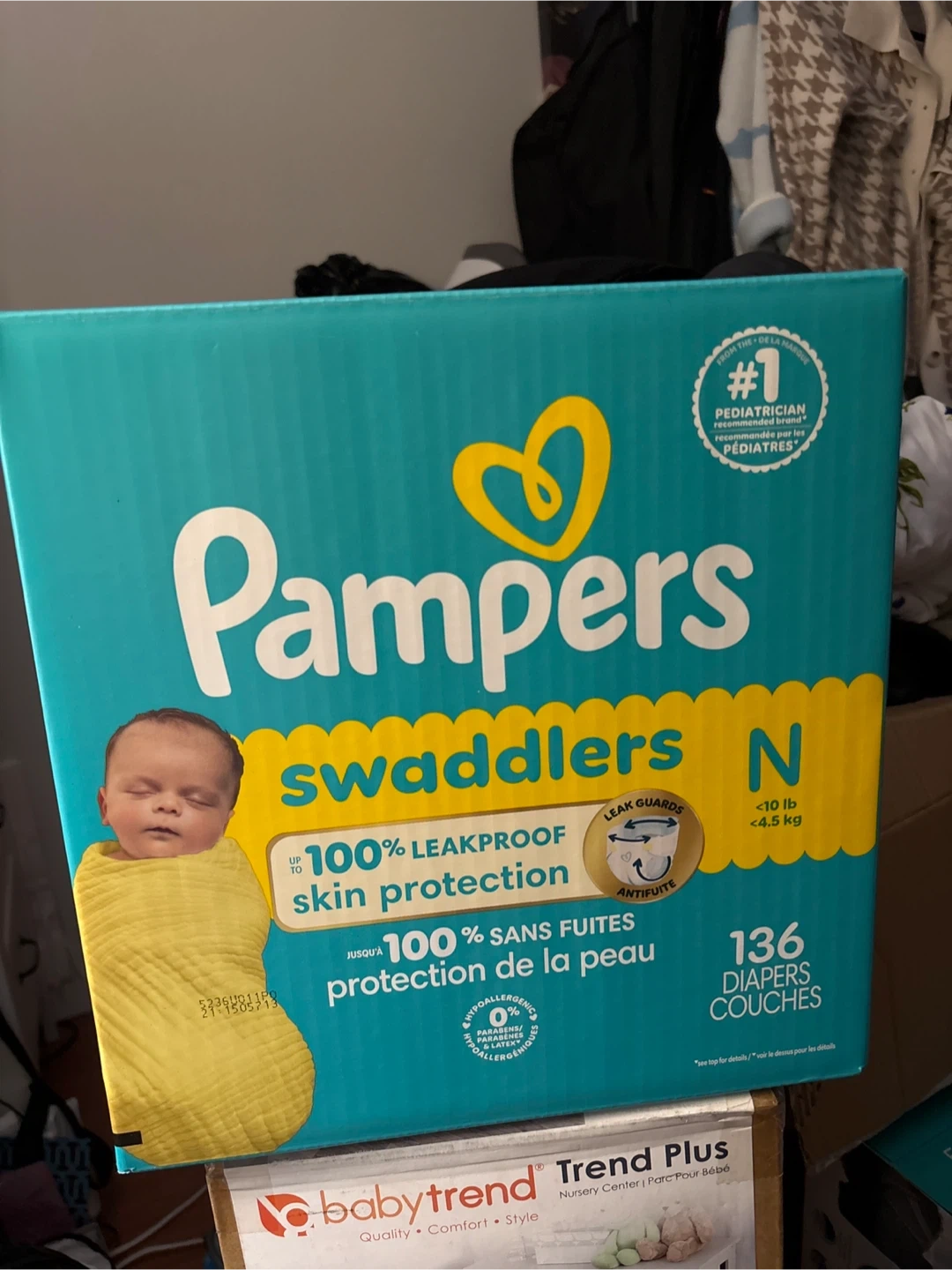 Selling a box of Pampers Swaddlers diapers, size N (Newborn), up to 10 lbs or 4.5 kg. The box contains 136 diapers. They offer 100% leakproof skin protection