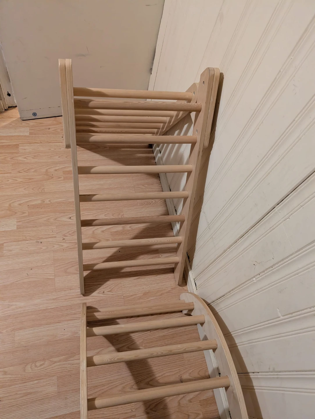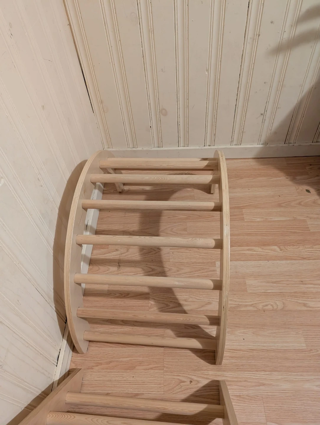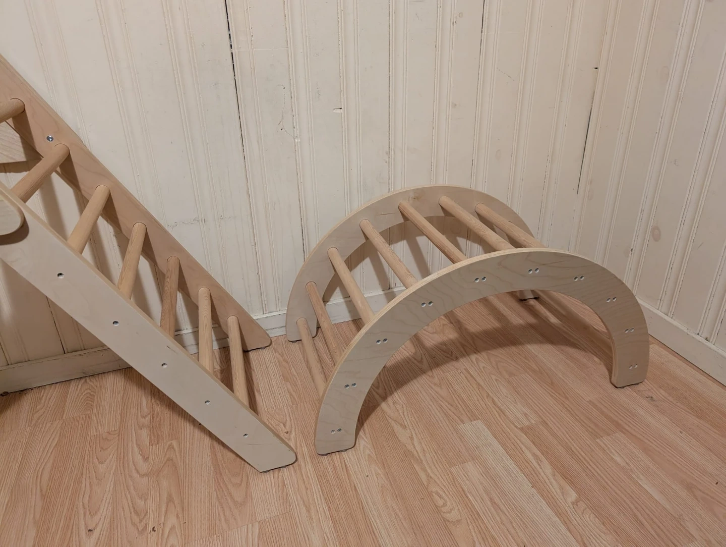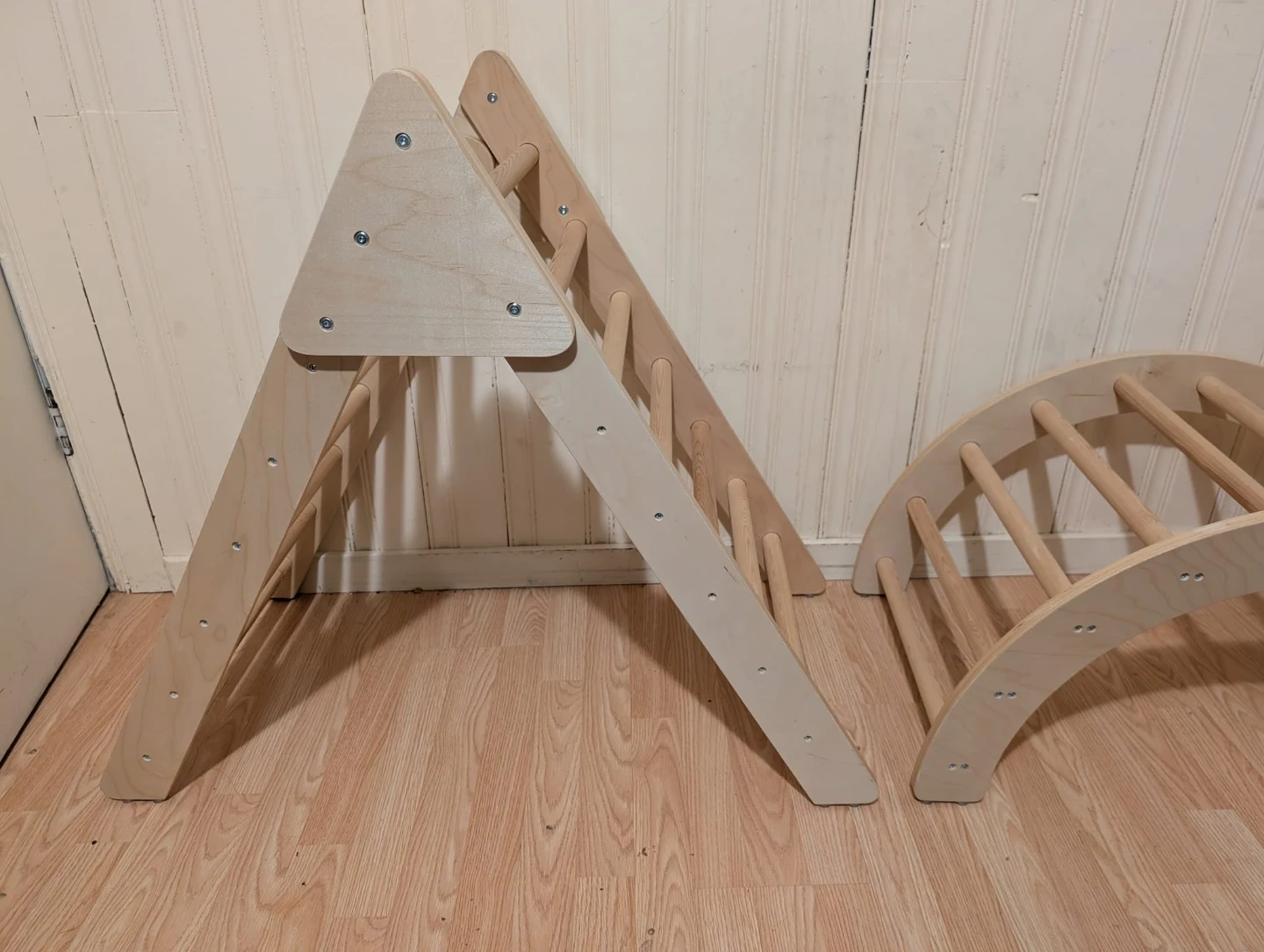 Selling a wooden climbing triangle and rocker set for kids! It's in great condition and perfect for indoor play. Your little ones will love climbing and exploring with this fun set