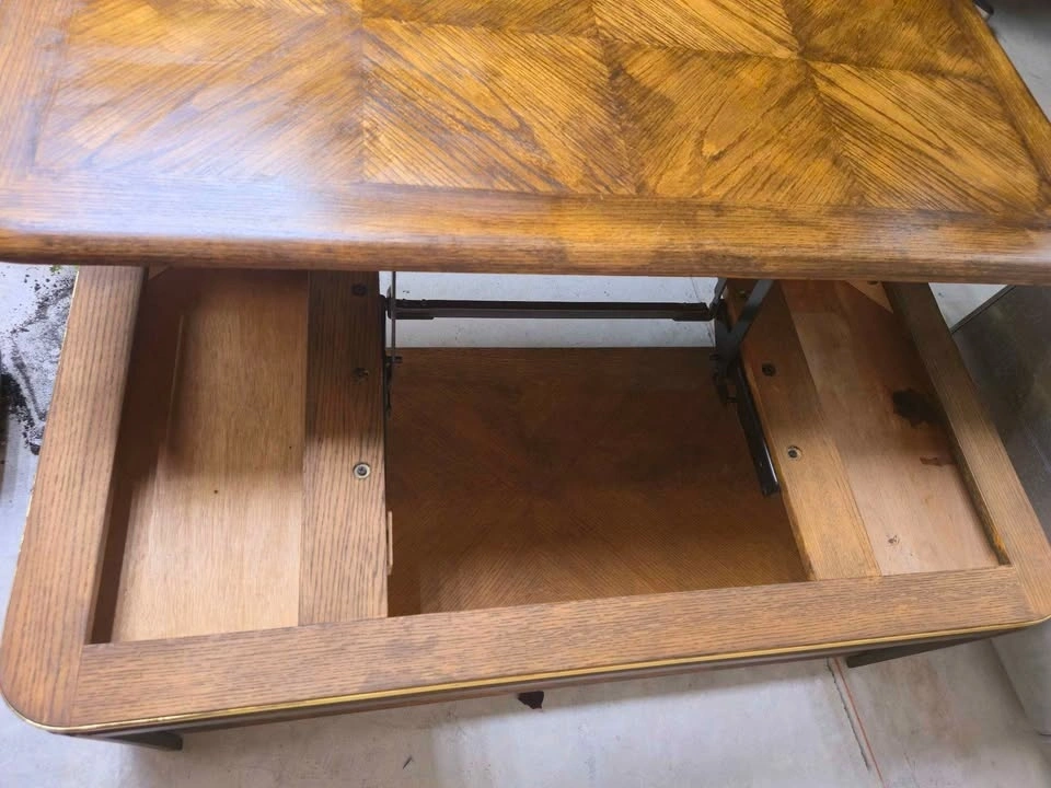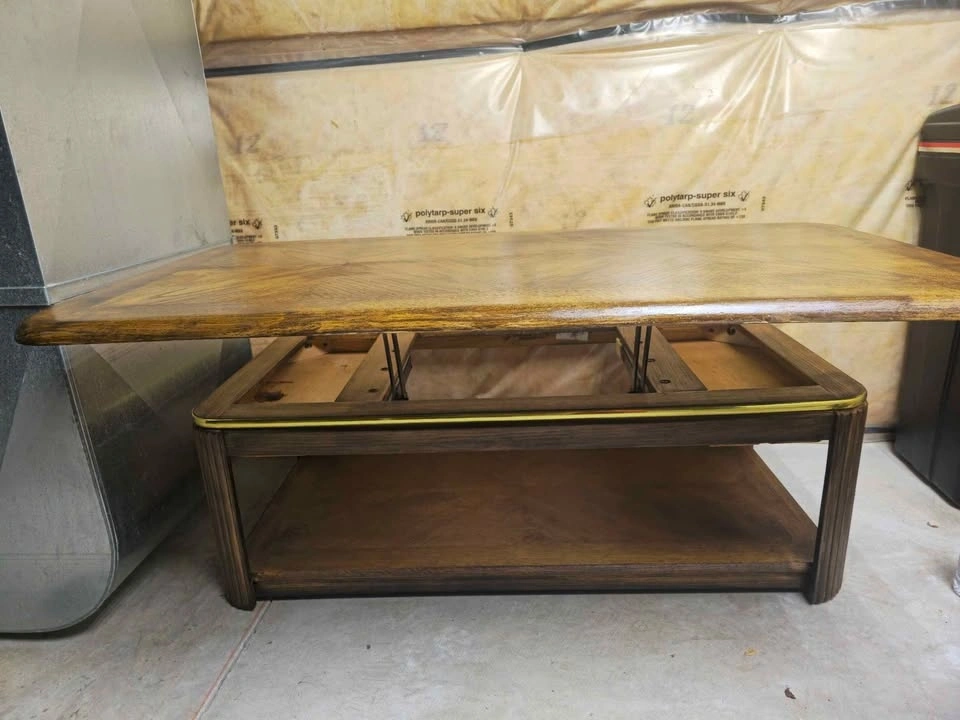 Coffee table that lifts up and has storage compartments underneath the lid. It can be used as a table and is perfect for someone who eats on their couch with limited space for a dining room table.