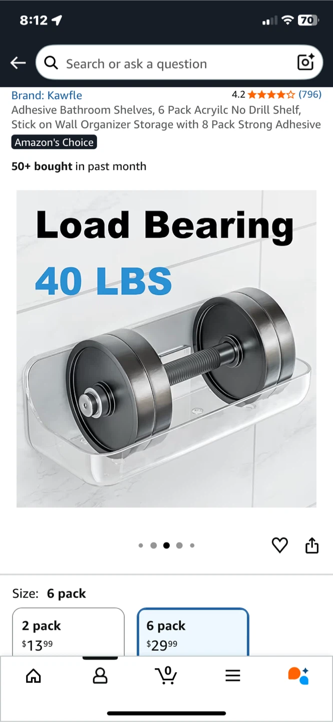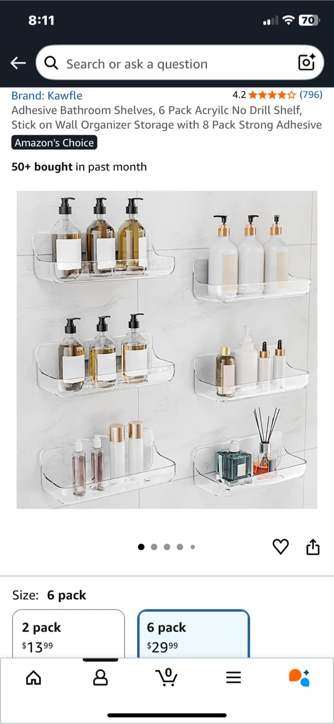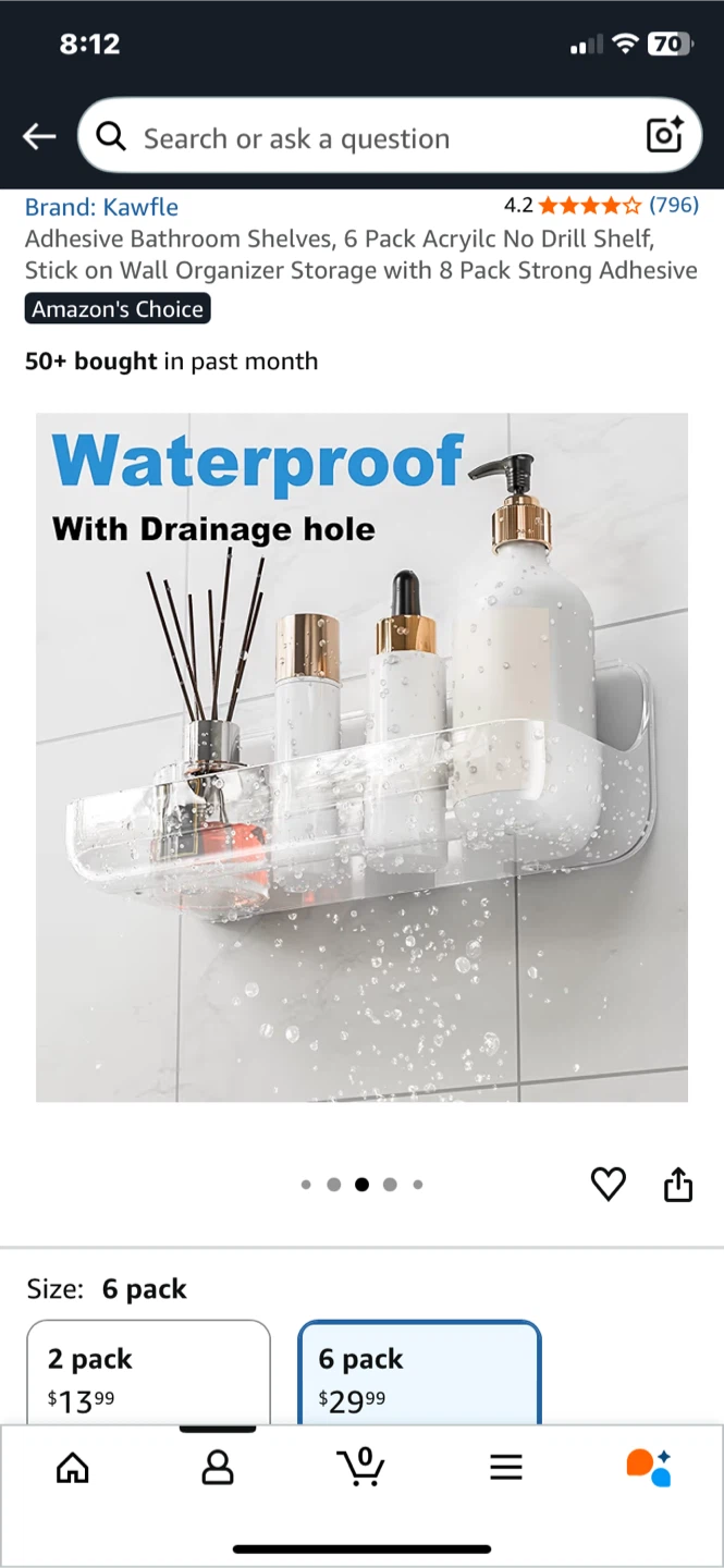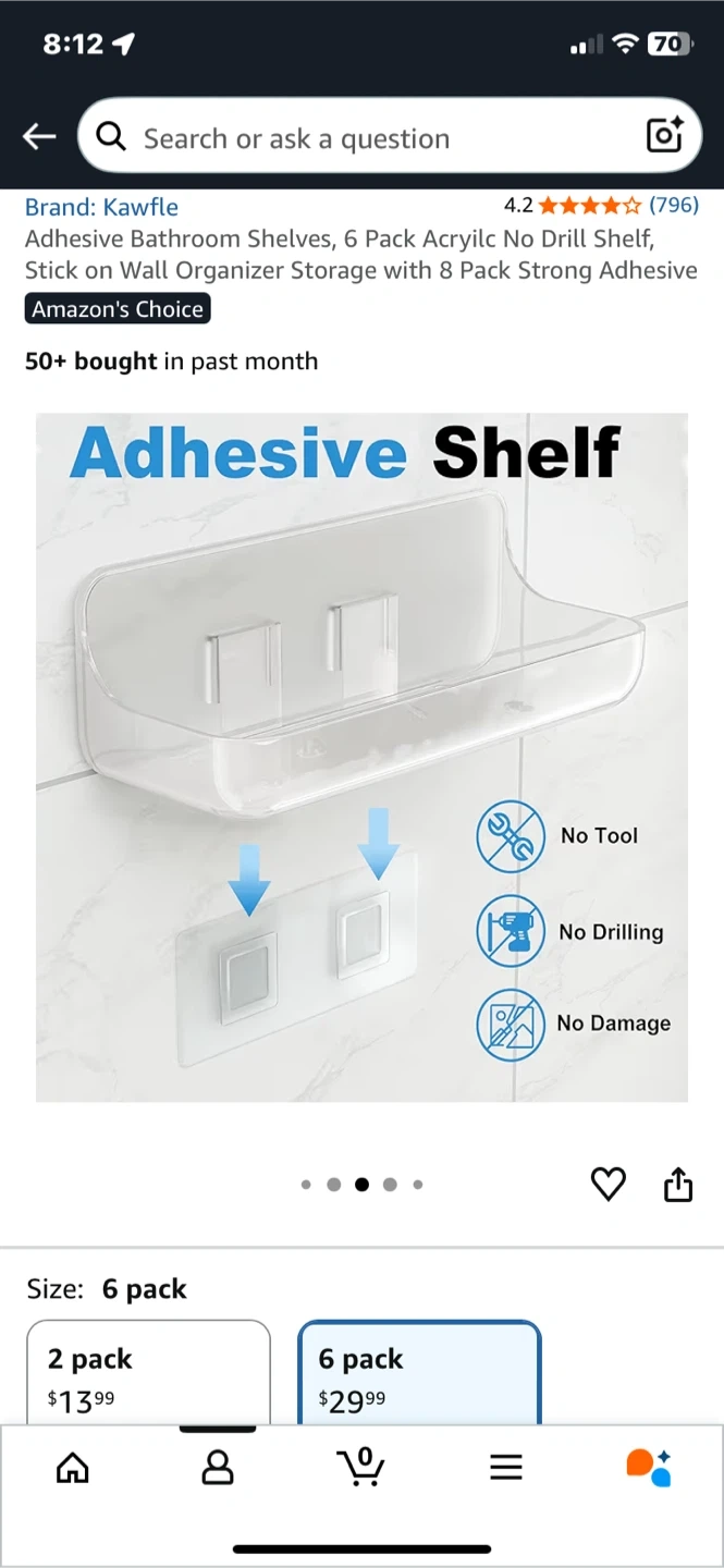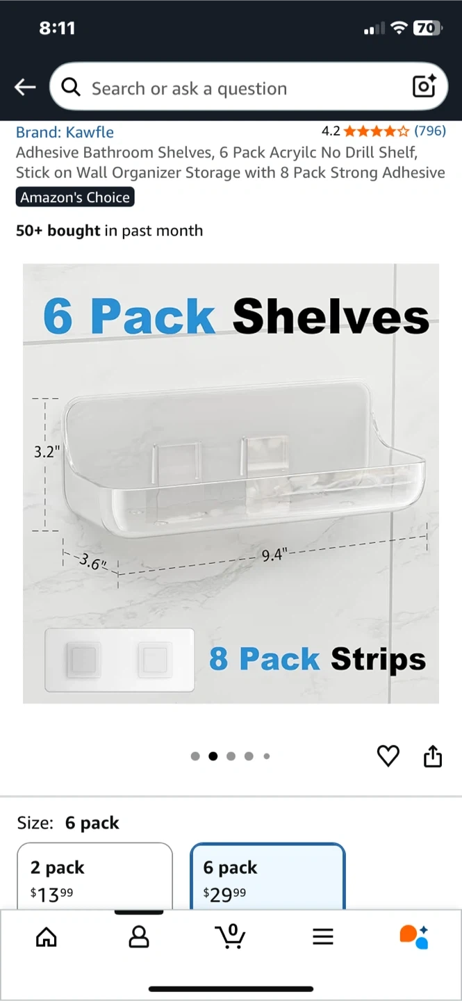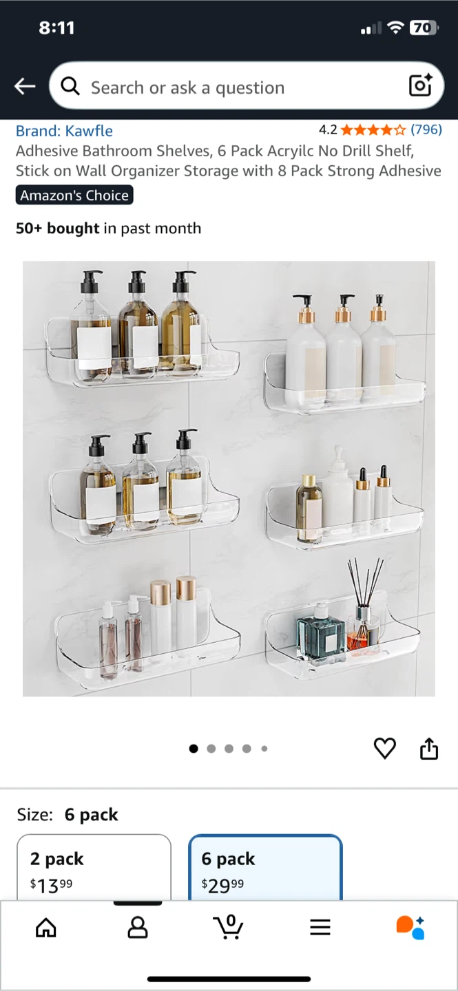 Selling a 6-pack of Kawfle adhesive bathroom shelves. These are perfect for adding some extra storage in your bathroom without any drilling or tools! They're waterproof and can hold up to 40 lbs. Great for organizing your soaps, shampoos, and other bathroom essentials