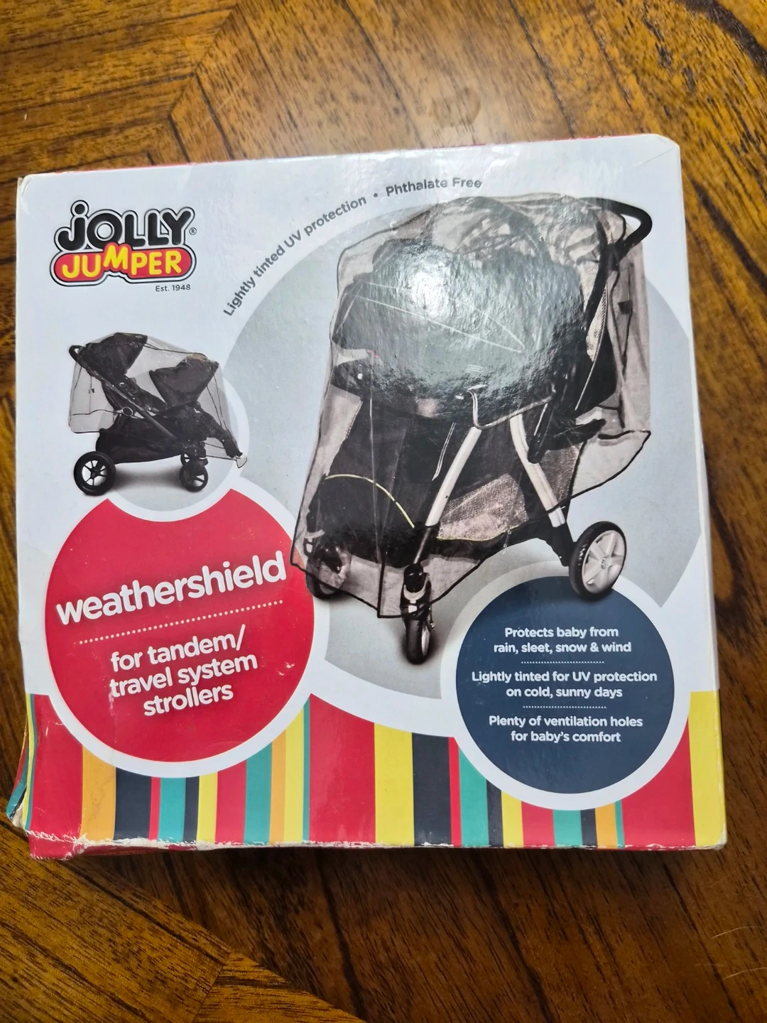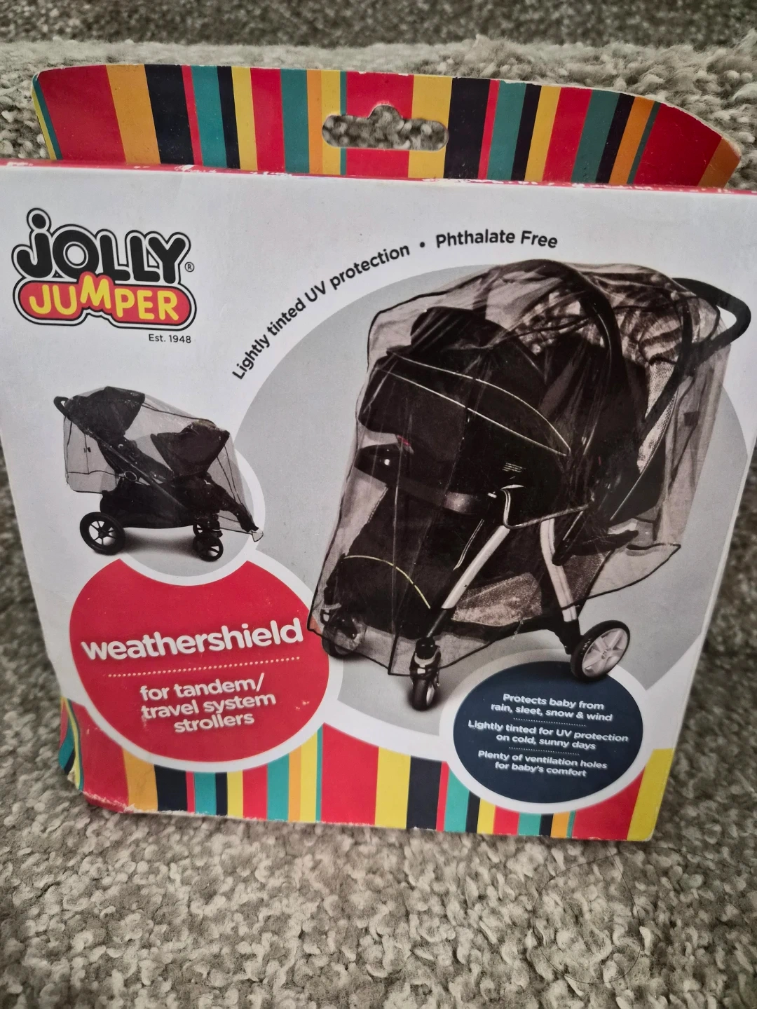 Keep your little ones protected from the elements with this Jolly Jumper Weathershield! It's designed for tandem/travel system strollers and protects baby from rain, sleet, snow, and wind. It also has lightly tinted UV protection for those cold, sunny days, plus plenty of ventilation holes for baby's comfort