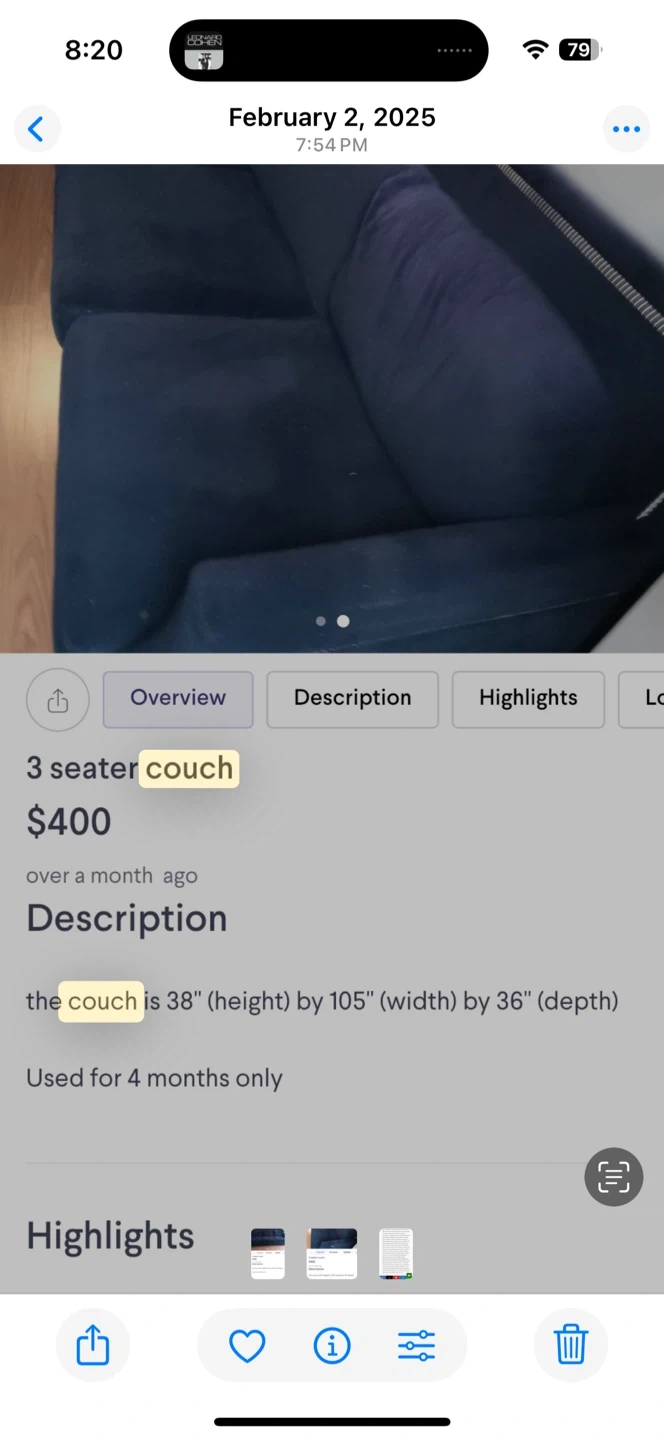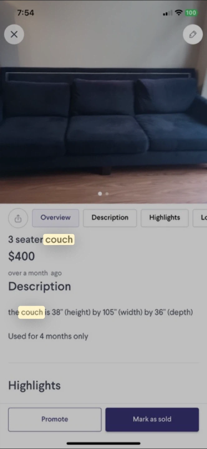 Selling a 3-seater couch! It's in great shape and was only used for 4 months. The dimensions are 38 inches (height) by 105 inches (width) by 36 inches (depth)