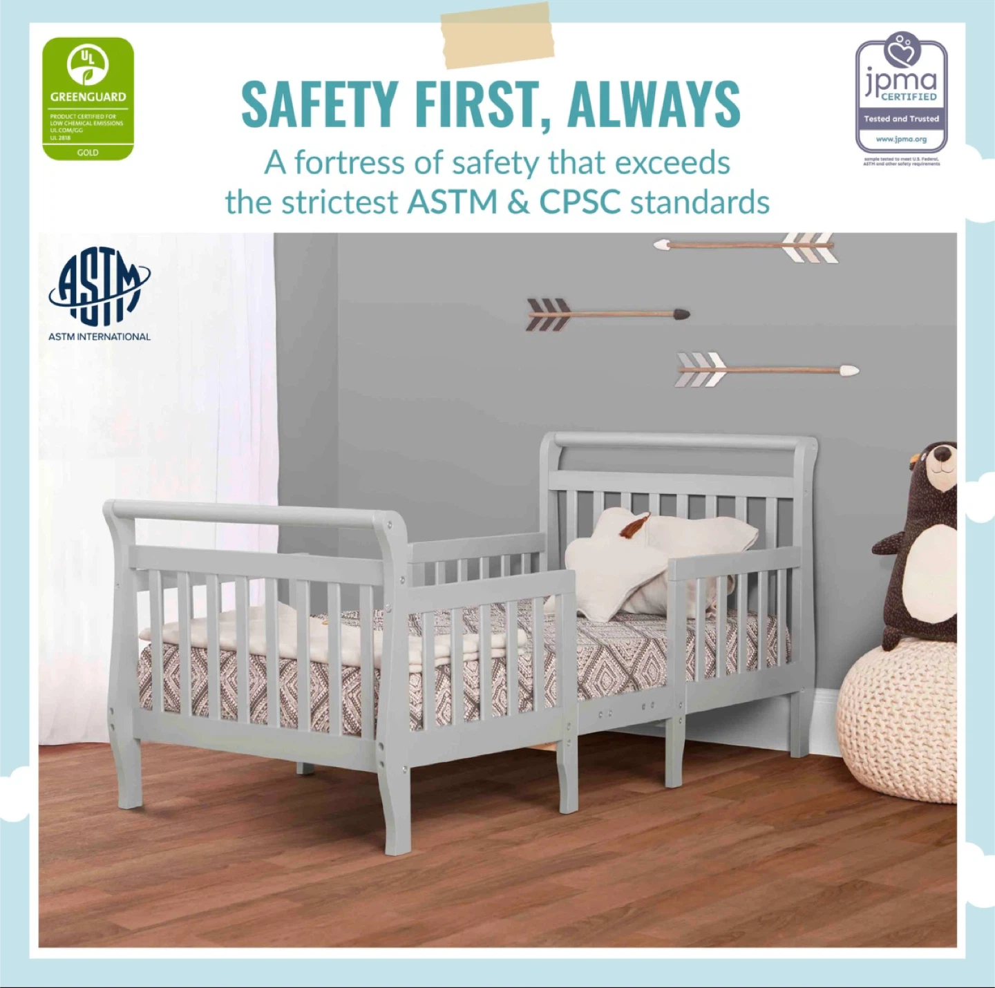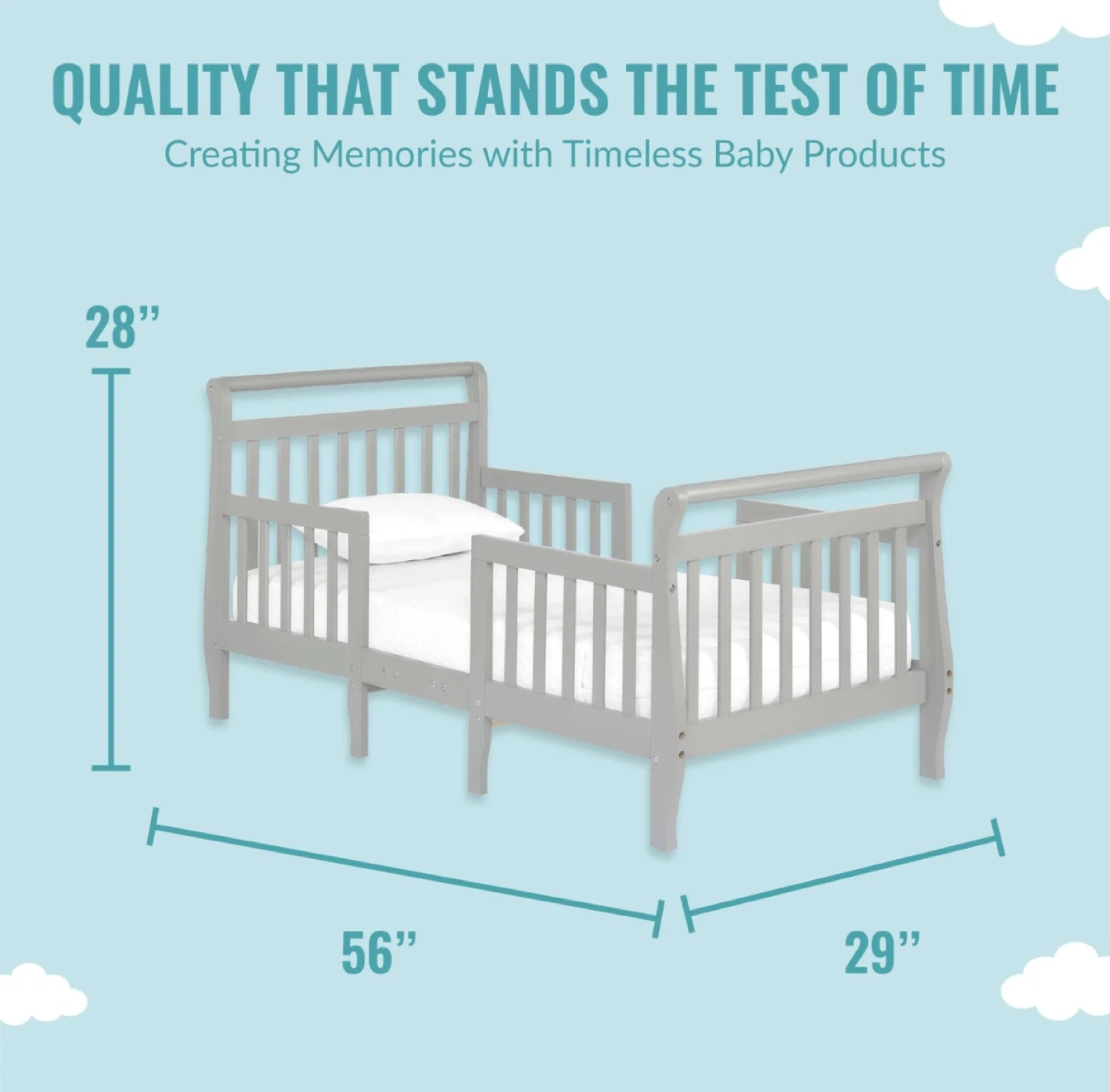 The bed measures 28" in height, 56" in length, and 29" in width, providing a comfortable and safe sleeping space for your little one.