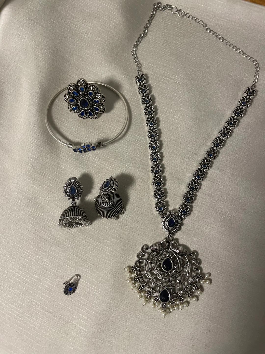 Selling a beautiful silver-tone jewellery set! It includes a necklace, earrings, a bracelet, and two rings. The set features lovely blue accents, making it a standout addition to any outfit