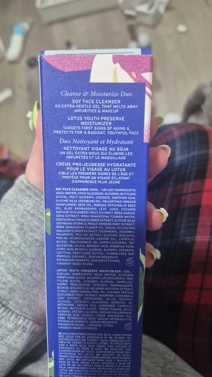 This is a Fresh Cleanse & Moisturize Duo, featuring the Soy Face Cleanser and Lotus Youth Preserve Moisturizer. The cleanser is an extra-gentle gel that melts away impurities and makeup. The moisturizer targets first signs of aging and protects for radiant, youthful face. Originally priced at $33 CAD