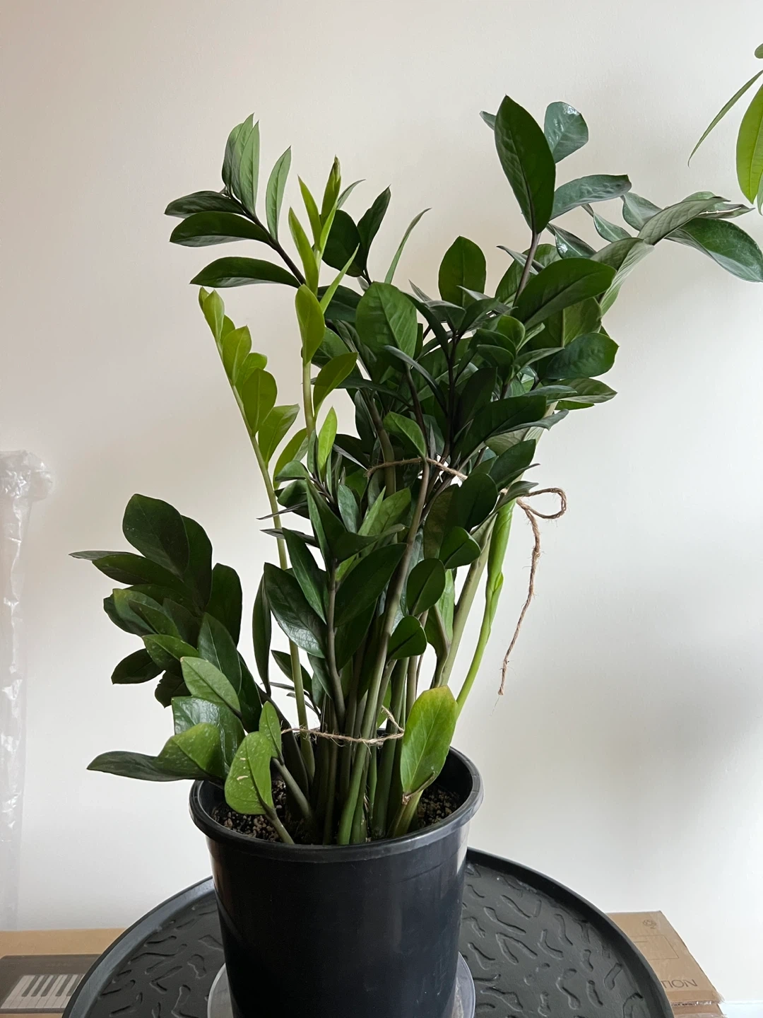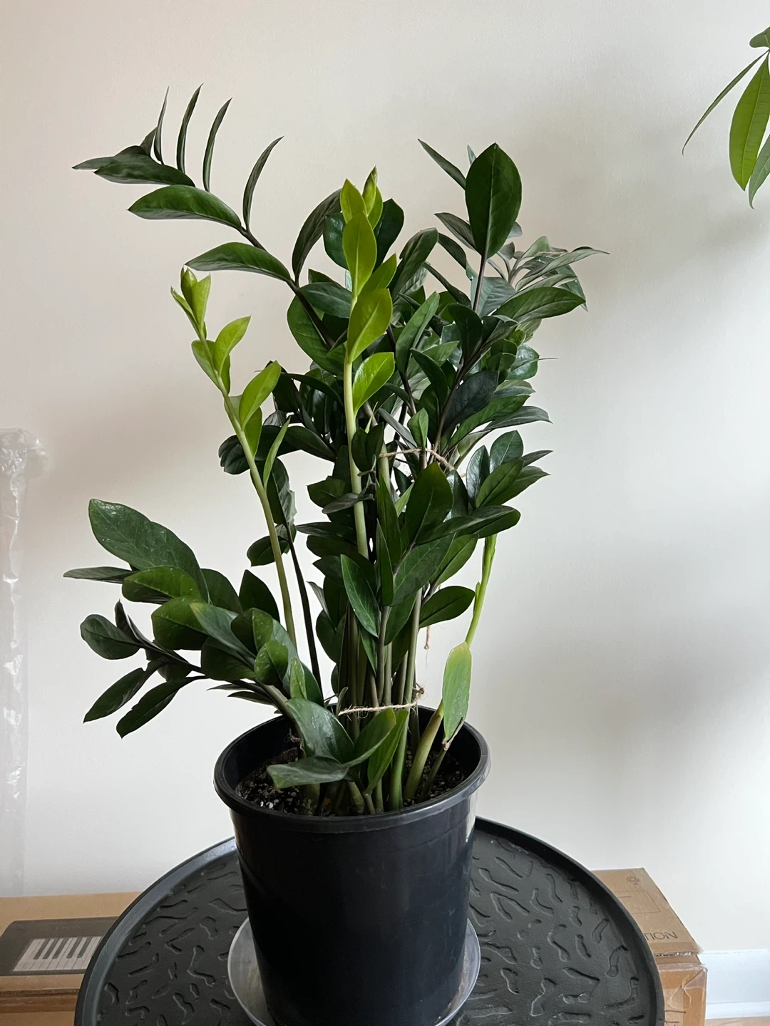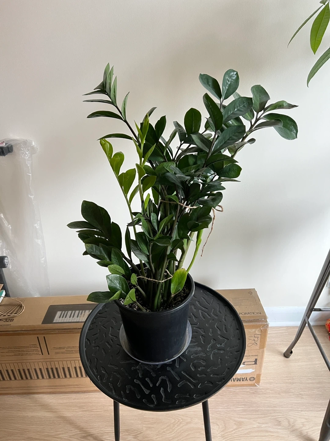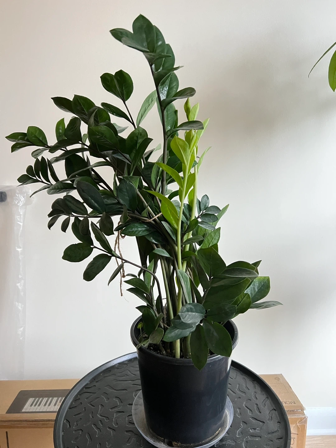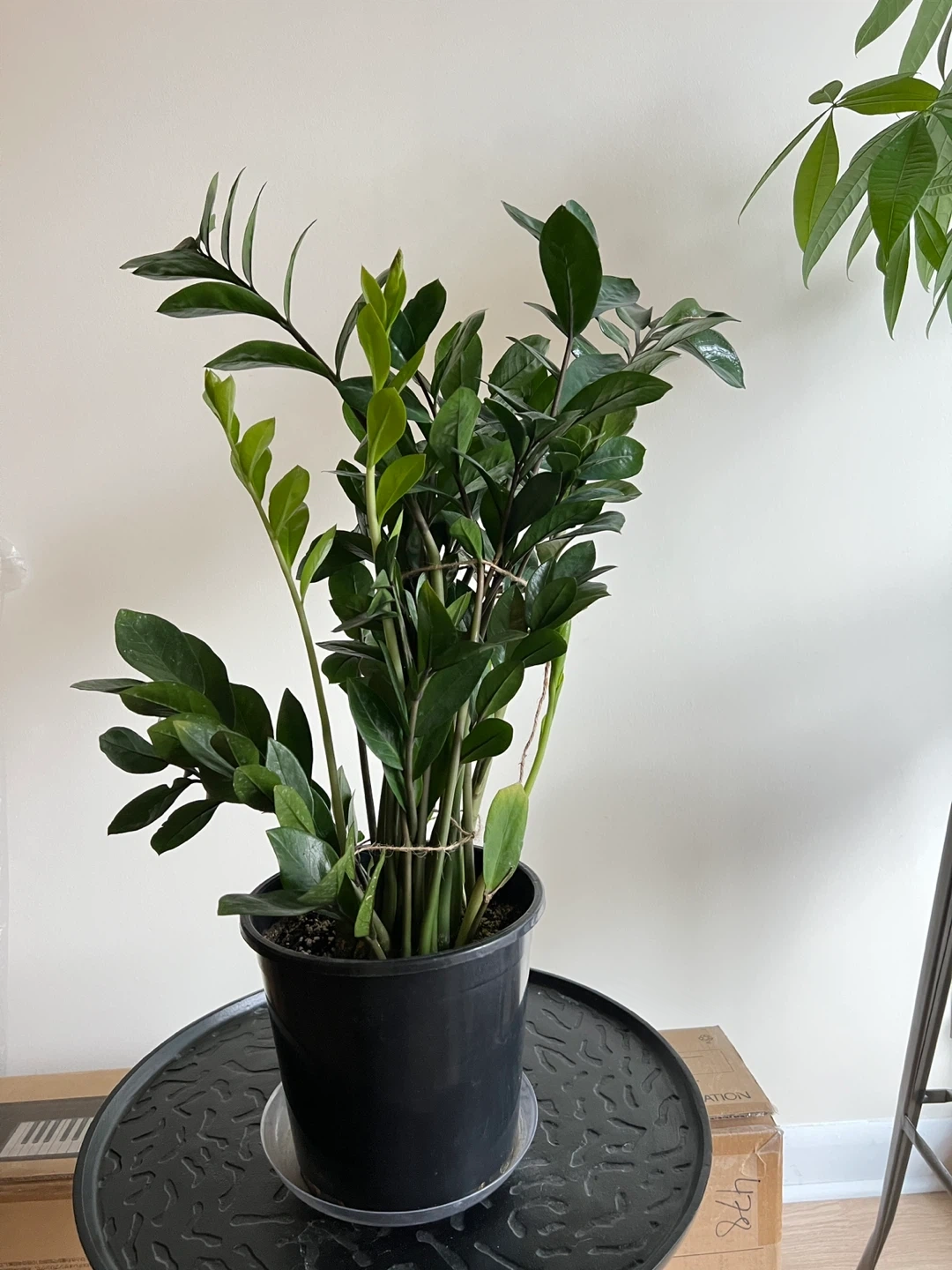 Large Zz plant that keeps growing. Healthy, never had pests. 28 inches tall measuring from the bottom of the pot. Easy to maintain. Needs watering like once a month. It is quite heavy. I’ve tied string around some of the stems to make it grow straight.