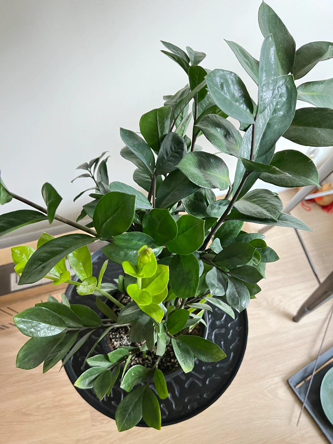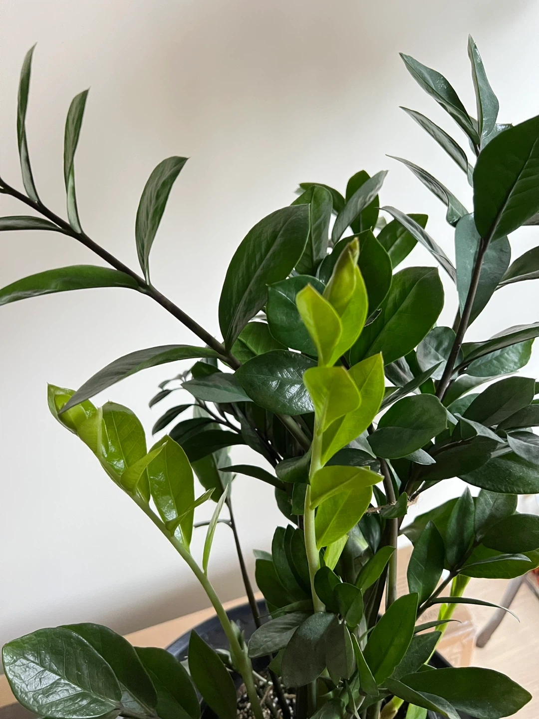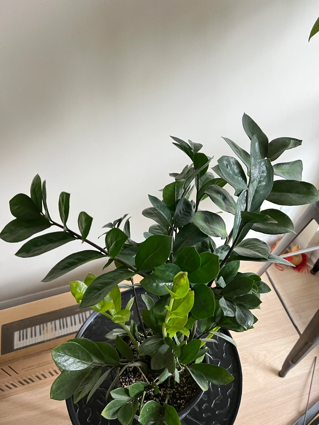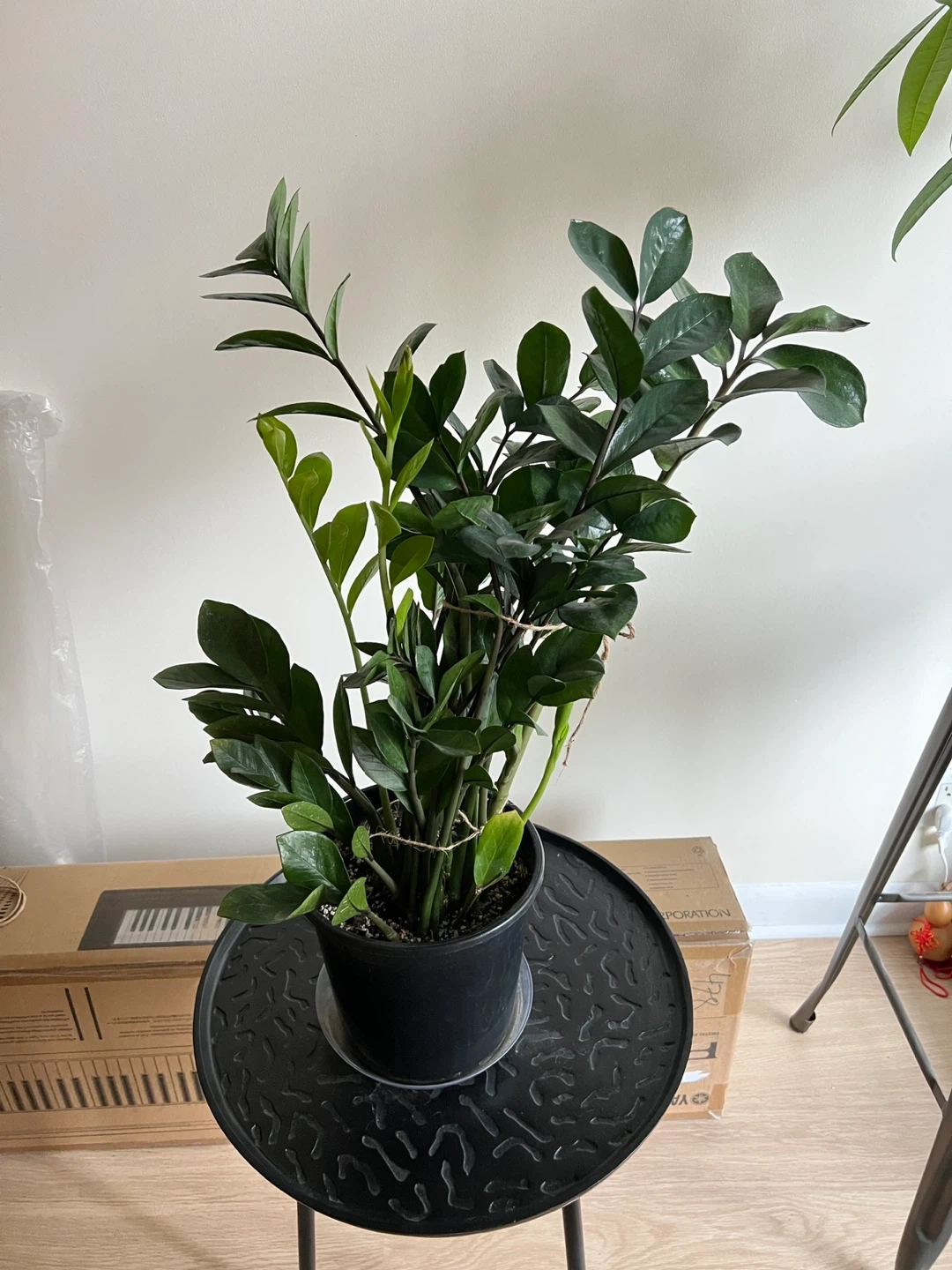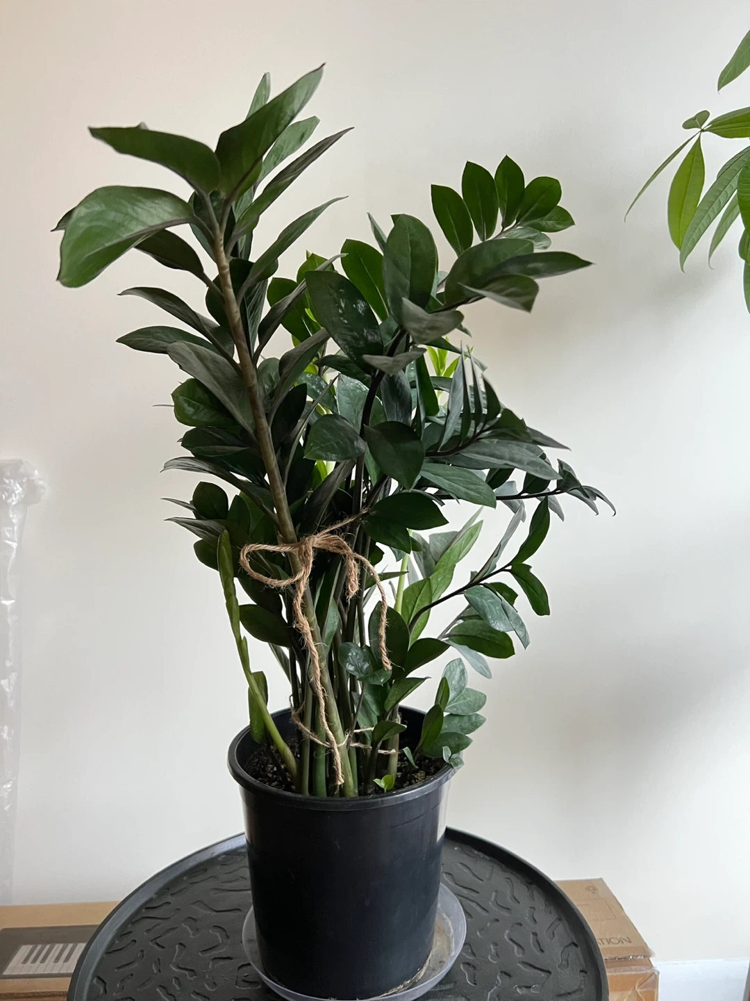 Large Zz plant that keeps growing. Healthy, never had pests. 28 inches tall measuring from the bottom of the pot. Easy to maintain. Needs watering like once a month. It is quite heavy. I’ve tied string around some of the stems to make it grow straight.