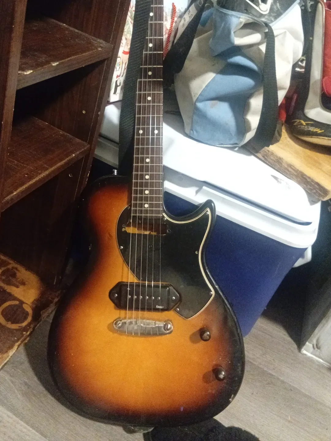 Selling a vintage Epiphone electric guitar. It has a sunburst finish and a black pickguard. It's in good condition for its age. Perfect for someone looking for a classic sound!