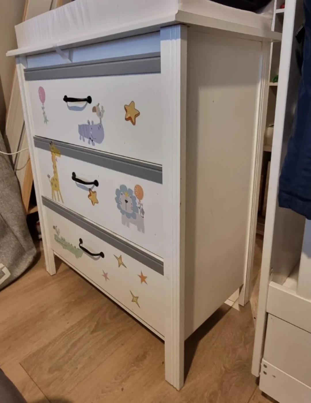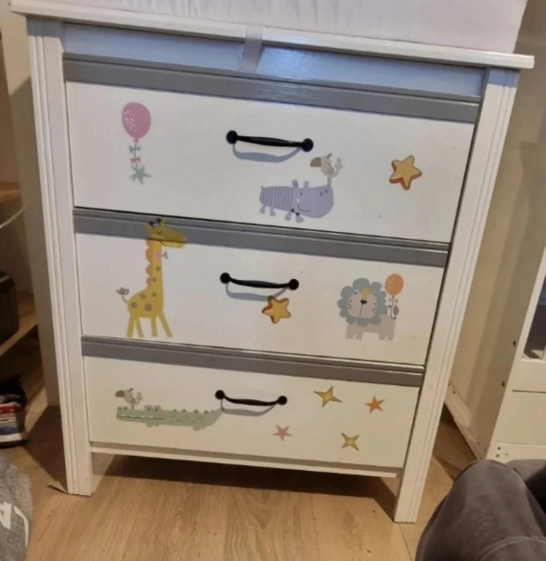 Selling a cute kids' dresser! It features adorable animal decals on the drawers, perfect for a nursery or child's room. It's in good condition and ready to use