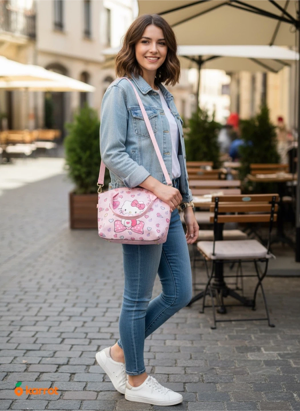 Super cute Hello Kitty handbag! It's pink with a Hello Kitty design and comes with a matching strap. Perfect for any Hello Kitty fan!