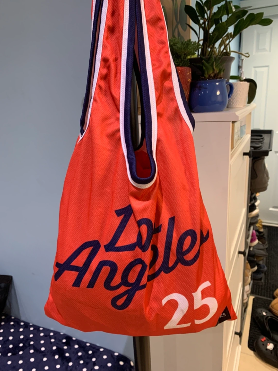 This is a fun tote bag made from a Los Angeles jersey! It's a vibrant red colour with blue and white detailing. Perfect for carrying your essentials around town