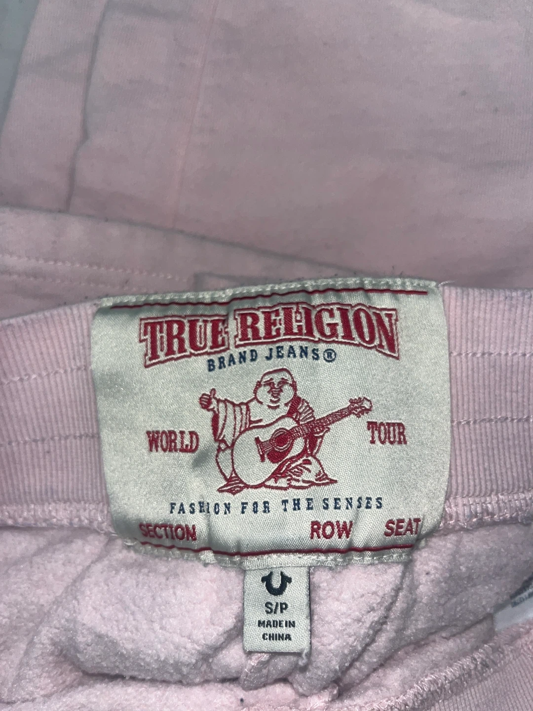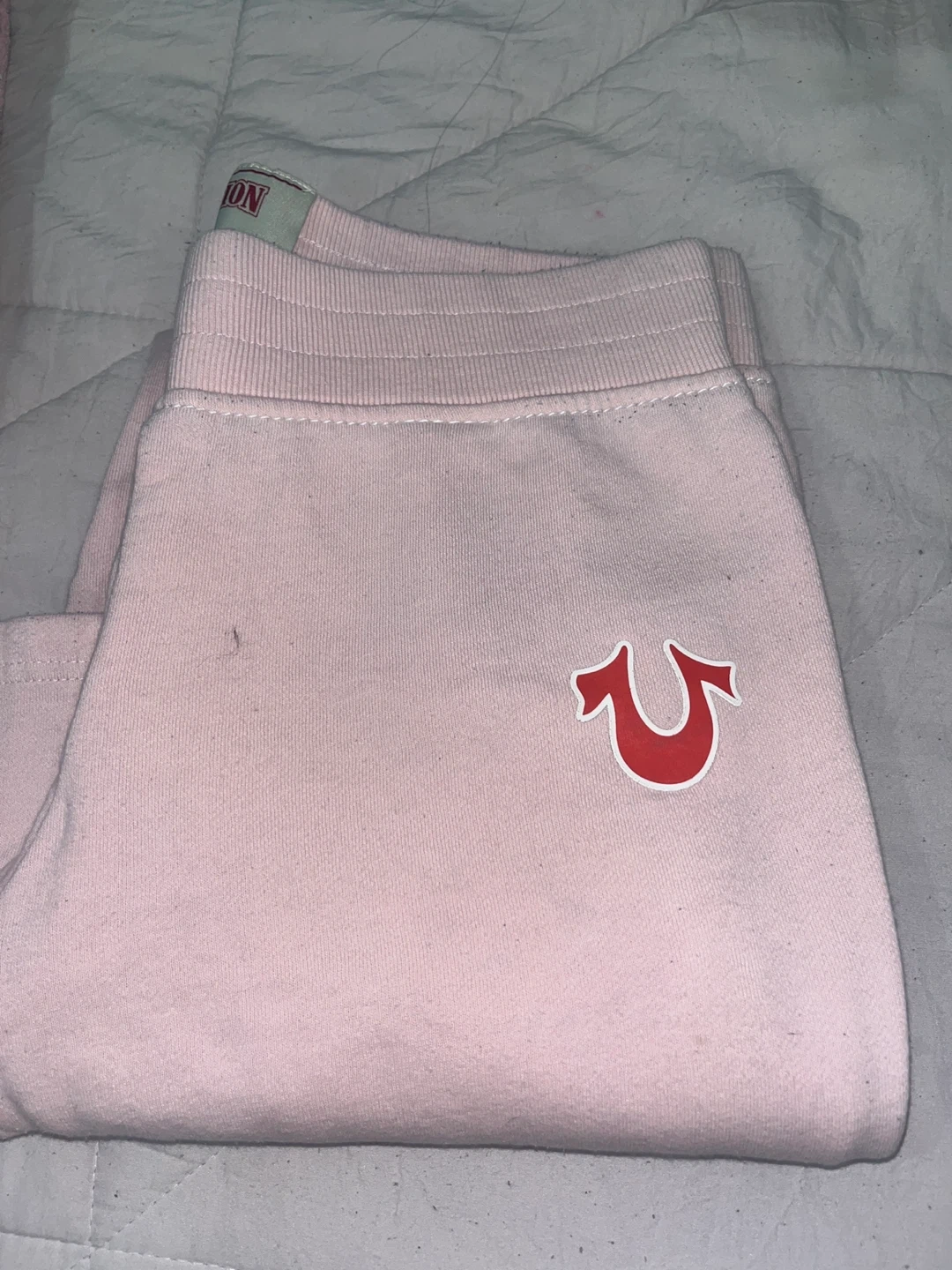 Selling a pair of True Religion sweatpants in a light pink color! They are a size small and feature the iconic True Religion logo in red. Great for lounging or casual wear! Has a stains of detergent but can be washed!