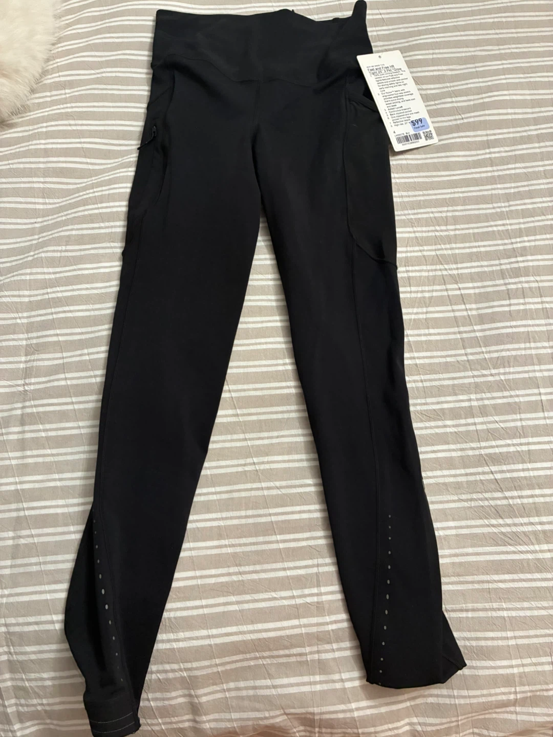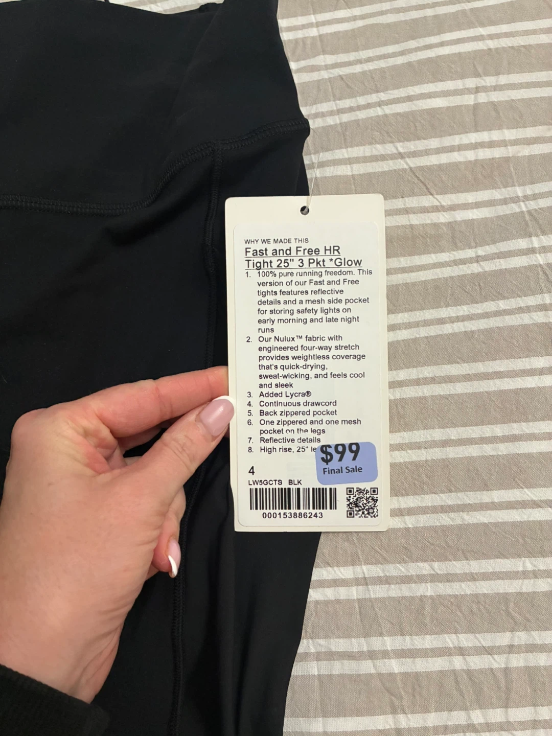 Selling a pair of Lululemon Fast and Free High-Rise Tights 25" Pockets in size 4! Never worn new with tags. These tights feature reflective details and a mesh side pocket for storing safety lights on early morning or late night runs. Originally bought for $99