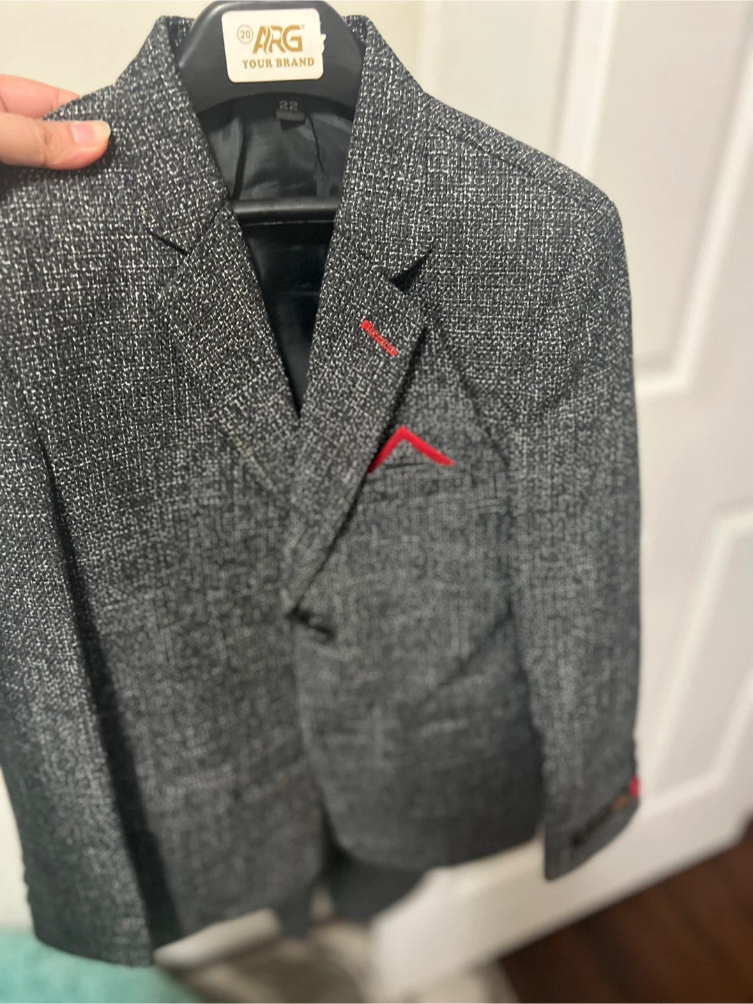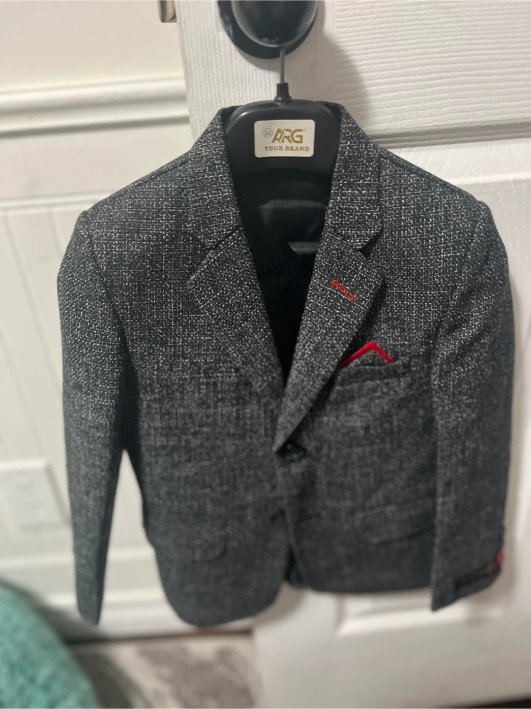 Selling a stylish boys' blazer from ARG Brand! This blazer is in great condition and comes in a classic grey colour with a subtle pattern. Perfect for special occasions or dressing up a casual outfit.