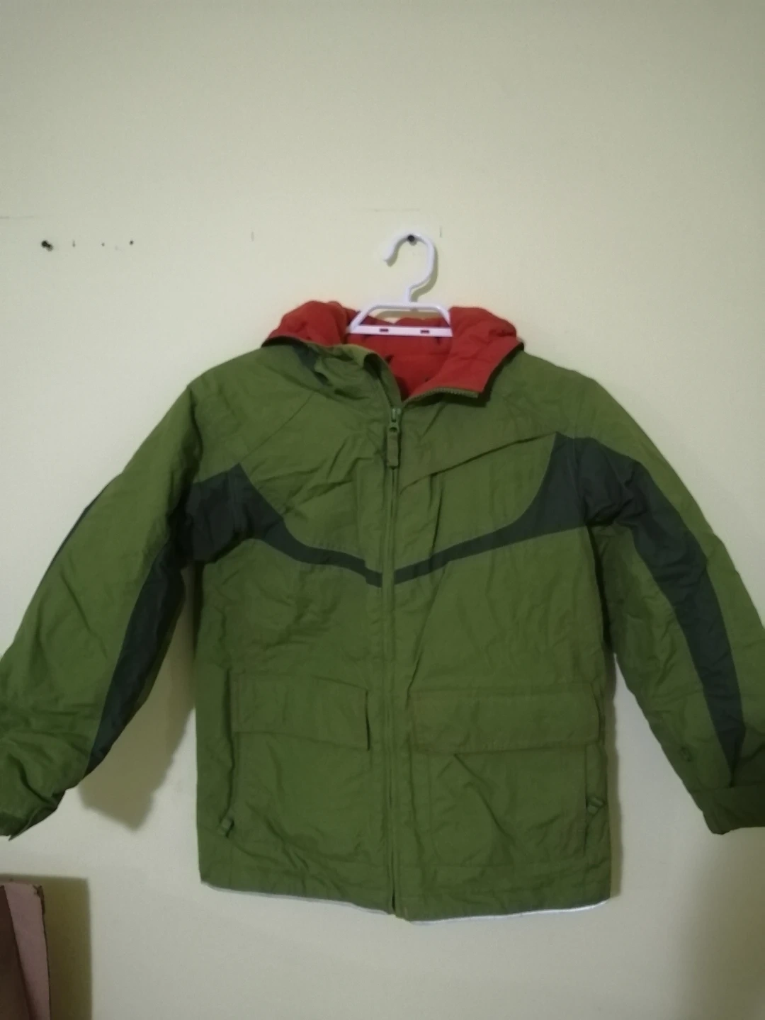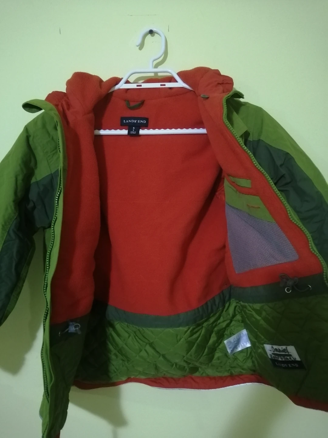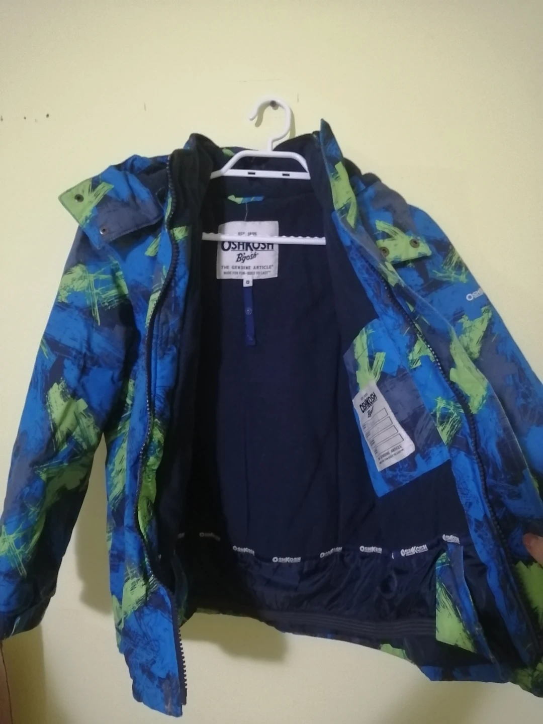 Two warm winter jackets for kids! One is an OshKosh B'gosh jacket with a blue and green abstract pattern. The other is a Land's End jacket in green with a red fleece lining. Both are in great condition and ready for the cold weather