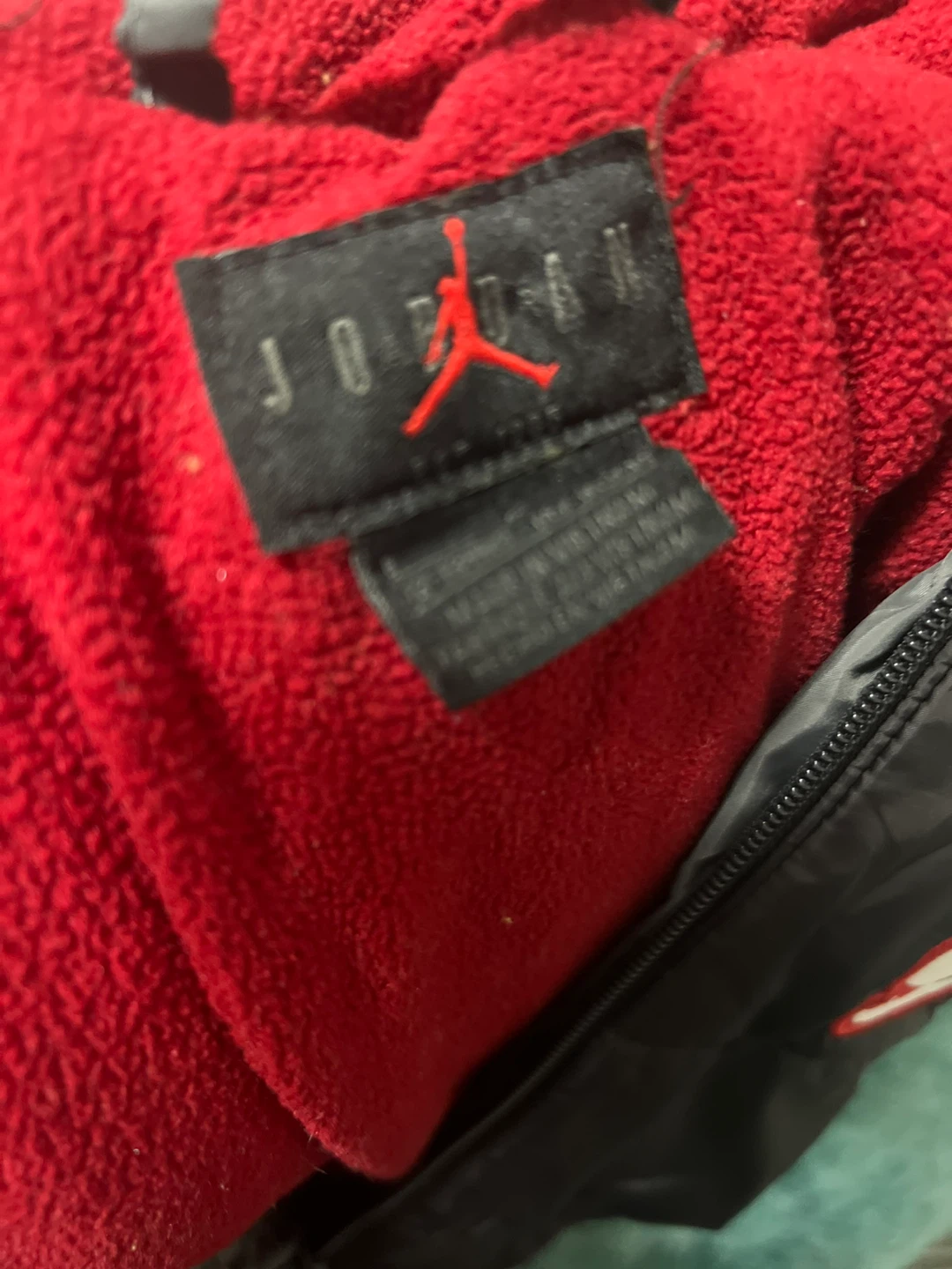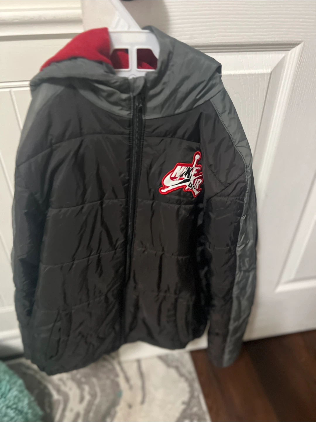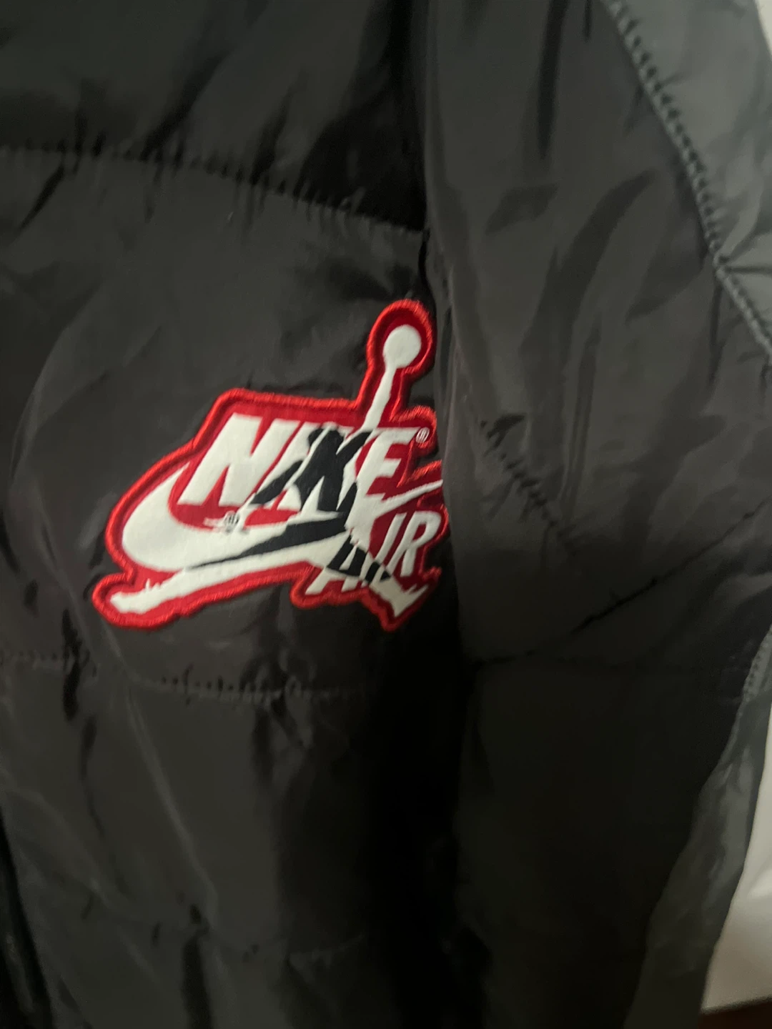 Selling a Nike Air Jordan puffer jacket! It's black with a red lining and the iconic Air Jordan logo. Great for staying warm and stylish!