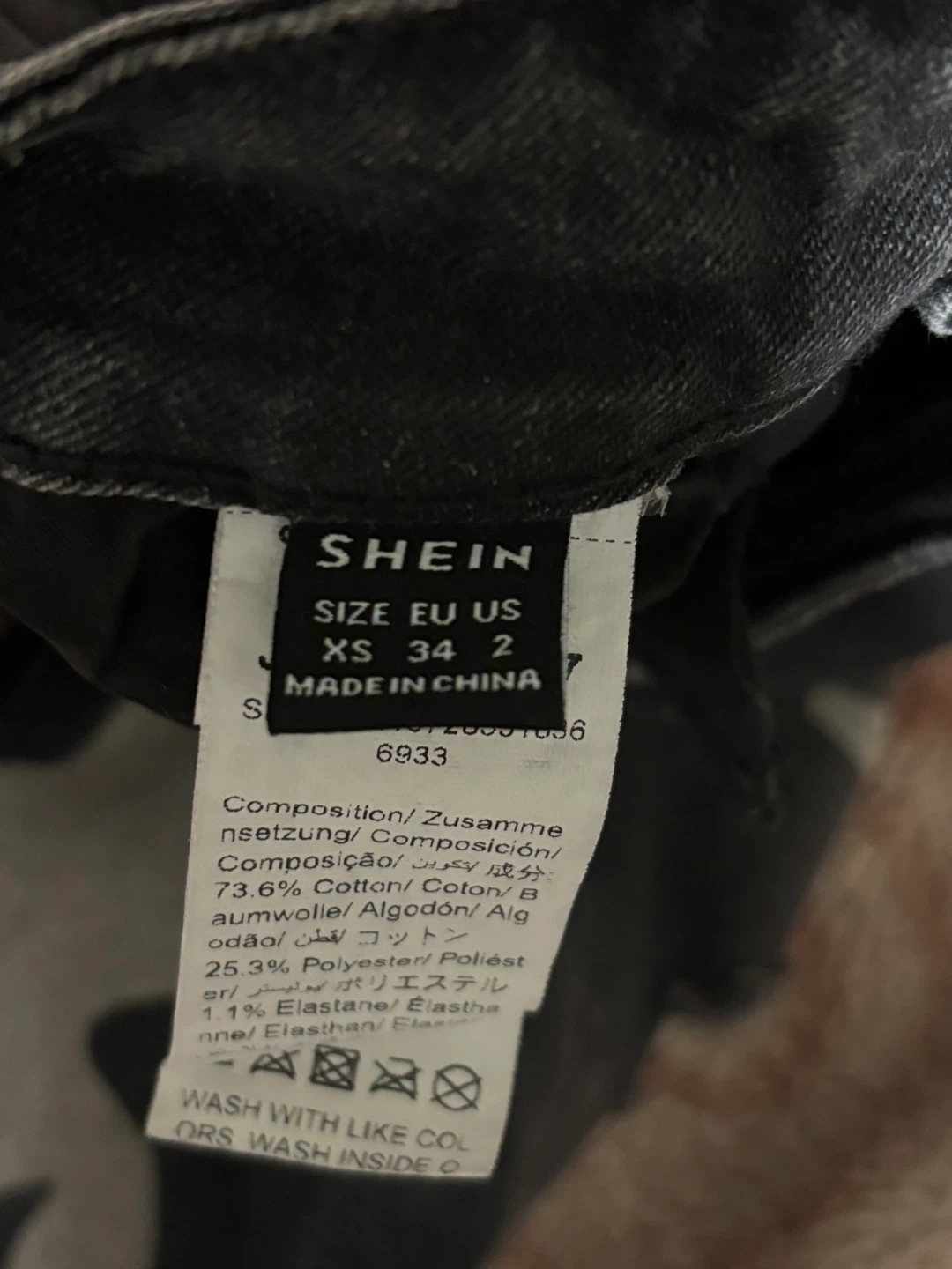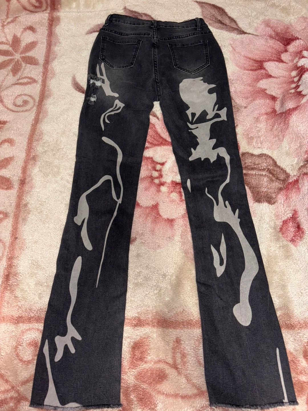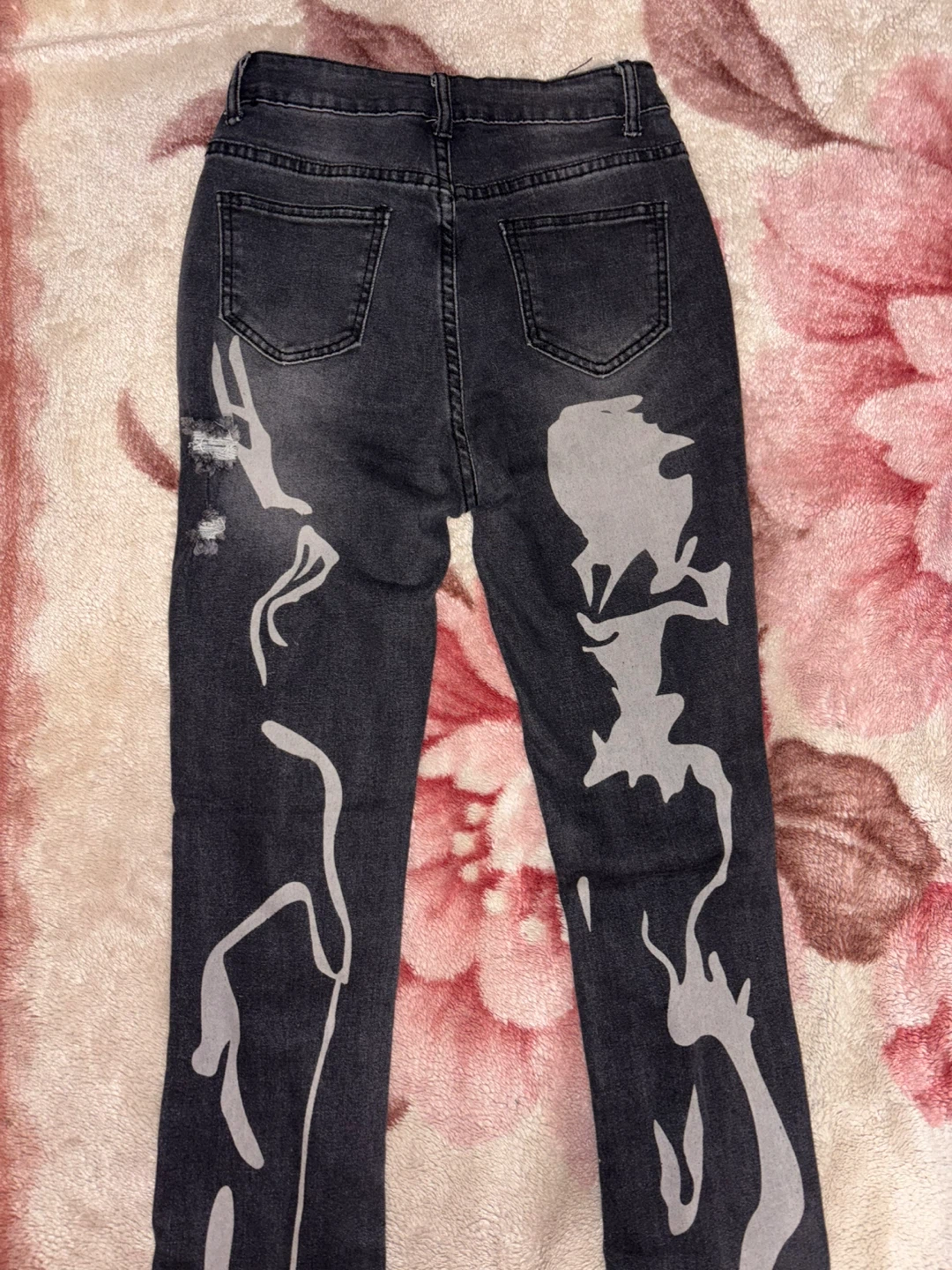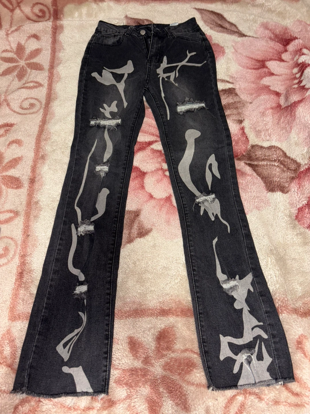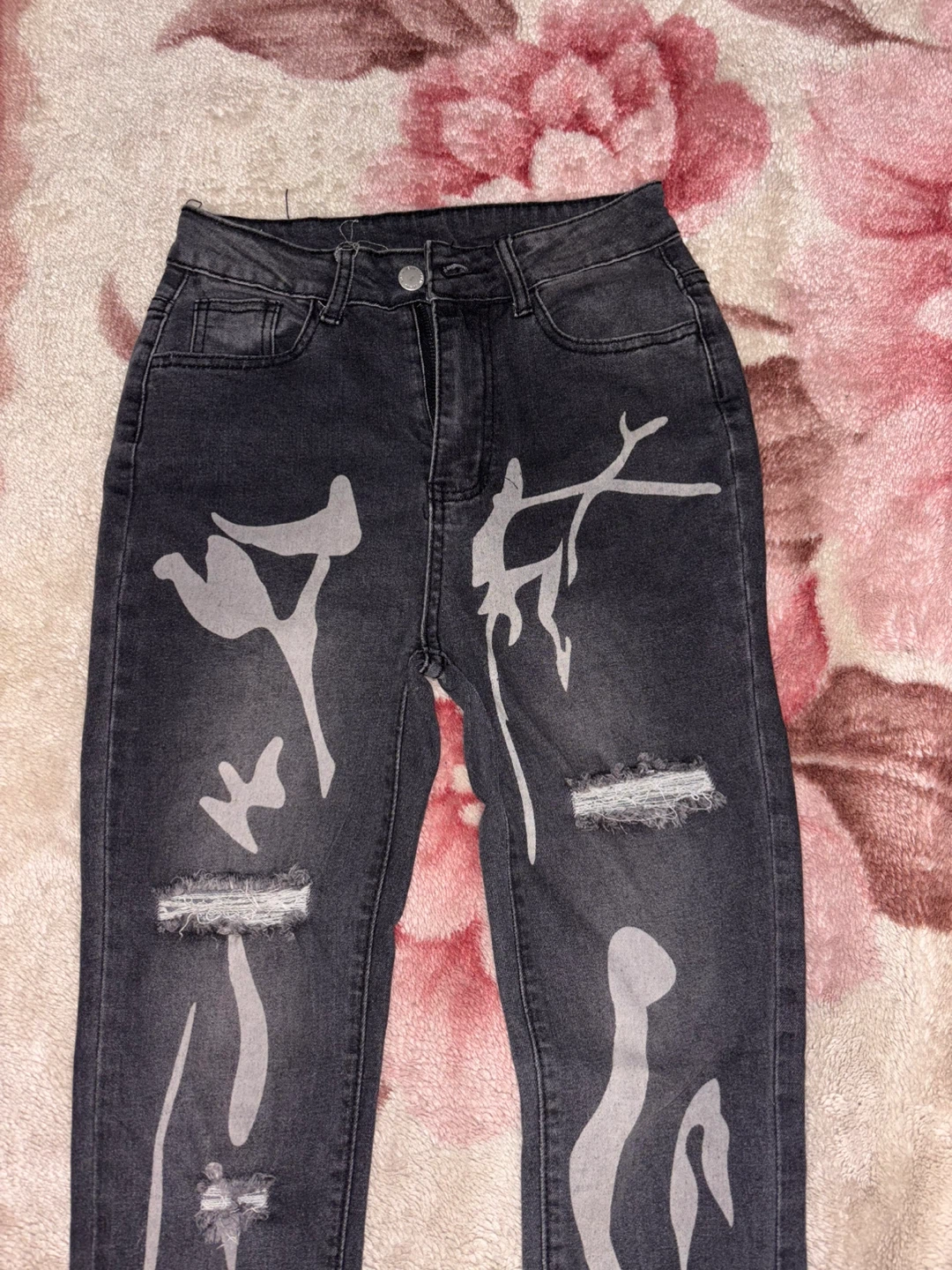 These are a pair of Shein jeans in size XS. They are black with a unique graphic print. The material is 73.6% cotton, 25.3% polyester, and 1.1% elastane. They have a ripped design. Brand new and ready for a new owner!