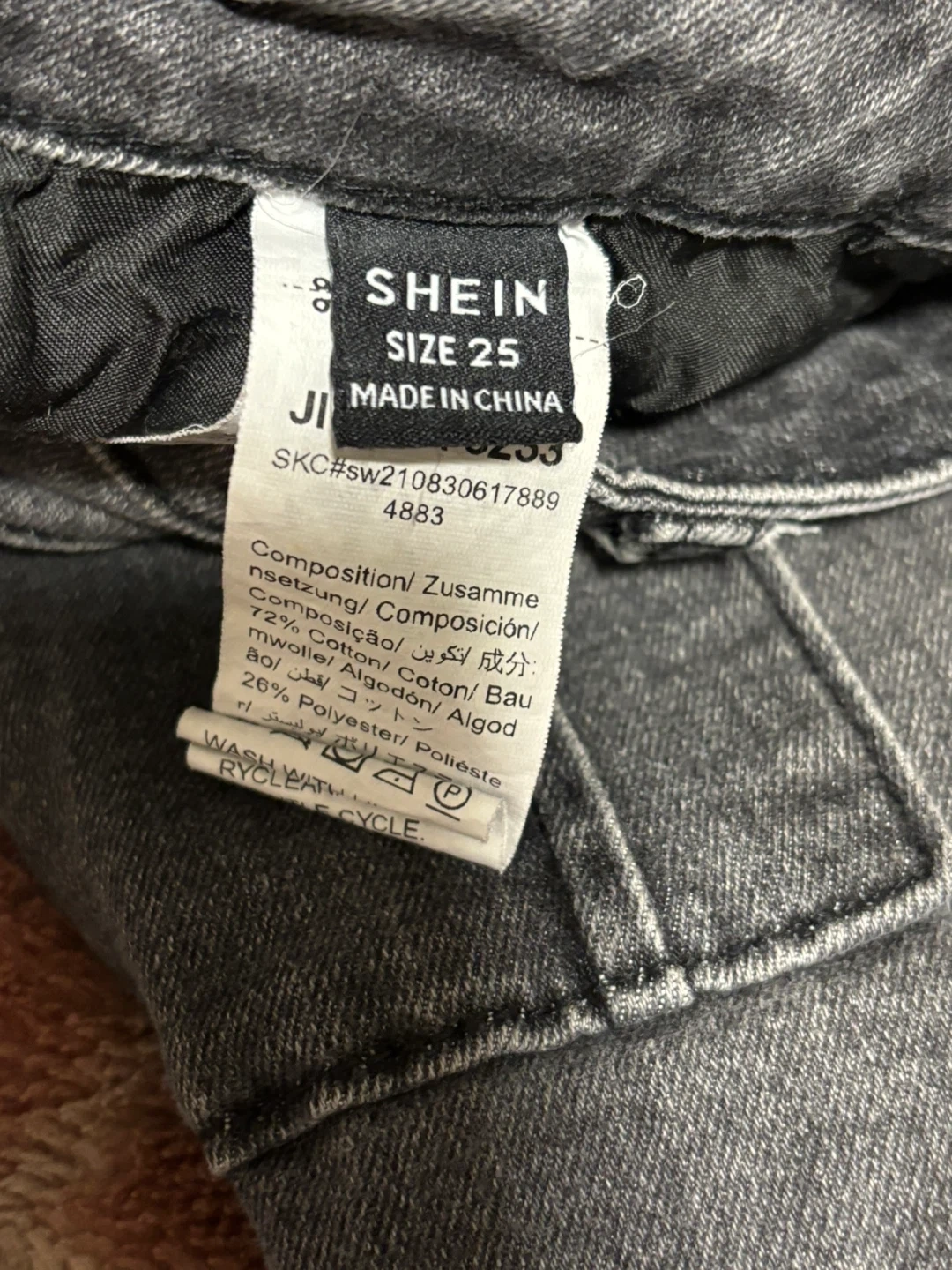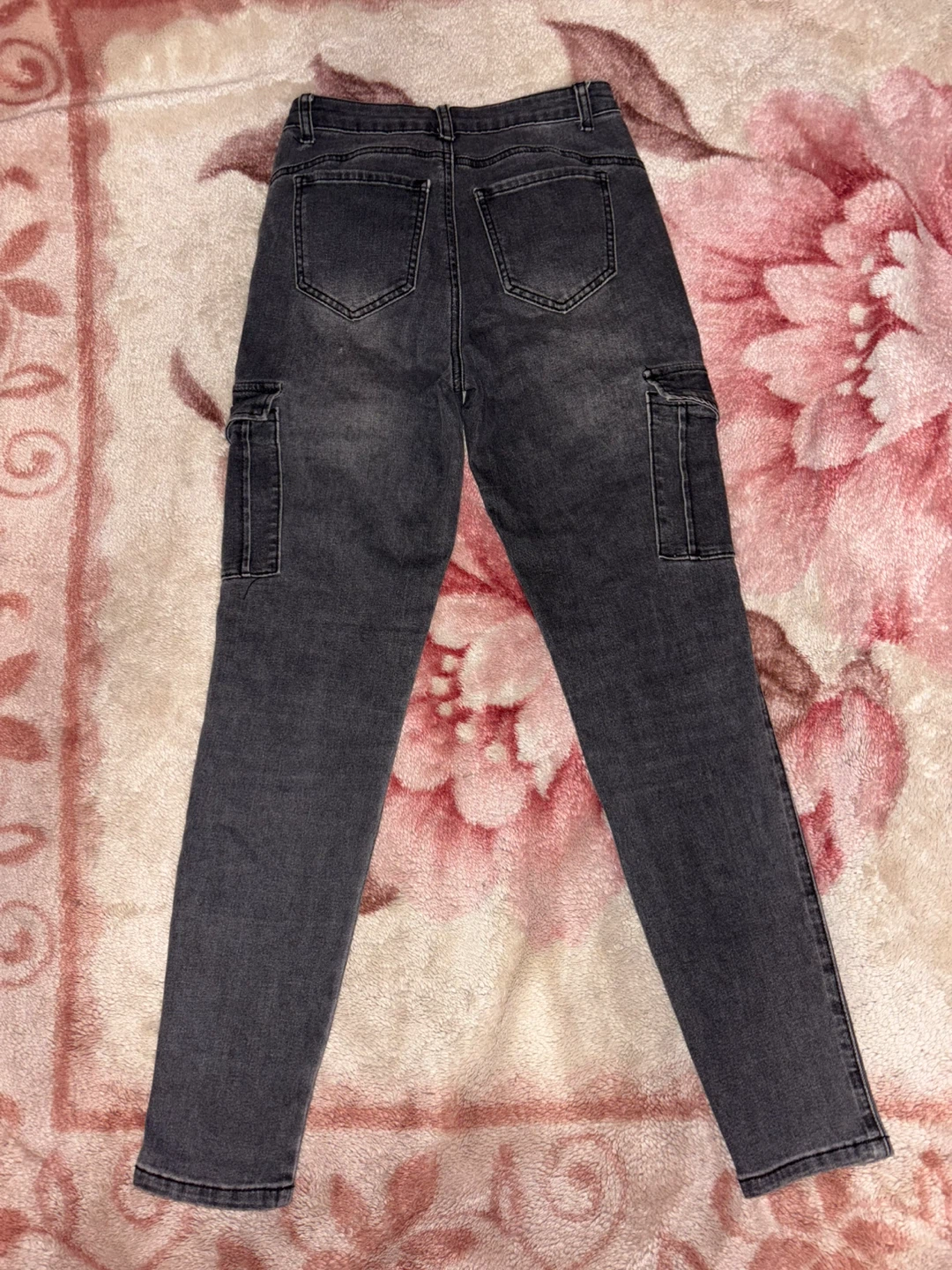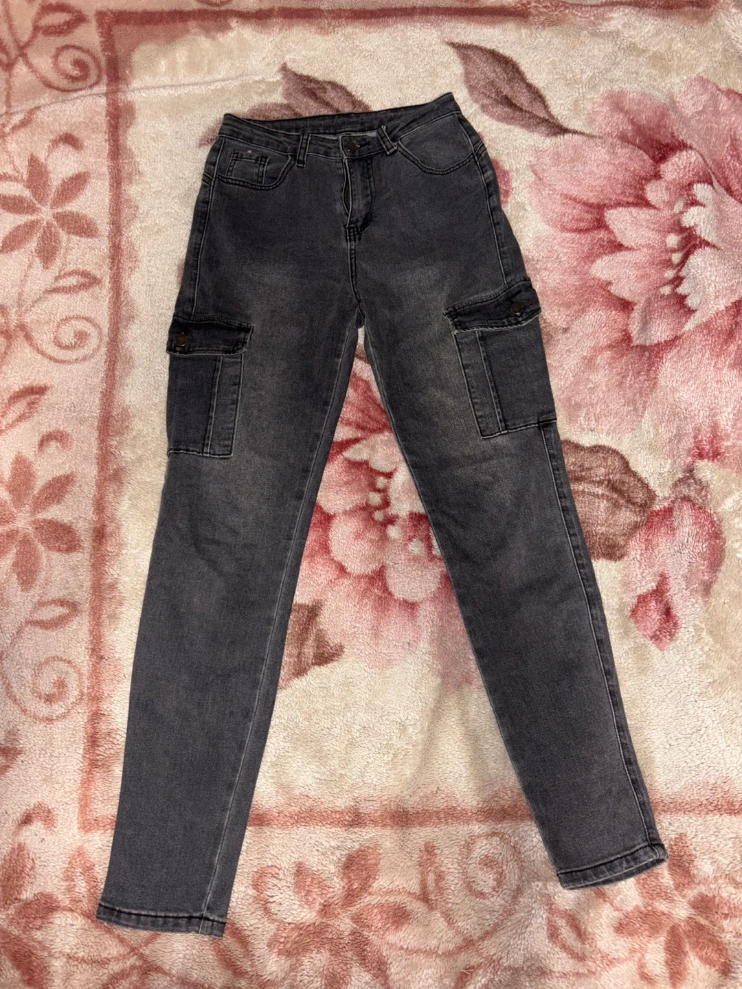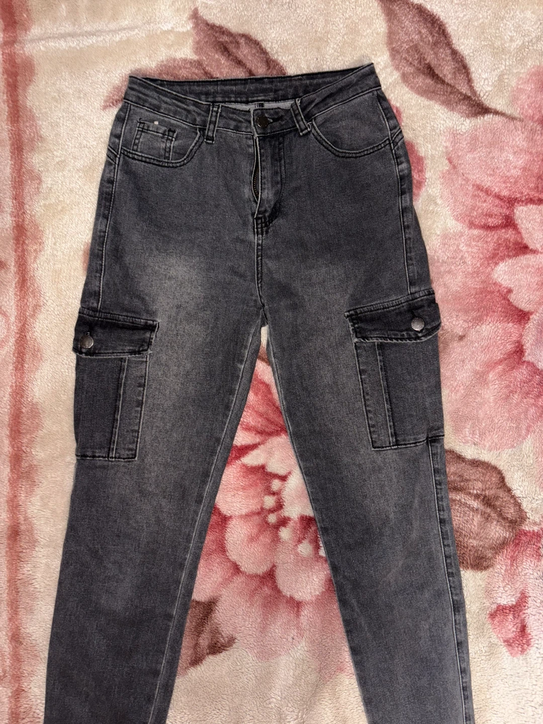 Selling a pair of gray cargo pants from Shein! They're a size 25 and made of 72% cotton and 28% polyester. They have a stylish, casual look with functional cargo pockets. Brand new and ready for a new owner!