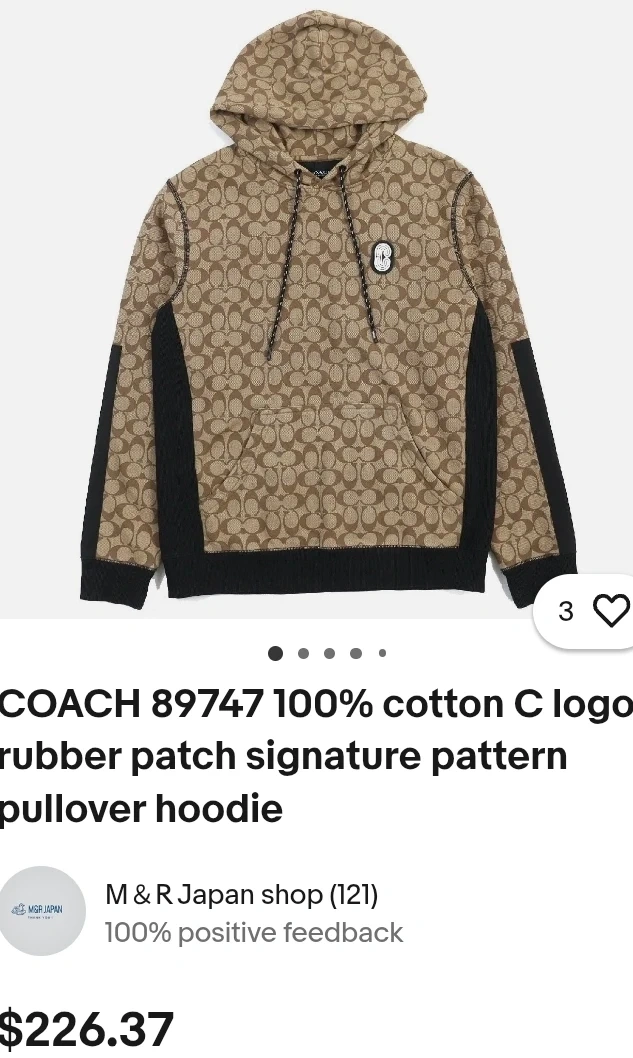 Selling a COACH pullover hoodie with the signature C logo pattern. It's made from 100% cotton and features a rubber patch. The original price was $226.37.