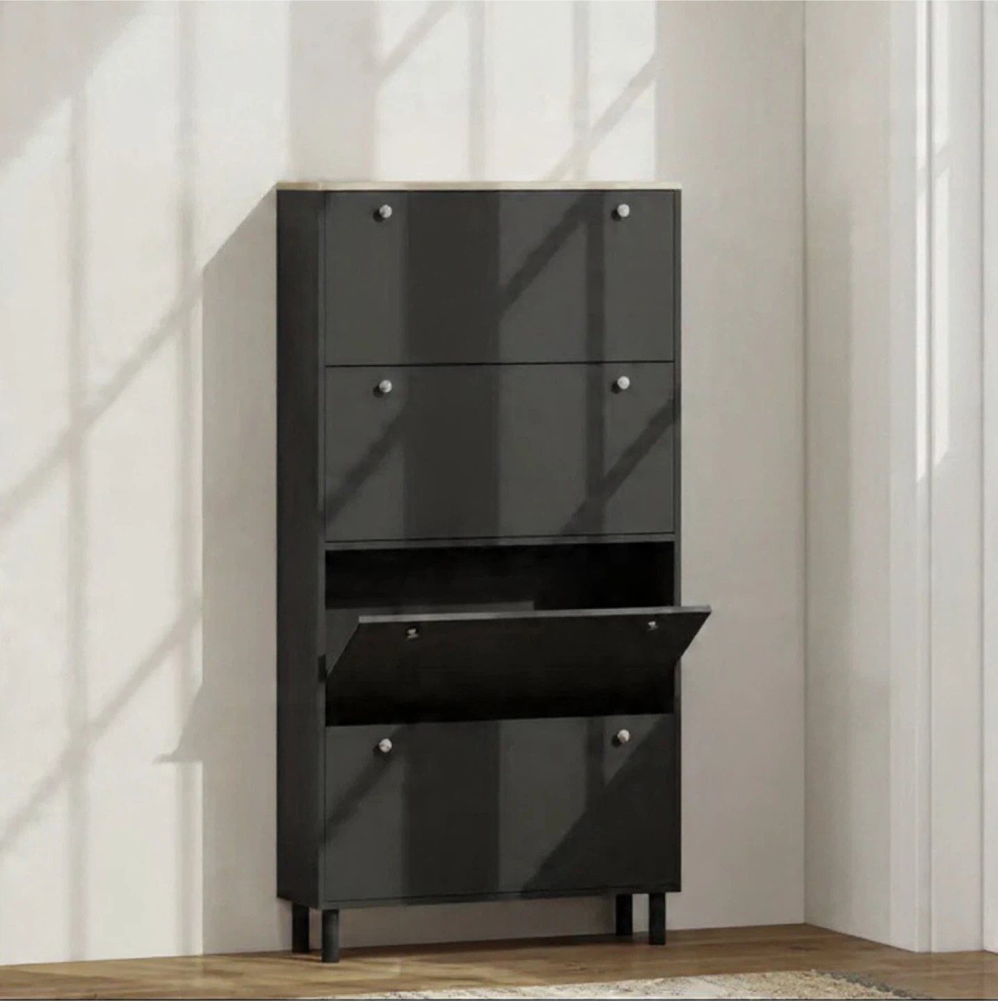 It is Brand new in box. Selling a black shoe cabinet. It has a sleek design and provides ample storage for your footwear! Perfect for keeping your entryway organized and tidy.