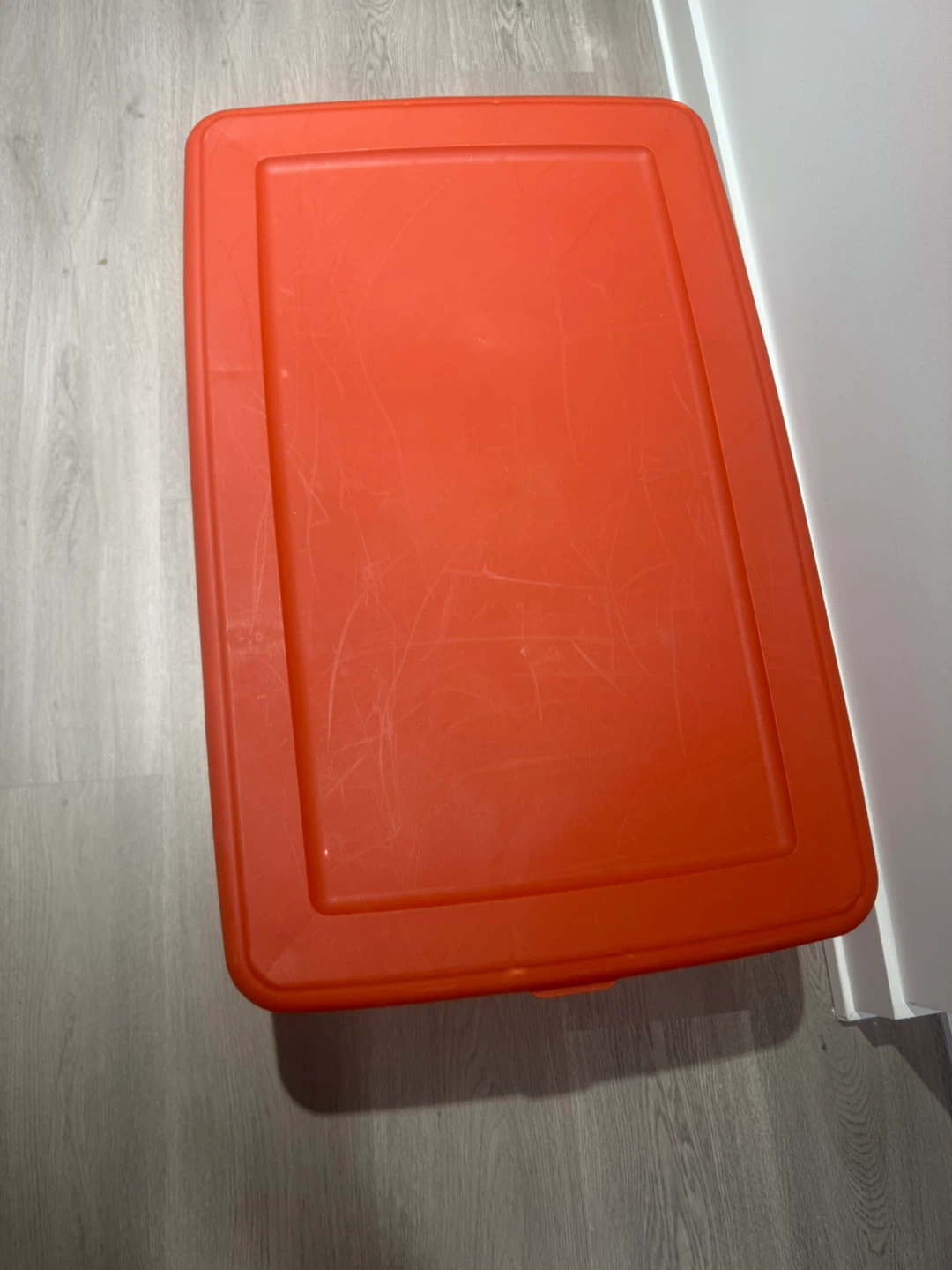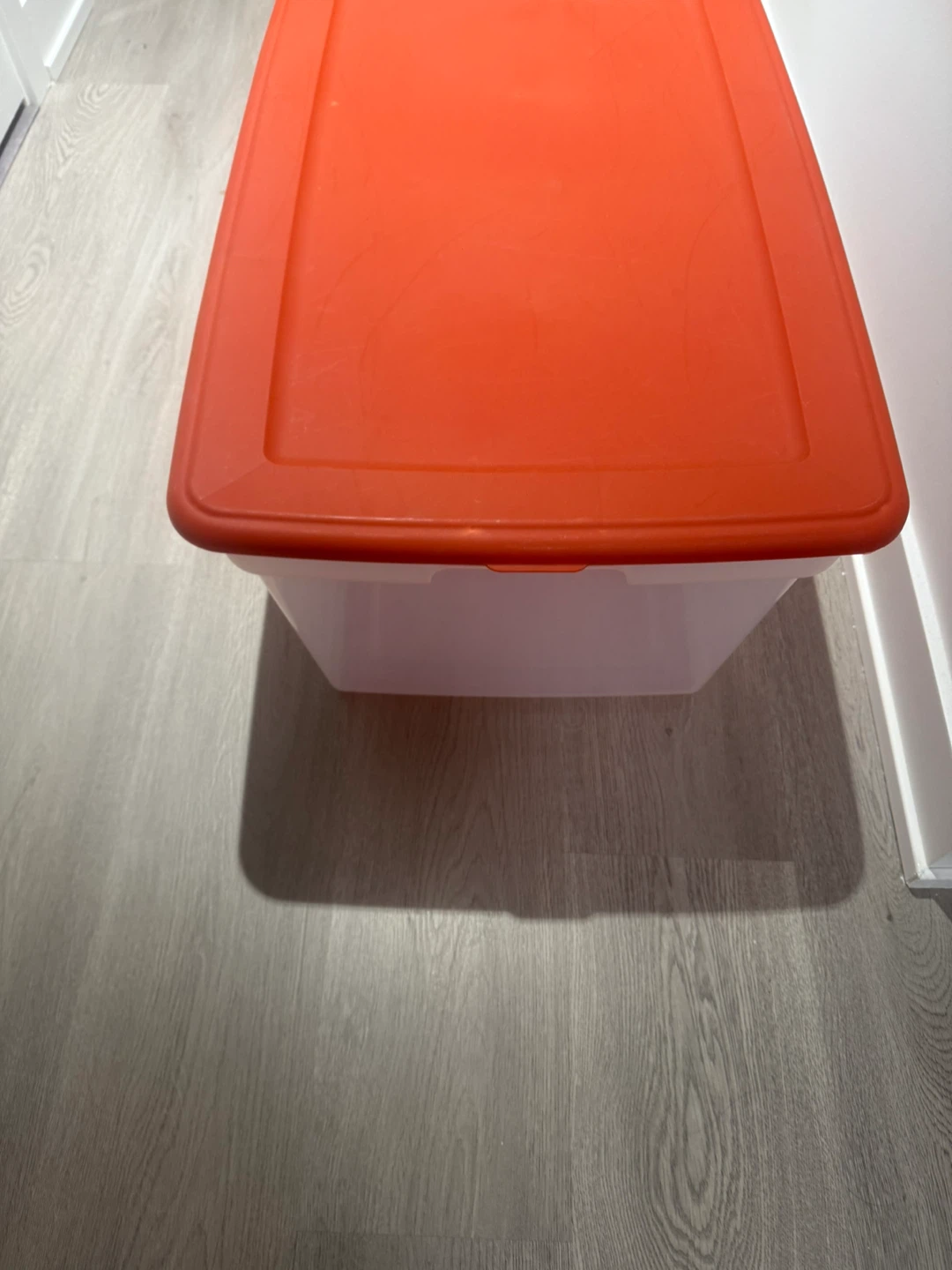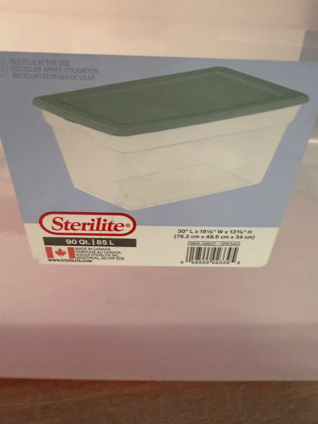 Selling a Sterilite 90 Qt storage box! It's great for organizing and storing various items. The dimensions are 30" L x 19 1/8" W x 13 1/2" H (76.2 cm x 48.6 cm x 34 cm).
