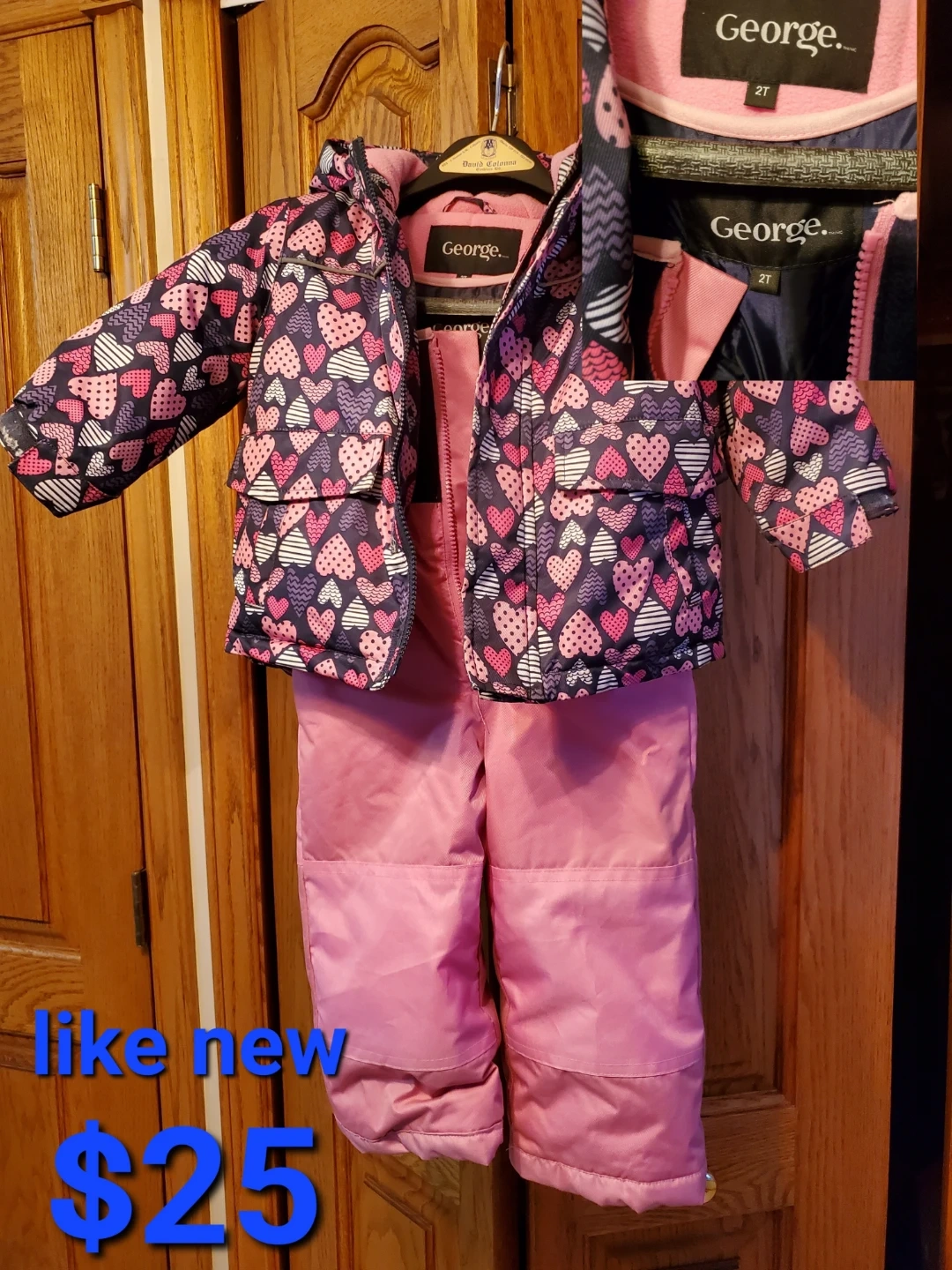 This George snowsuit is in like-new condition and ready for winter! It's a size 2T and features a cute heart pattern on the jacket and solid pink pants