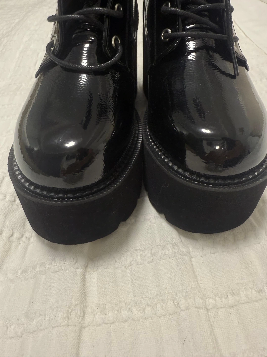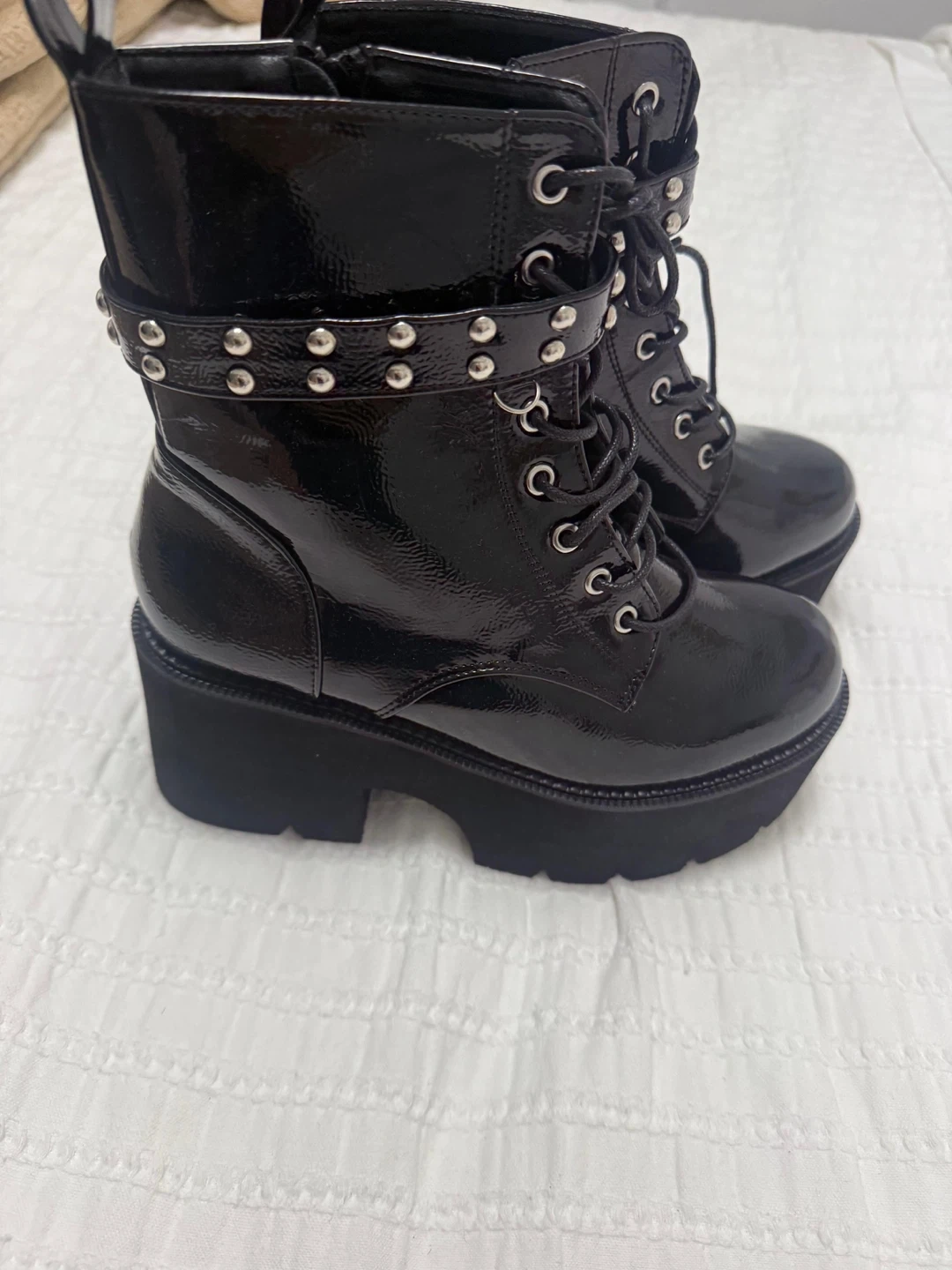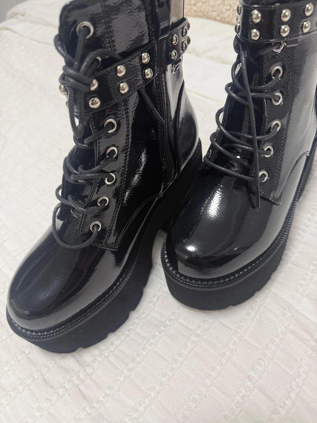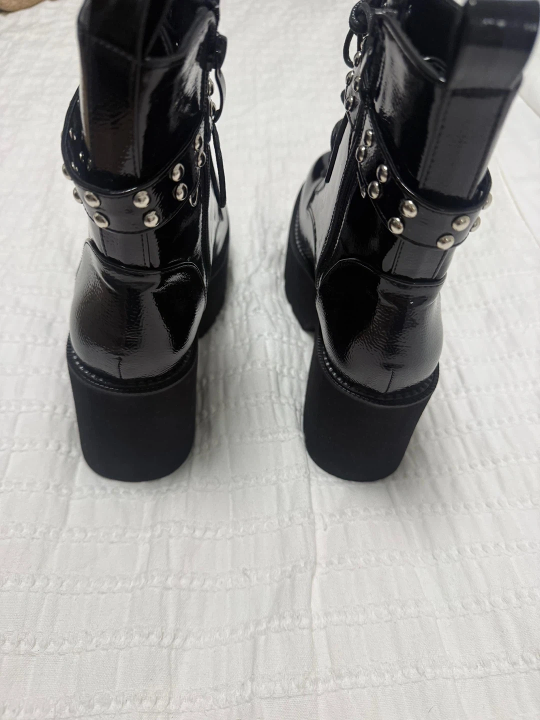 These are some stylish black platform boots! Size 37. They feature studded straps and a lace-up design. They're new and ready for a new owner