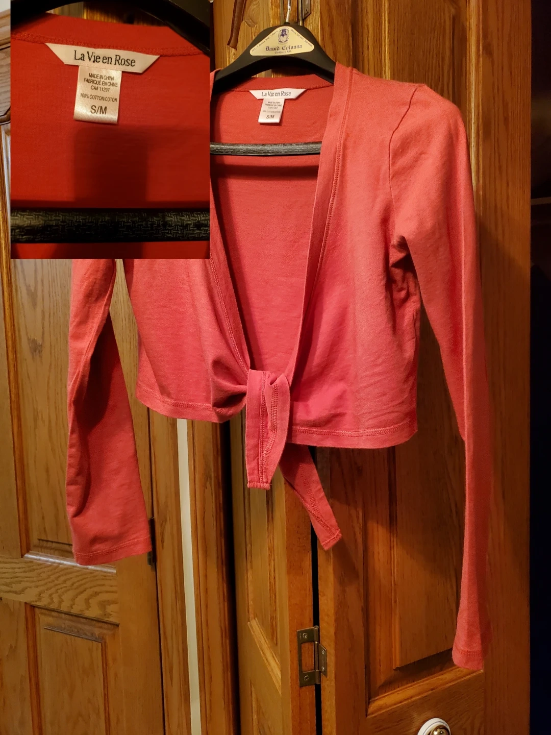 This is a cute tie-front cardigan from La Vie en Rose. It's a size S/M and made of 100% cotton. Perfect for layering!