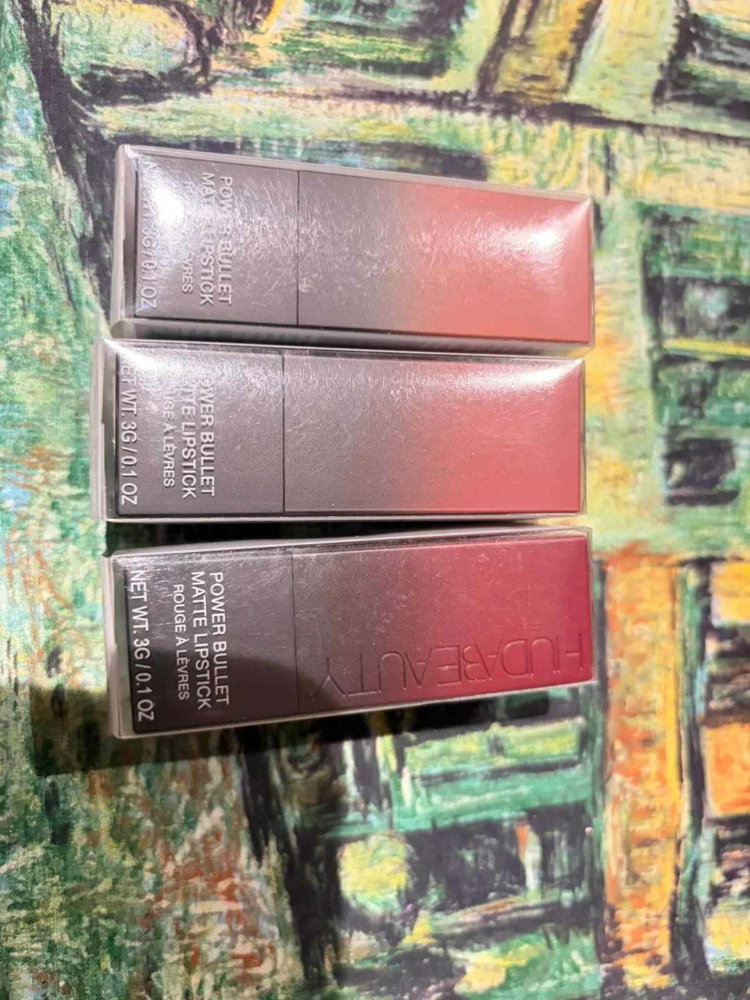 Selling a set of three Huda Beauty Power Bullet Matte Lipsticks. The shades are Interview, Third Date, and Ladies Night. Perfect for creating a variety of looks!