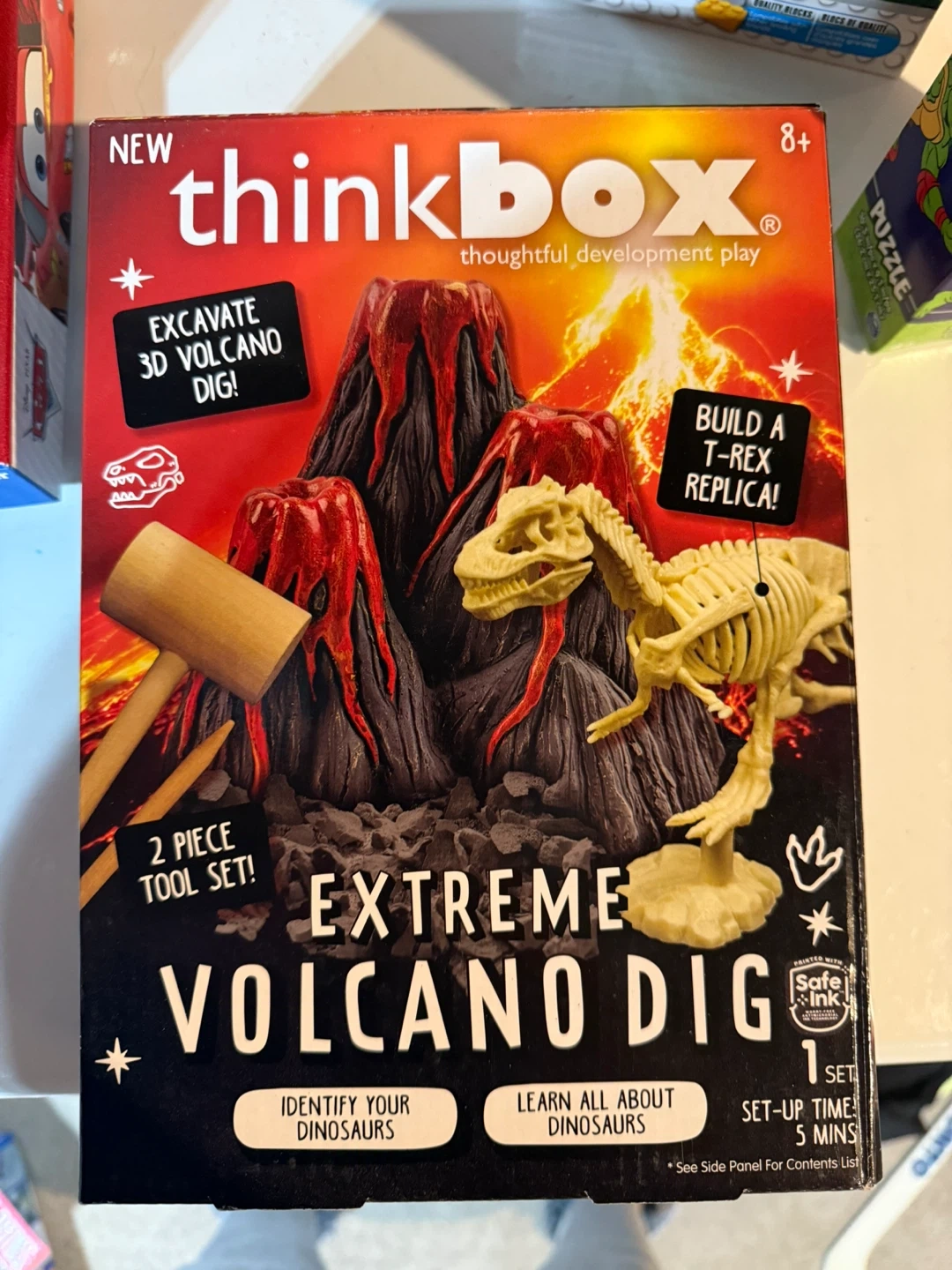Selling Thinkbox Extreme Volcano Dig kit! It's a fun and educational toy for kids 8+. The kit includes a 2-piece tool set to excavate a 3D volcano and build a T-Rex replica. The box says set-up time is only 5 minutes!