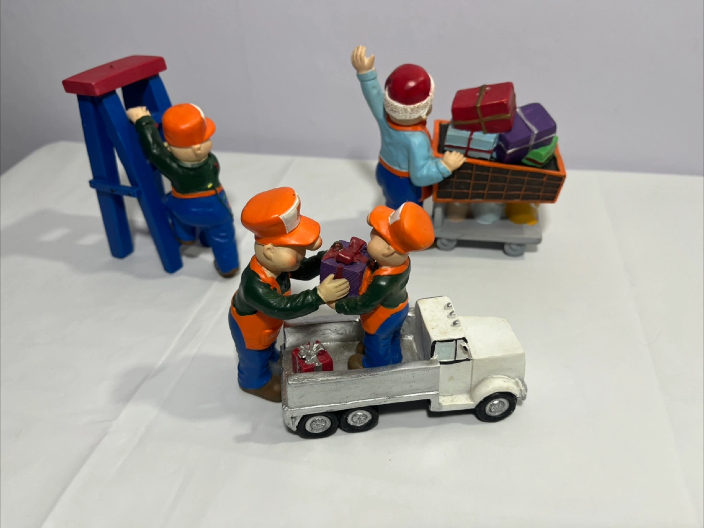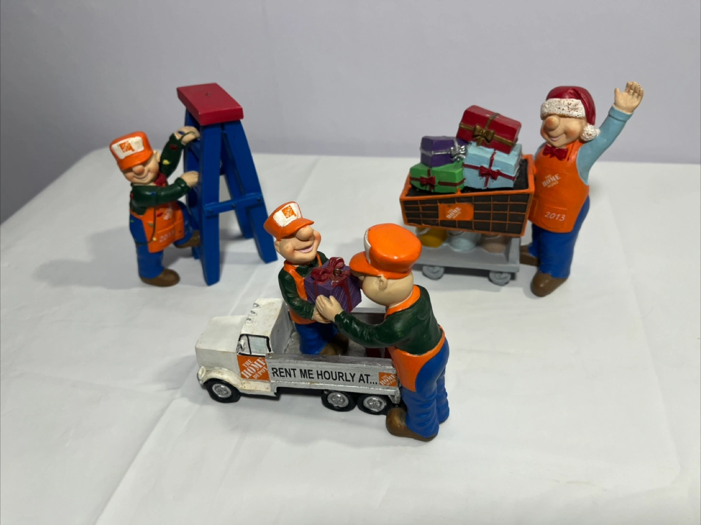 Here's a cute Home Depot Christmas decoration set! It features little Home Depot employees with gifts, a ladder, and a cart. Perfect for adding a touch of holiday cheer to your home or office