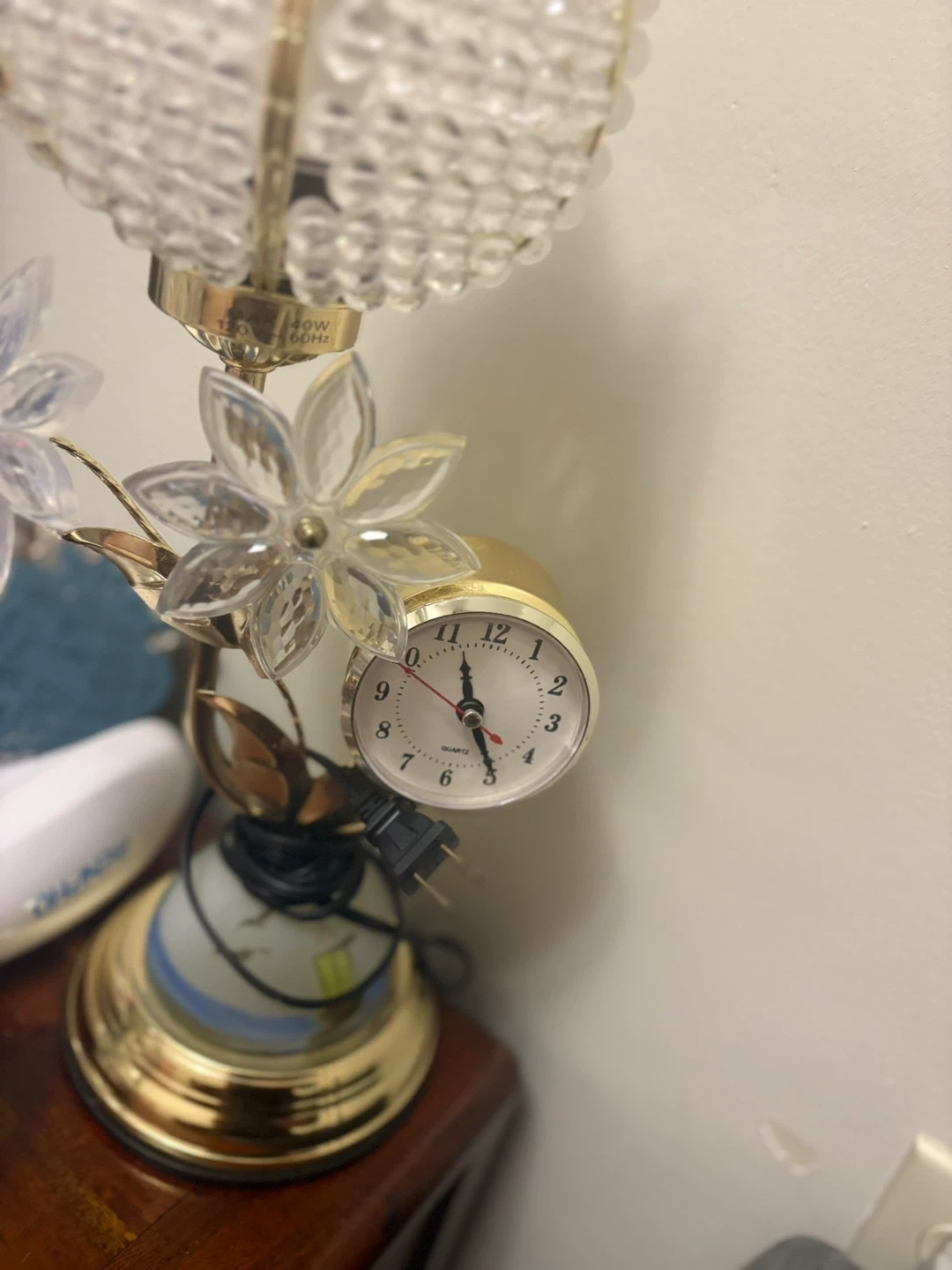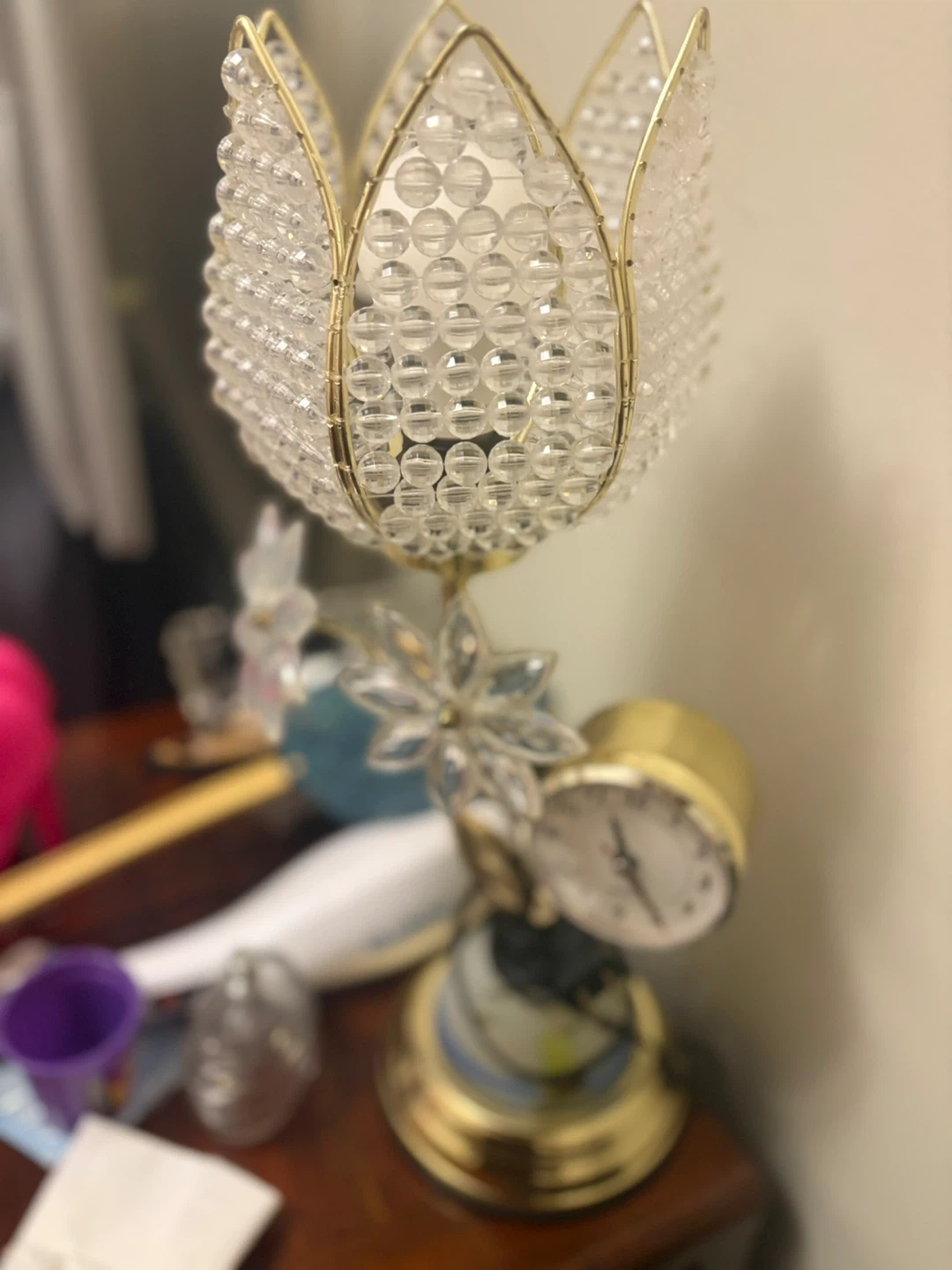 This is a lovely vintage lamp with crystal accents and a built-in clock! It has a unique floral design and would add a touch of elegance to any room