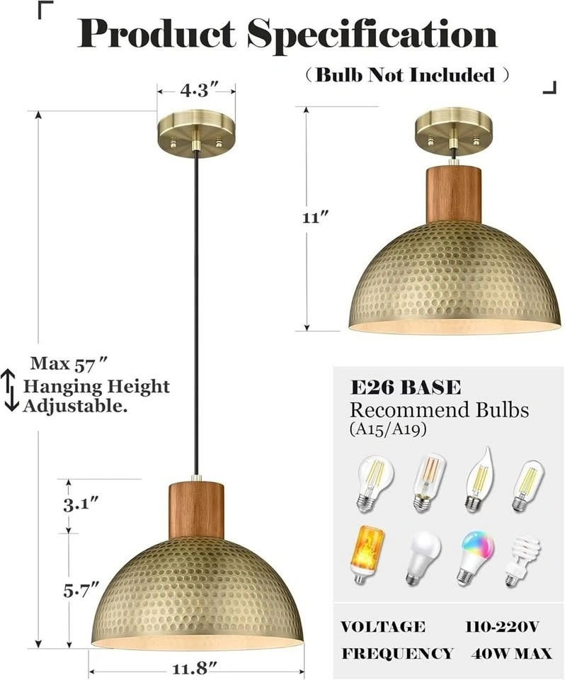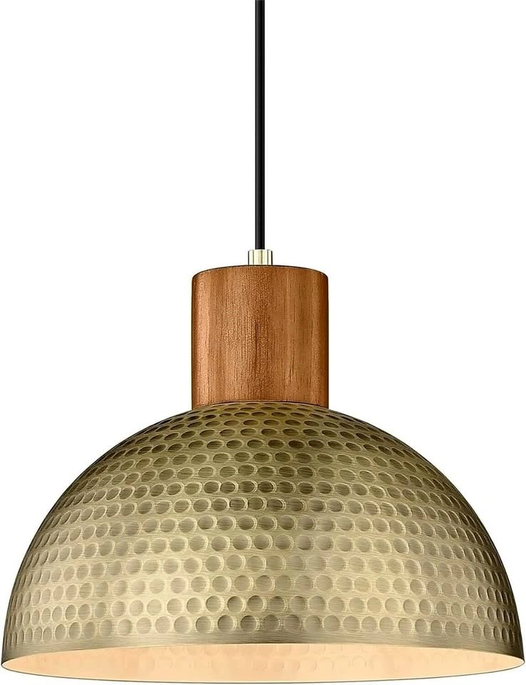 ELYONA pendant light with a brushed brass hammered metal shade, offering a unique vintage industrial feel. The shade is durable and stable, crafted from natural iron ore. Made with FSC certified solid wood. Max 57" H x 12" W x 12" D, with an adjustable height. Ceiling canopy diameter of 4.3".