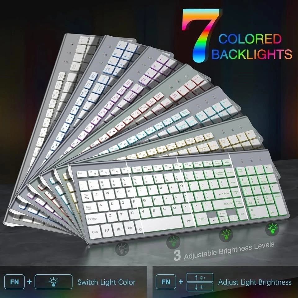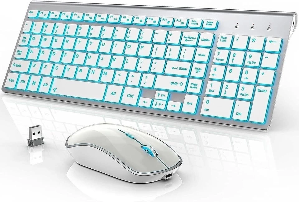 The silent keyboard features scissor-switch low-profile keys, providing a responsive and smooth typing experience((2mm stroke length). The computer keyboard also has a tilt angle for maximum comfort during long typing sessions, providing wrist support and reducing strain. The ergonomic mouse is designed to conform to the natural contour of your hand, reducing pressure on the wrists and hand muscle. Wireless Mouse DPI 2400 in 5 levels. With 7 color backlit options and silent clicks, the cordless mouse is stylish and aesthetically pleasing.