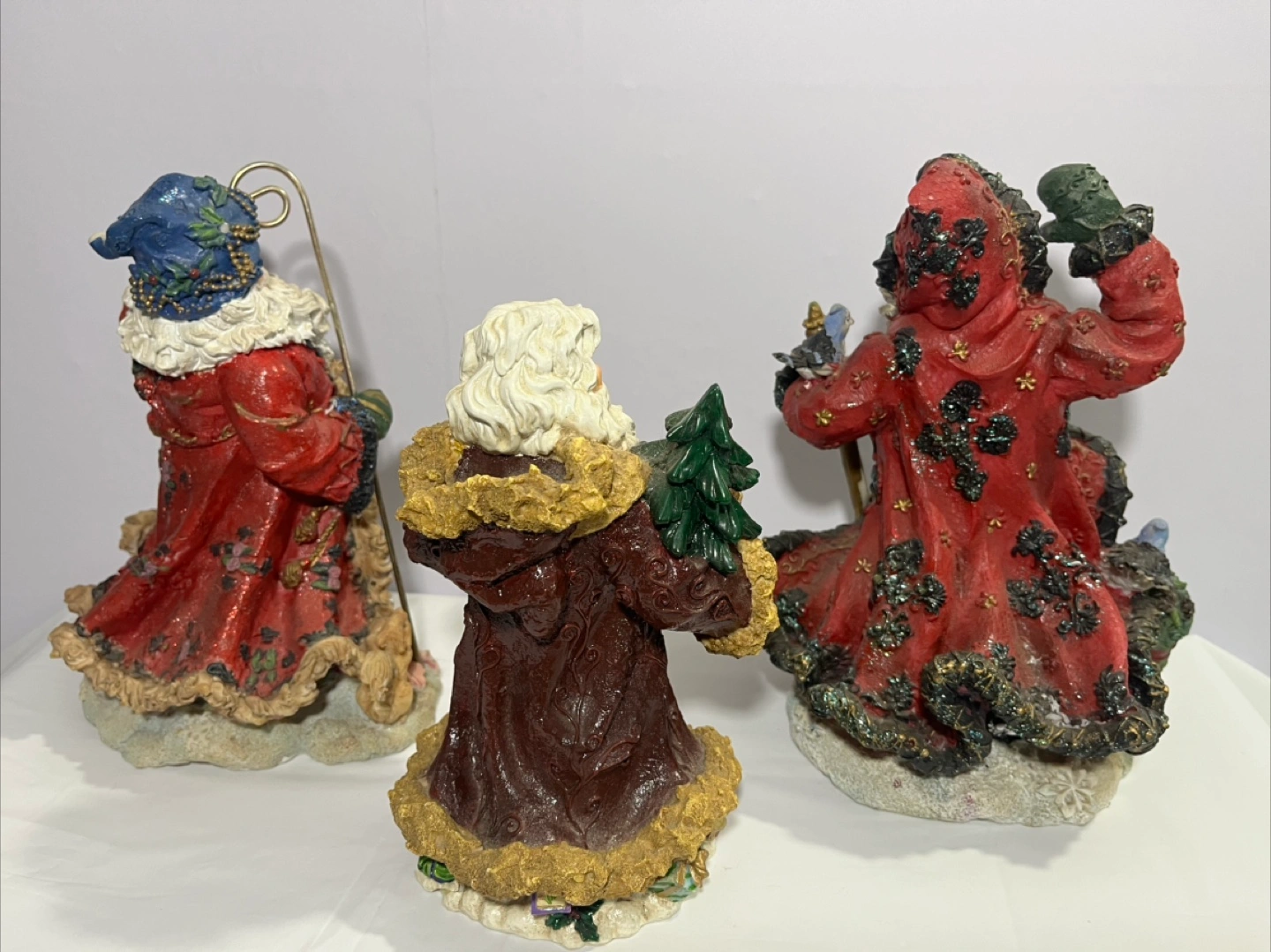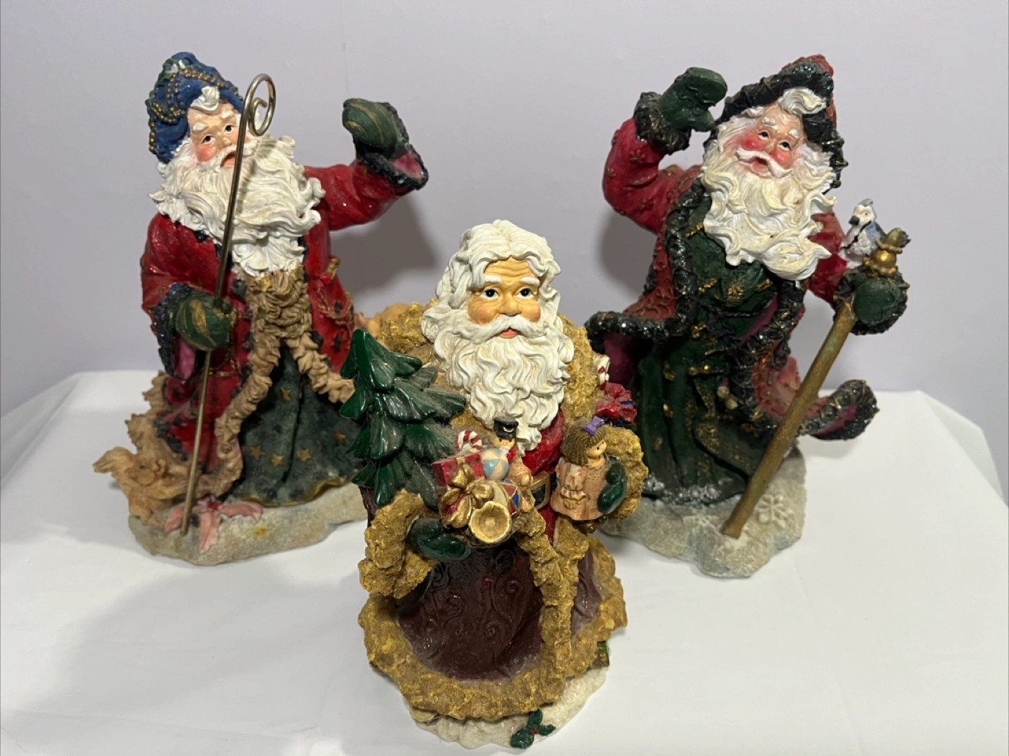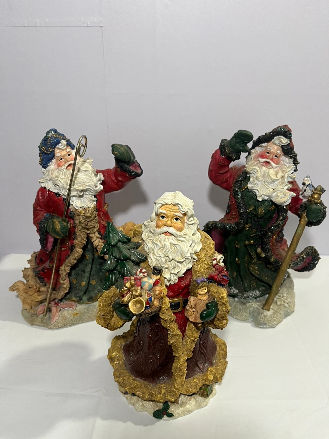 Selling a set of three Santa Claus figurines. They are all dressed in different colored robes and holding various items such as a Christmas tree, gifts, and a staff. They would make a great addition to your holiday decor