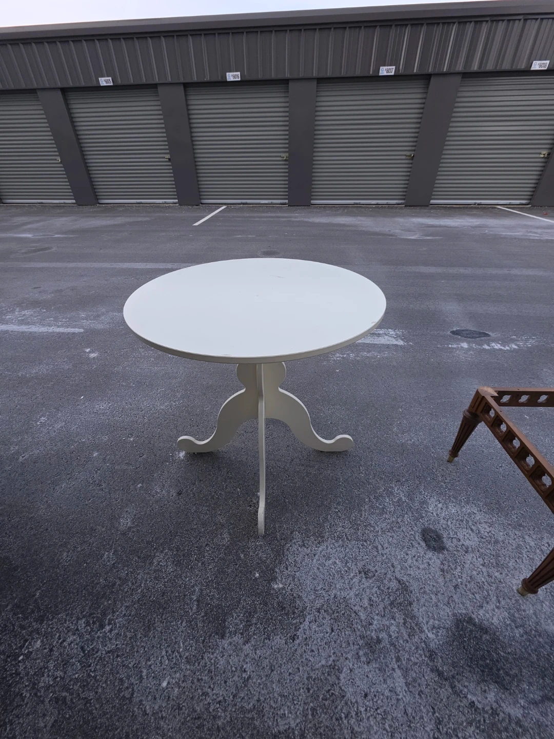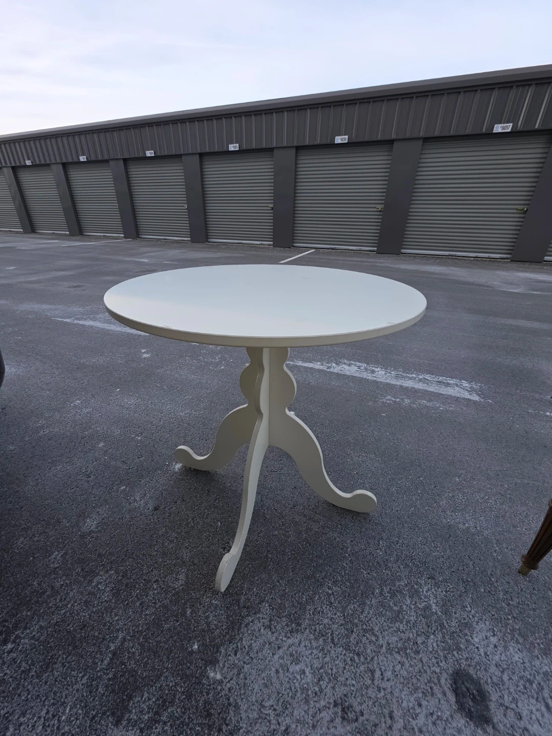 Selling a cute white round accent table! It's perfect for adding a touch of elegance to any room. The table features a classic design with a round top and a stylish pedestal base. It's in great condition and ready to be a lovely addition to your home!