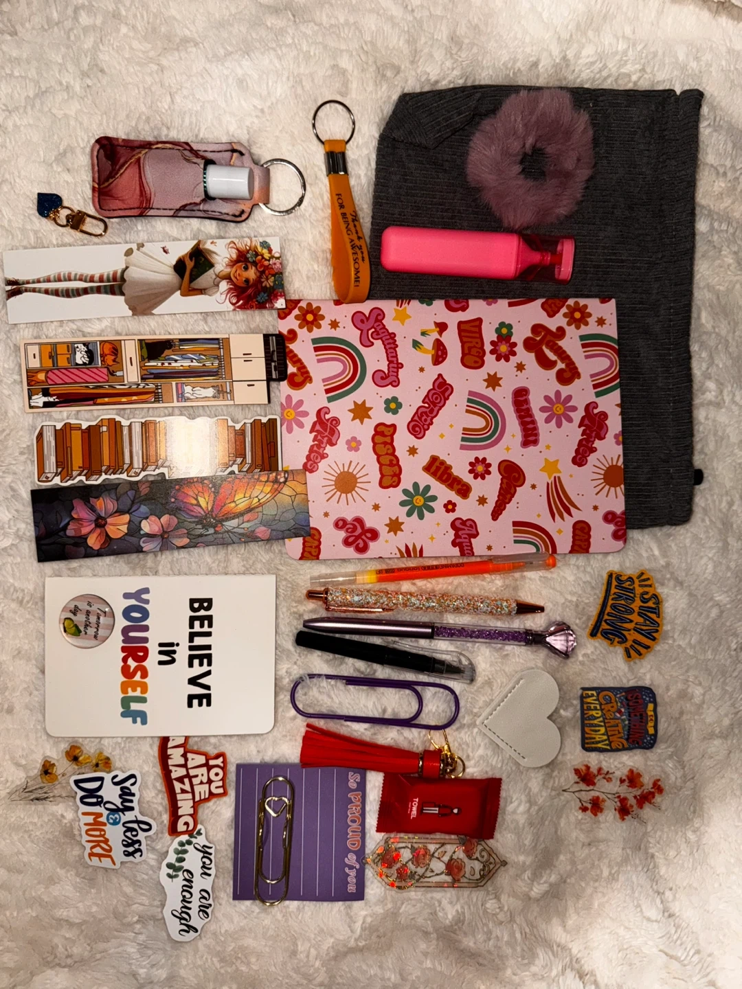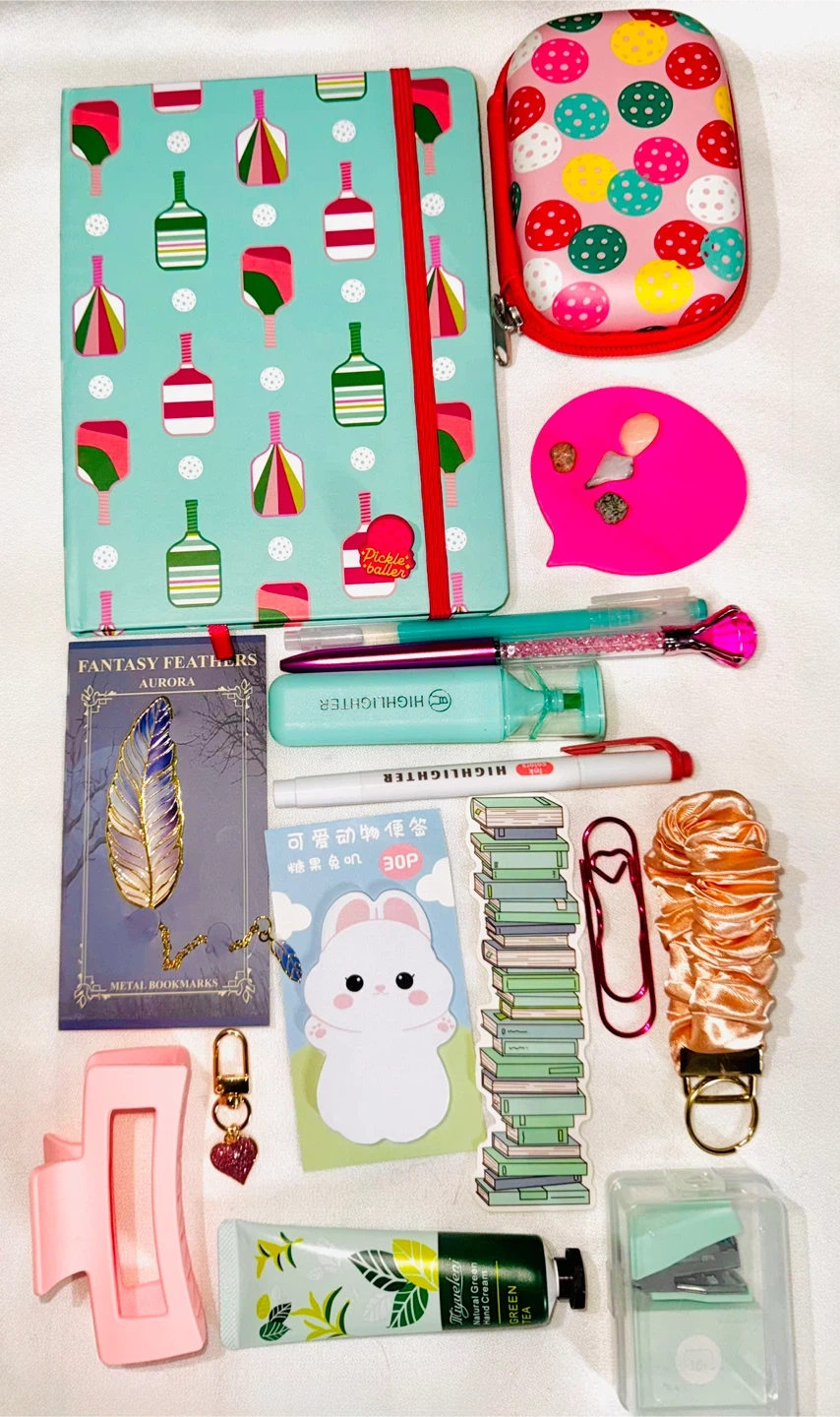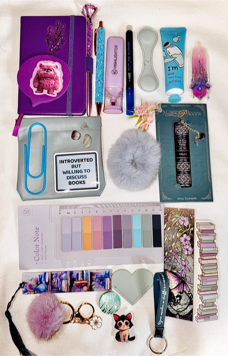 Selling a stationery bundle, perfect for students or anyone who loves to keep organized! Includes notebooks, pens, highlighters, bookmarks, and other fun accessories to brighten up your workspace